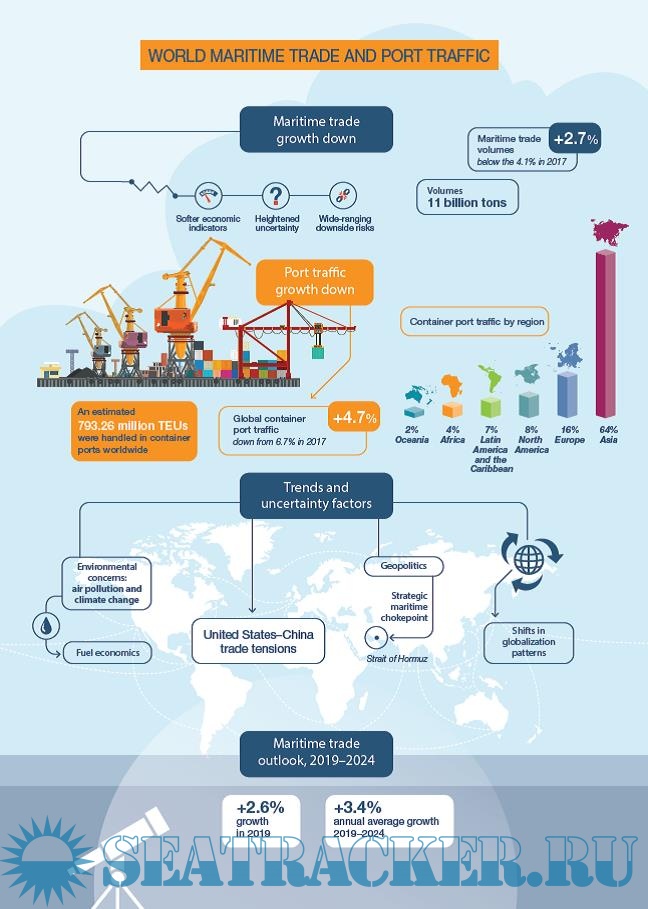 The Maritime transport is the backbone of international trade and the global economy as around 80 per cent of global trade by volume and over 70 per cent of global trade by value are carried by sea and are handled by ports worldwide. Global seaborne trade is doing well, supported by the 2017 upswing in the world economy. Expanding at 4 per cent, the fastest growth in five years, global maritime trade gathered momentum and raised sentiment in the shipping industry. While the prospects for seaborne trade are bright, downside risks such as increased inward-looking policies and the rise of trade protectionism are, nevertheless, weighing on the outlook. An immediate concern is the trade tensions between China and the United States of America, the world’s two largest economies, as well as those between Canada, Mexico, the United States and the European Union. Escalating trade frictions may lead to a trade war that could derail recovery, reshape global maritime trade patterns and dampen the outlook. Other factors driving uncertainty include the ongoing global energy transition, structural shifts in economies such as China, and shifts in global value chain development patterns. If leveraged effectively, game-changing trends, such as digitalization, electronic commerce (e-commerce) and the Belt and Road Initiative, the exact impact of which is yet to be fully understood, have the potential to add wind to the sails of global seaborne trade.