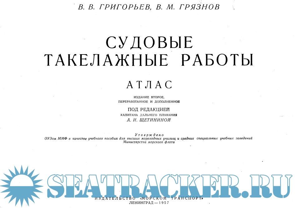 Год выпуска: 1957 Язык: русский Автор: В.В.Григорьев, В.М.Грязнов Жанр: Учебное пособие Издательство: Морской транспорт Издание: Издание второе, переработанное и дополненное Формат: PDF Качество: Отсканированные страницы Количество страниц: 196 Описание: Атлас Судовые такелажные работы содержит материал, позволяющий самостоятельно изучить различные виды такелажных работ, выполняемых на судах морского флота. В Атласе приводятся способы вязания морских узлов, сведения о наиболее распространенных бензелях, сплеснях, огонах, кнопах, а также материалы о плетении матов, изготовлении кранцев, стропов, пластырей, чехлов и т.д. В приложениях к Атласу помещены сведения о такелажных инструментах и приспособлениях. Атлас предназначается в качестве учебного пособия по курсу "Морская практика" для высших и средних учебных заведений морского флота, мореходных школ, а также в качестве практического руководства для плавсостава морских судов.