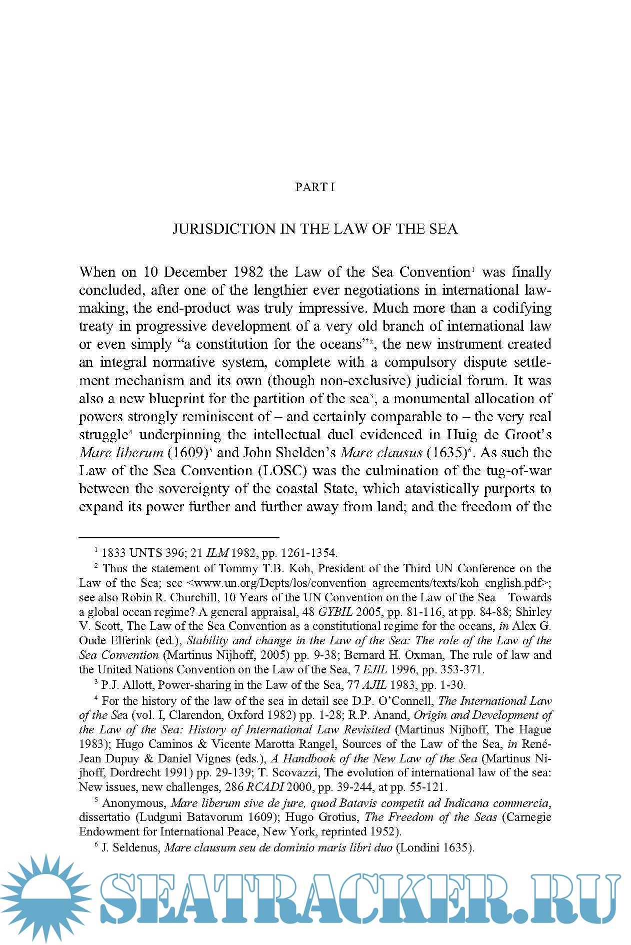 Year: 2007 Language: english Author: Maria Gavouneli Genre: Handbook Publisher: Martinus Nijhoff Publishers ISBN: 978 90 04 16345 4 Format: PDF Quality: eBook Pages count: 305 Description: The Law of the Sea Convention has now reached 25 years of presence in the international scene as a constitution for the oceans. It was the product of a long and arduous negotiation with a final product of delicate balance. The purpose of this book is to examine whether the basic premises and essential compromises of the Convention still hold true or whether the Convention, as a living instrument, has evolved into accommodating new needs and challenges to its regulatory scheme. The vehicle chosen is the jurisdictional interplay between the States, as flag States, coastal States and port States, and the world community at large in matters relating to navigation, fisheries, access to the biological resources of the deep seabed or even maritime security. The result confirms the solid foundations of the Convention and its ability to evolve and expand without upsetting its essential balance. A book useful to all those interested in the law of the sea and the structure of international law.