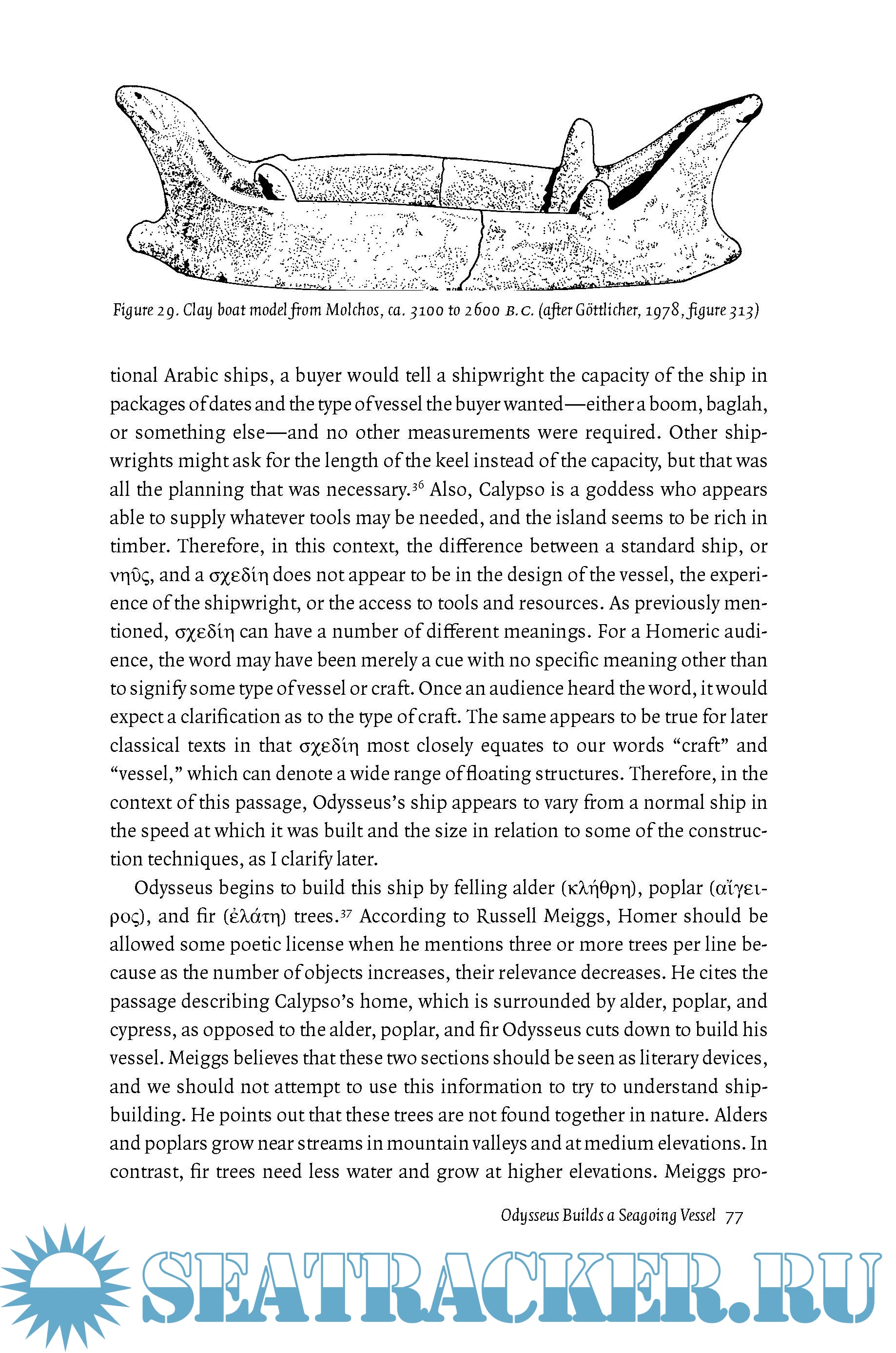 Mark begins by emphasizing the importance of the household during a period in which chiefs ruled and Greek nobles disdained merchants and considered seafaring a necessary but less than distinguished activity. His chapter on Odysseus’s construction of a ship includes discussions of the types of wood used. He concludes that most Greek ships were of laced, rather than pegged mortise-and-tenon construction. Mark goes on to discuss characteristics of Homeric ships and their stern ornaments, oars, quarter rudders, masts, mast-steps, keels, ropes, cables, and planks.