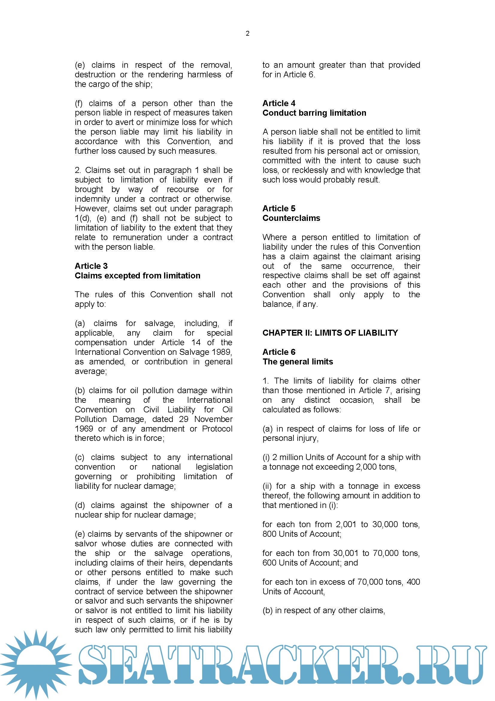 Page : 1 CHAPTER I : Article 1: Persons entitled to limit liability, Article 2: Claims subject to limitation, Page : 2 CHAPTER I : Article 3: Claims excepted from limitation, Article 4: Conduct barring limitation and Article 5: Counterclaims. Page : 2 CHAPTER II: LIMITS OF LIABILITY Page : 5 CHAPTER III: THE LIMITATION FUND Page : 6 CHAPTER IV: SCOPE OF APPLICATION Page : 7 CHAPTER V: FINAL CLAUSES