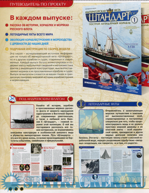 Описание: Для всех, кто увлекается моделизмом, историей и строением кораблей, издательский дом Де Агостини предлагает новую серию еженедельных изданий – «Императорская яхта «Штандарт». На страницах журналов этой серии приводится информация о яхтах российских императоров и королевских парусниках, известных моряках и конструкторах-проектировщиках, интересные факты из истории мореплавания, описание старинных методов навигации и масса другой увлекательной информации. Кроме этого, к каждому журналу серии прилагаются высококачественные детали для сборки модели императорской яхты «Штандарт» в масштабе 1:130