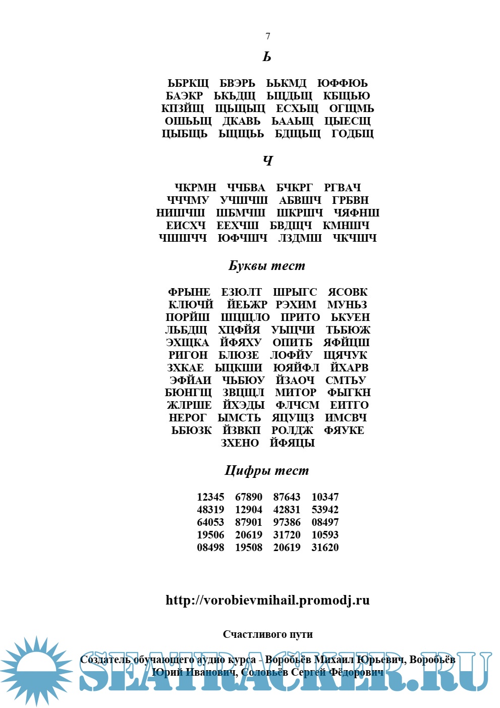 Описание: Первоначальный обучающий материал был создан профессиональным радиолюбителем в 80х годах 20го века Соловьёвым Сергеем Фёдоровичем и записан на магнитофоне «Маяк модель 205» электронным ключом на магнитную ленту. В сентябре 2010 года с магнитной ленты запись была преобразована в электронный вид, отредактирована и дополнена с целью создания простого и удобного обучающего аудио материала для всех желающих.