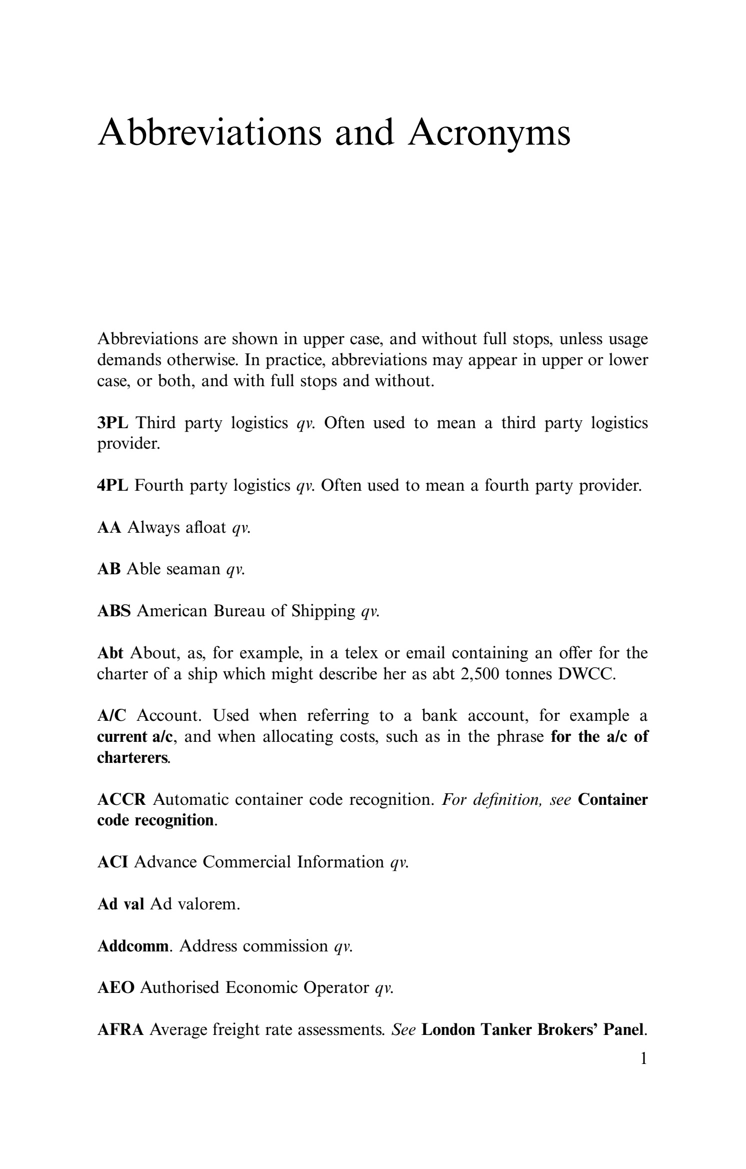 Description: The 6th edition has over 300 new, revised and expanded terms. Major bulk cargoes have been included together with terms relating to the specialist way these commodities are handled and shipped. Equipment used in cargo handling is constantly changing and the new edition reflects this, principally in respect of bulk and conventional cargoes but also container shipping. The book identifies and defines new and revised standard documents, mainly charter-parties and bills of lading, plus a number of new clauses found in charter-parties and bills of lading. New terms found in liner shipping relating to surcharges and other charges have been added. Elsewhere, the book has generally been brought up to date, and the abbreviations section has grown accordingly.