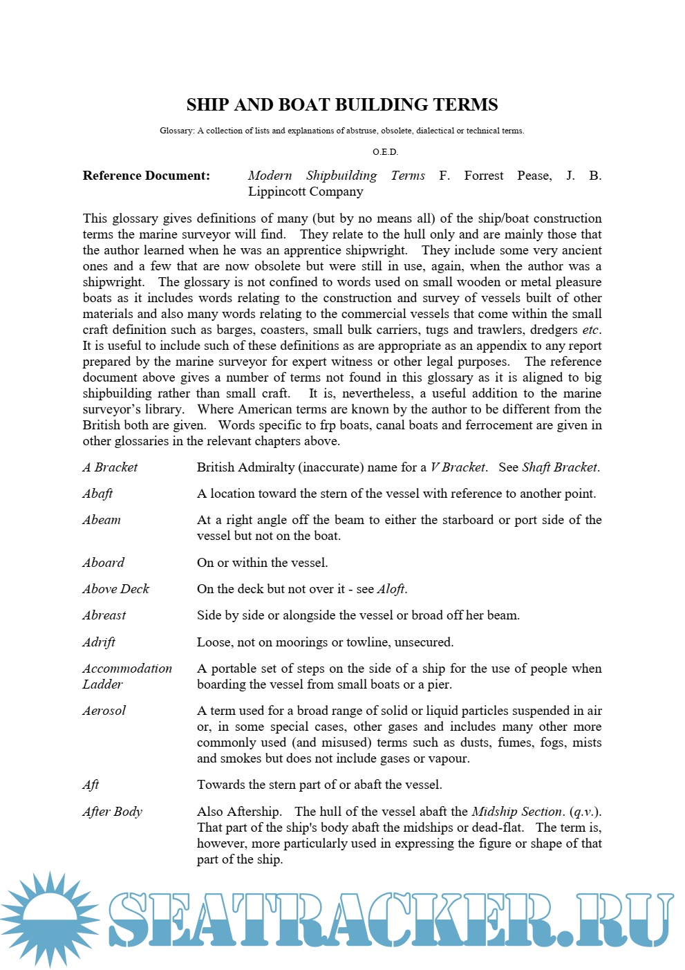 This glossary gives definitions of many (but by no means all) of the ship/boat construction terms the marine surveyor will find. They relate to the hull only and are mainly those that the author learned when he was an apprentice shipwright. They include some very ancient ones and a few that are now obsolete but were still in use, again, when the author was a shipwright. The glossary is not confined to words used on small wooden or metal pleasure boats as it includes words relating to the construction and survey of vessels built of other materials and also many words relating to the commercial vessels that come within the small craft definition such as barges, coasters, small bulk carriers, tugs and trawlers, dredgers etc.