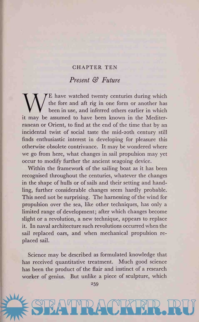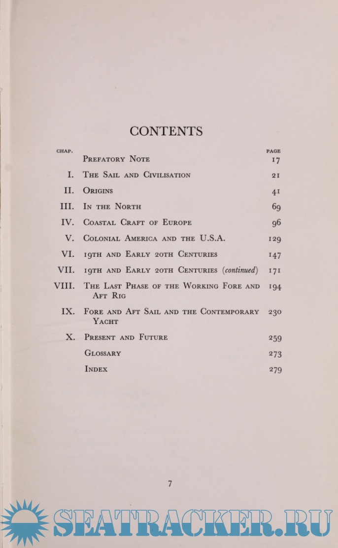 Description: The fore and aft rig is one of the notable inventions of man. It gave him a new power of movement over the face of the earth, and especially in the narrow coastal seas and estuaries adjacent to his dwelling. There is another reason why the study of the evolution appears to be salutary at the present time. We live in an age of what the scientists may call discontinuity in progress. Since the day when the first steam engine ground out its slow revolutions to the present time of quantum physics and nuclear fission, man's control over nature has rushed forward at an ever-accelerating pace. Yet history suggests that man is by nature only fitted to sustain slow advances. In the evolution and diffusion of the fore and aft rig, as in a few other fundamental inventions, we see progress nicely adjusted to what would seem to be the natural tempo of the species. A few centuries pass and the hull form of a boat becomes a little better than it was; details have been added to the rigging; yet all the while much remains unaltered and men are still using something that would not be incomprehensible to those of a thousand years ago.