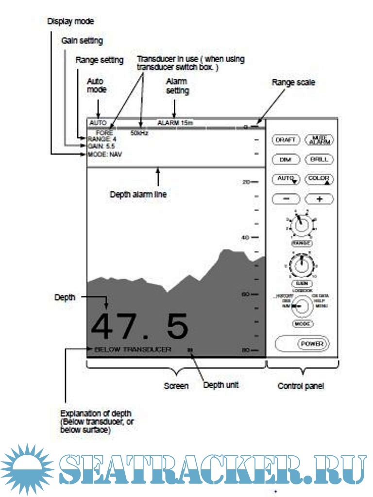 7. Alarms: shallow water, bottom lost, power