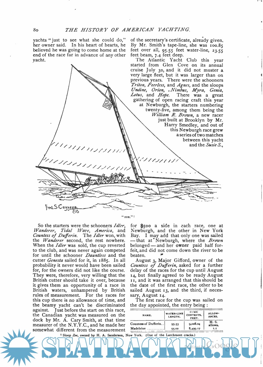 Year: 1887 Language: english Author: Cozzens F.S. Genre: Guide Publisher: Cassell & company, ltd. Format: PDF Quality: Scanned pages Pages count: 168 Description: "Contains a history of American yachting from the early days of the New York Yacht Club to 1885 by Captain R. F. Coffin; the Mayflower and Galatea races of 1886, by Charles E. Clay; American steam yachting, by Edward S. Jaffray; and British yachting, by C. J. C. McAlister. The illustrations are line drawings of famous yachts, with captions telling about their owners" (Toy).