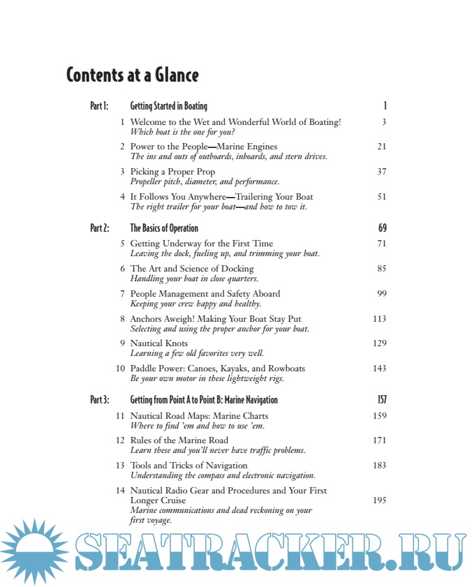 Year: 2002 Language: english Author: Sargeant F. Genre: Guide Publisher: Imprint Unknown ISBN: 978-0028643540 Format: PDF Quality: eBook Pages count: 408 Description: An excellent overview of both power boating and sailing--and focusing on the techniques shared by both. For example, anchoring, motoring, docking, trailering and other techniques are critical for both types of boaters to learn--and the most common techniques omitted by most sailing only books. It also covers weather, safety, maps, rules of the road, dealing with people on the boat, gear, types of boats--power and sailboats and the basics of sailing. New material for this edition will include information on GPS and other marien electronics including wireless mapping and navigation systems, sailboat maintenance from sails to rigging, fuel-savers such as four stroke outboards and HPDI, the latest seasickness cures, advances in PFDs, and getting your captain's license! Additional info: About the Author Frank Sargeant is a well-known boating writer with monthly features in Boating magazine and Sports Afields magazine. He writes a weekly award-winning column on boating in the Tampa Tribune and has been a local favorite in Florida for 40 years. He has written 10 books on boating, sailing, and fishing.