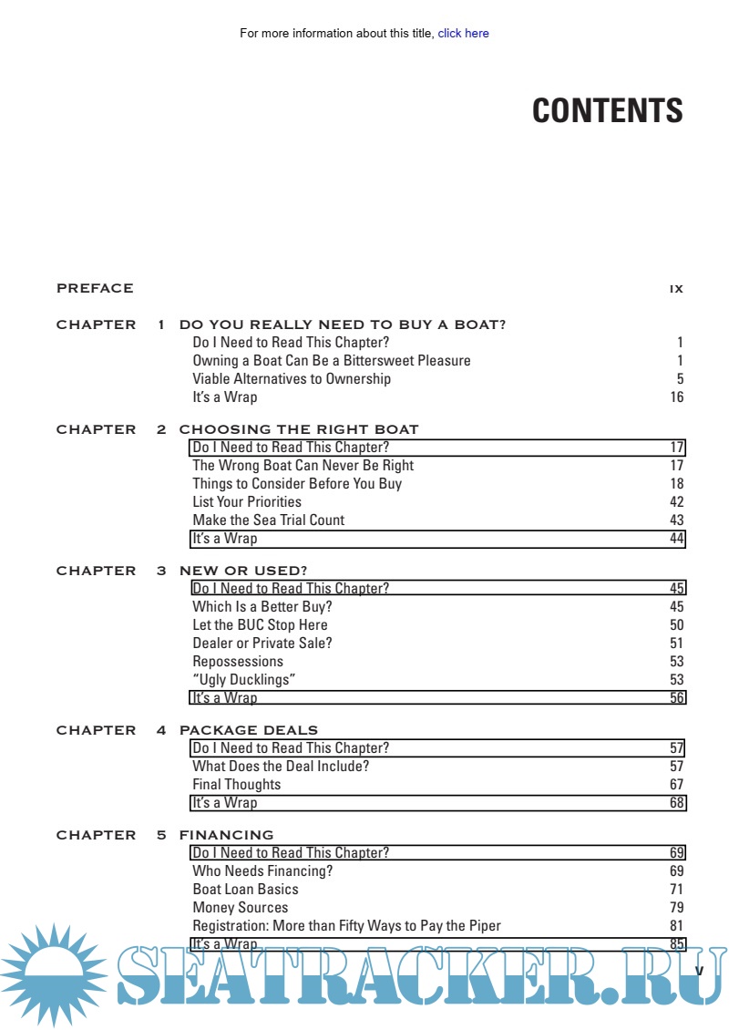 Year: 2008 Language: english Author: Armstrong R. Genre: Manual Publisher: International Marine/McGraw-Hill ISBN: 0071496734 Format: PDF Quality: eBook Pages count: 224 Description: Navigate the hazards of boat ownership with absolute confidence Next to your house, your boat may well be the biggest investment you ever make. Buying and owning a boat involves one baffling decision after another. Yet informed, impartial guidance is almost impossible to find-until now, that is. This essential manual provides a method to the madness of boat buying and ownership, plotting a straight course through an ocean of confusion while it answers such questions as: Why fractional ownership often makes sense How to avoid buying a boat you'll never use How to identify the Goldilocks boat-not too big, not too small How to choose a powering option How to negotiate the best deal on any boat-new or used How to be your own surveyor, and why even a new boat may need a professional survey Why you should finance your boat even if you have the cash, and where to find the best loans How to calculate the total cost of ownership before you buy.
