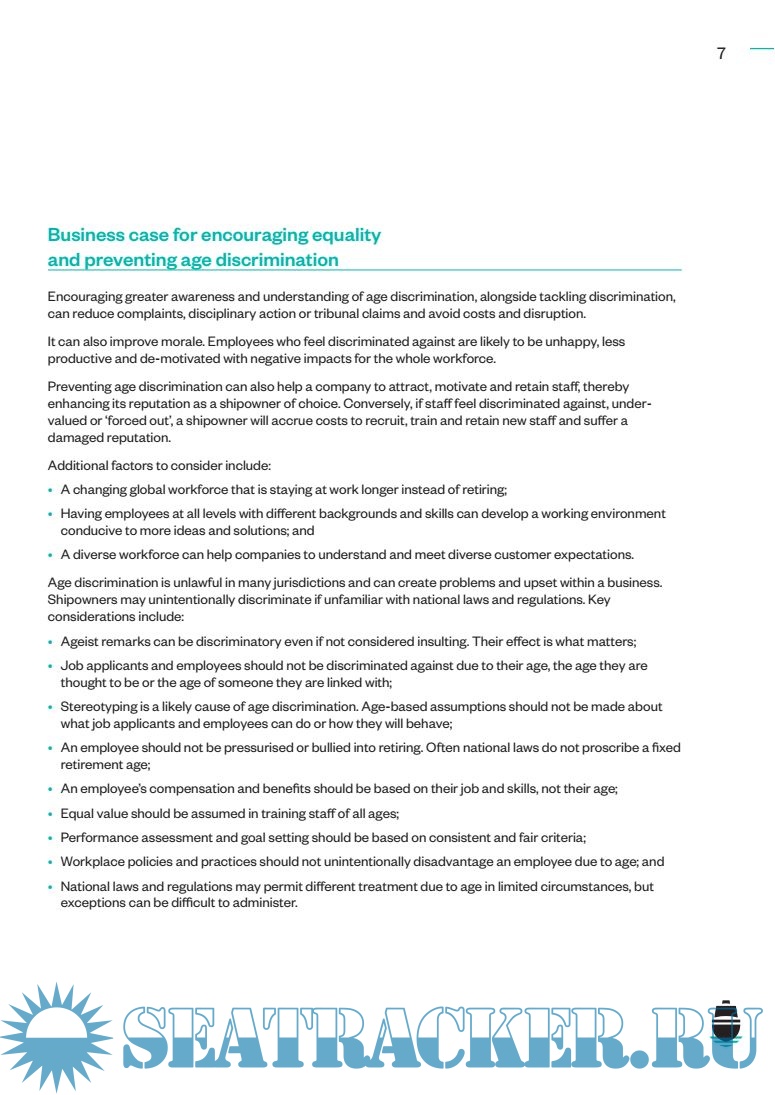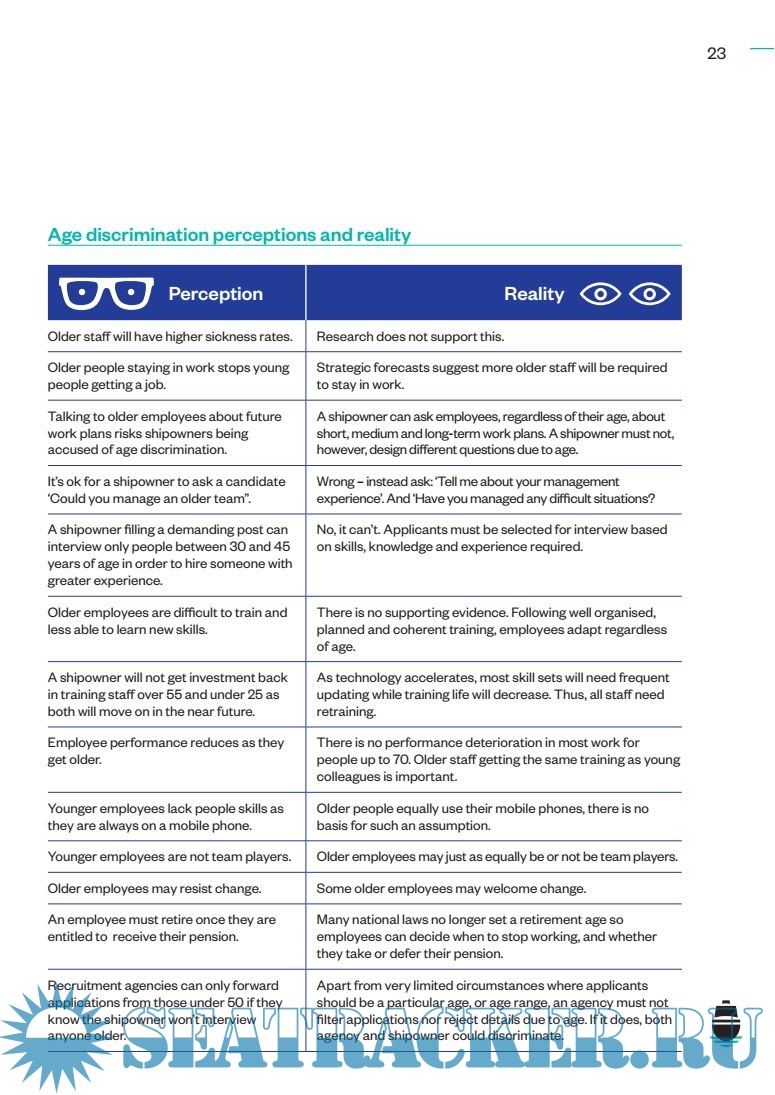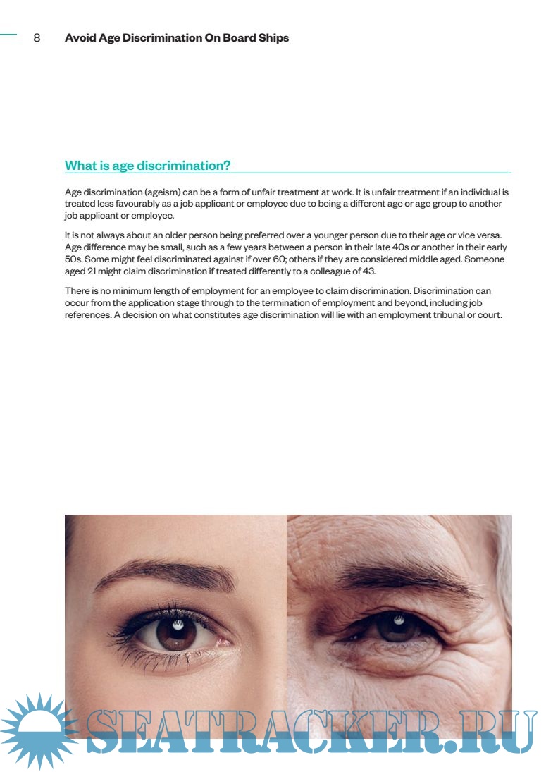 Description: This guidance has been produced to help to eliminate age discrimination and to improve the working environment on board ships. Age discrimination (ageism) is a potential form of unfair treatment at workgiven that the age gap between employees in the workplace can now be as much as 50 years.