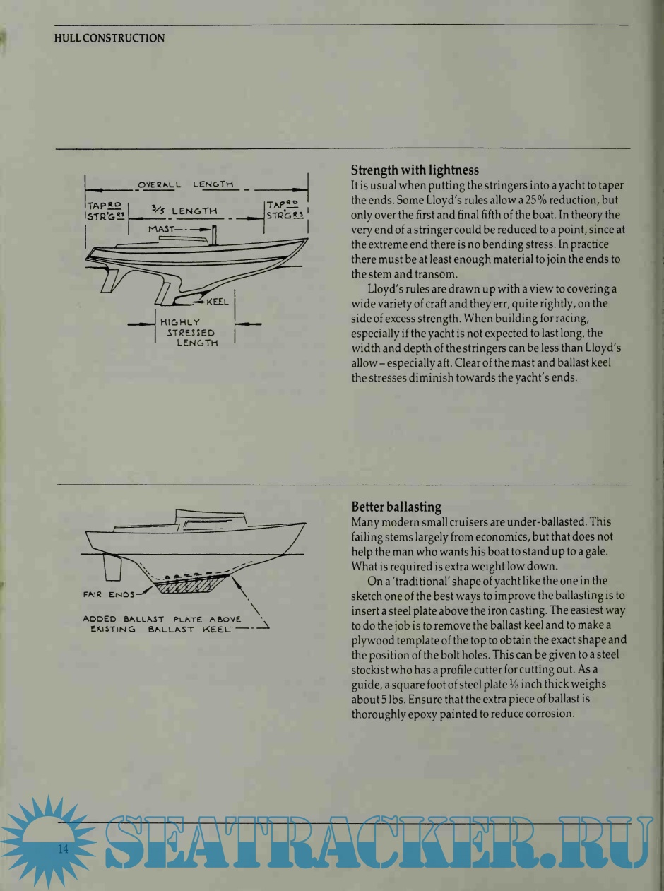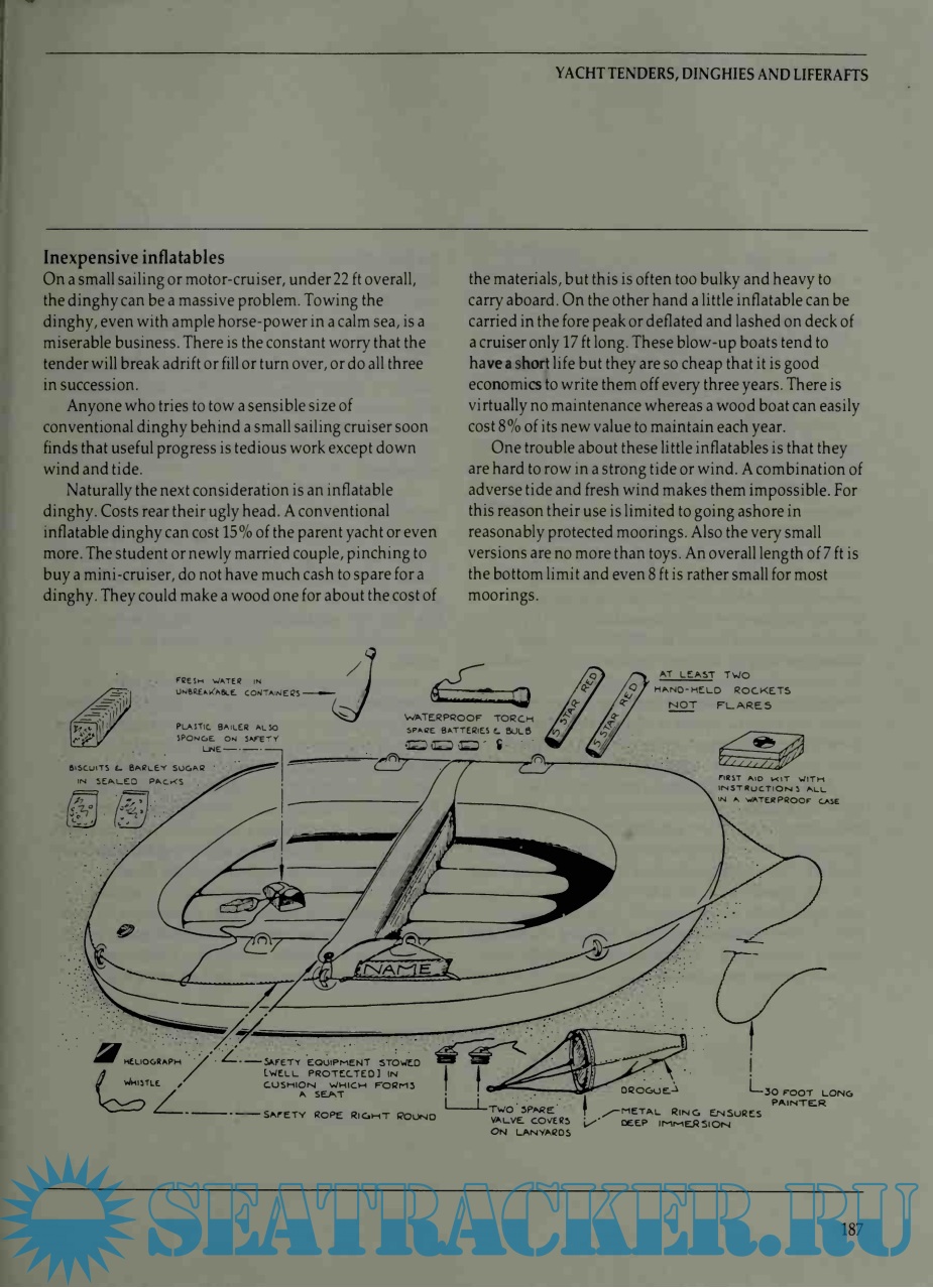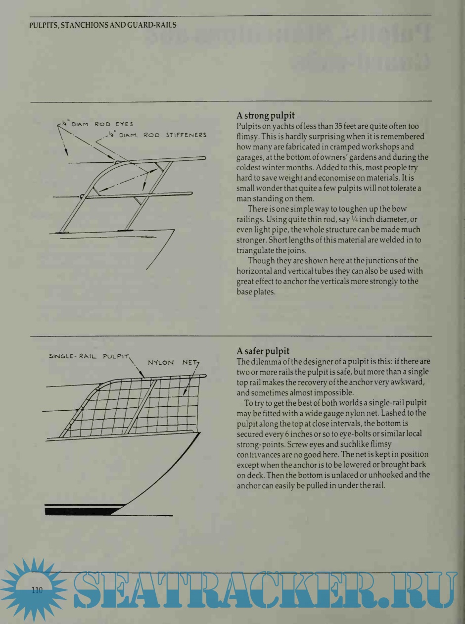 Year: 1987 Language: english Author: Nicolson I. Genre: Manual Publisher: Adlard Coles Publishing ISBN: 0229118011 Format: PDF Quality: Scanned pages Pages count: 208 Description: Bright ideas cure problems. Sometimes the use of a brain wave occurs generations after the first flash of ingenuity sparks the concept. My father invented 'flight refuelling' in 1927, but it only truly came into its own during the Falklands War, in 1982, and he died in 1947. Boats generate problems faster than anything except perhaps cars and aeroplanes. However, people who go afloat are ingenious, and some of the ways they overcome difficulties are shown in this book... and in other comparable books I have written. We are all in debt to the owners, builders, designers, draughtsmen, foremen, charge hands, riggers, sailmakers, mast-makers — the list is endless — who have dreamed up the gadgets and tricks shown here. It is not fair to name anyone because so often a gadget appears in two widely separated places at the same time. I'm sure there was a startled look from some stone-age man as he rounded the bend of the river Euphrates in his log canoe, a million years ago, and saw to his intense irritation that some other fellow had also thought up the idea of borrowing his wife's wolf-skin, and setting it as a sail. Not all ideas work well. When we all had solid wood masts, and it was getting difficult to find long straight trees, someone came up with the 'tubular join'. They got the conception from studying fishing rods which were made up from pieces of wood held together by short sections of piping. The idea of making up a long thin elegant mast from two quite short trees and a few feet of bronze tubing seemed brilliant. It worked for a few years, but the trouble was that water seeped in and caused hidden rot inside the tube. This sort of mast tended to break at extraordinary times, when there was hardly any wind and just enough swell to cause the yacht to pitch and make the mast whip. The saddest tale of failed ingenuity comes from the cruising world. A family wanted to go off for a week's holiday, and could not take their goldfish with them. So they set the goldfish bowl under the telephone bell, which was one of the old-fashioned sort, on the wall, with an external clapper. This clapper vibrates against the bell when the phone rings. They tied a packet of fish-food to the bell clapper, and cut a small hole in the bottom of the packet. Then every time the phone rang, the clapper shook some fish food into the bowl below. Now all they had to do was to phone home each day from wherever they were, and the goldfish would automatically be fed. What they had not bargained for was that a friend phoned them the first day they were away. As the phone was not answered, he tried again an hour later, and again after another hour, and again... and again... and again. And so the goldfish became bloated with food that first day, but died of starvation before the end of the week. So it does pay to develop gadgets, and not expect total success right away. The drawings in this book are for the most part not dimensioned because the size of anything made will depend on the size of the boat it is to fit. What never changes is the need for excellent materials and fastenings. The cost of good glassfibre or stainless steel or varnish is little more than the shoddiest type; and the cost of materials is only a small percentage of the total cost. My thanks are due to the owners, editor and staff of Yachts and Yachting, where many of these drawings first appeared.