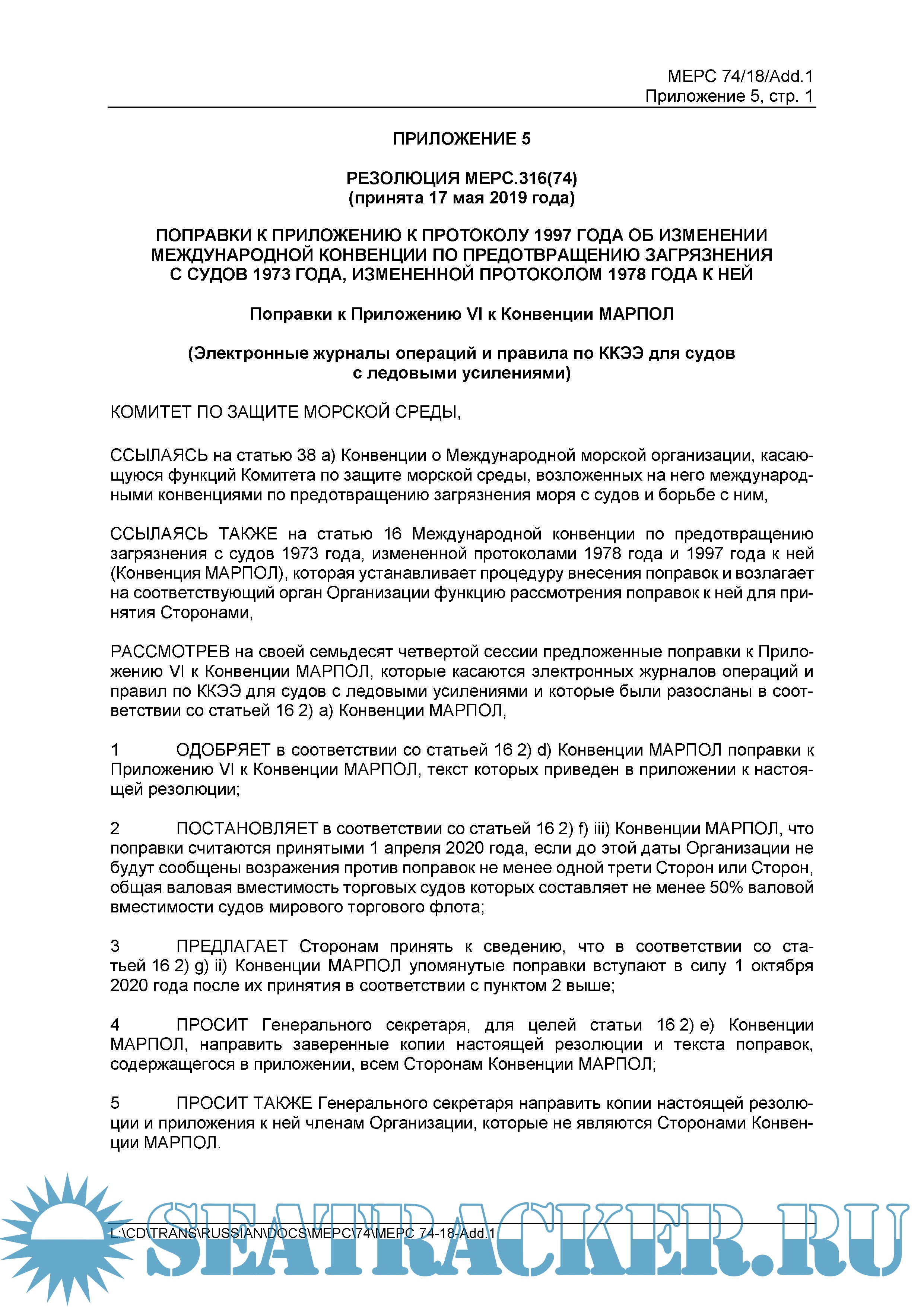 Поправки к Приложению к Протоколу 1997 года об изменении Международной Конвенции по Предотвращению Загрязнения с судов 1973 года, измененной Протоколом 1978 года к ней (Резолюция MEPC.316(74)) = Amendments to the Annex of the Protocol of 1997 to Amend the International Convention for the Prevention of Pollution from ships, 1973, as modified by the Protocol of 1978 relating thereto (Resolution MEPC.316(74))