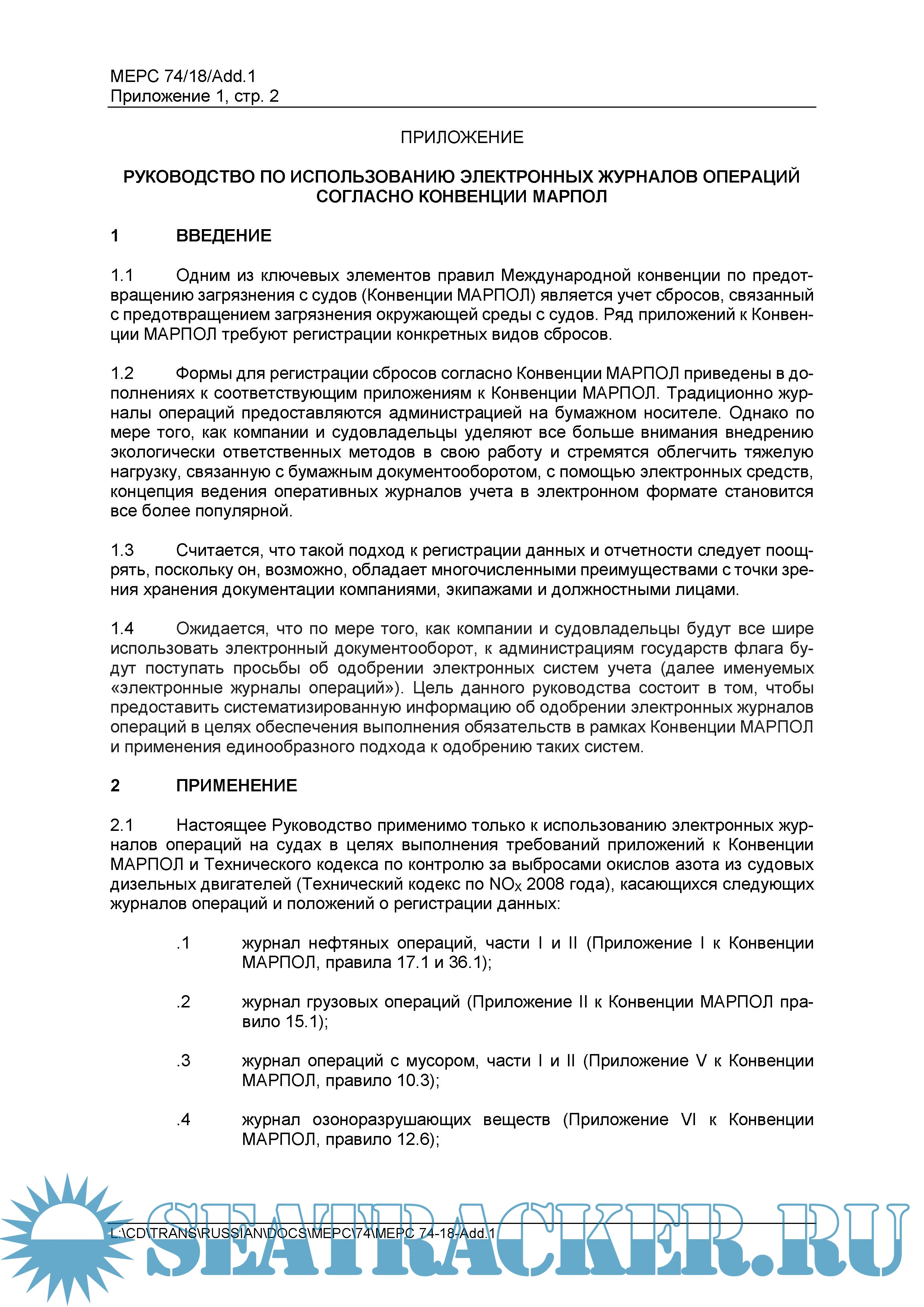 Год выпуска: 2019 Язык: русский Автор: ИМО КЗМС (MEPC) Жанр: Руководство Издательство: International Maritime Organization Формат: PDF Качество: Неизвестно Количество страниц: 12 Описание: Руководство по использованию электронных журналов операций согласно Конвенции МАРПОЛ (Резолюция MEPC.312(74)) = Guidelines for the use of Electronic Record Books under MARPOL (Resolution MEPC.312(74)) Доп. информация: СОДЕРЖАНИЕ 1 ВВЕДЕНИЕ 2 ПРИМЕНЕНИЕ 3 ОПРЕДЕЛЕНИЯ 4 СИСТЕМНЫЕ СПЕЦИФИКАЦИИ 5 ДЕКЛАРАЦИЯ 6 ИНСПЕКЦИОННЫЕ ПРОВЕРКИ И ОБЕСПЕЧЕНИЕ СОБЛЮДЕНИЯ ТРЕБОВАНИЙ КОНВЕНЦИИ МАРПОЛ ДОПОЛНЕНИЕ. ОБРАЗЕЦ ДЕКЛАРАЦИИ