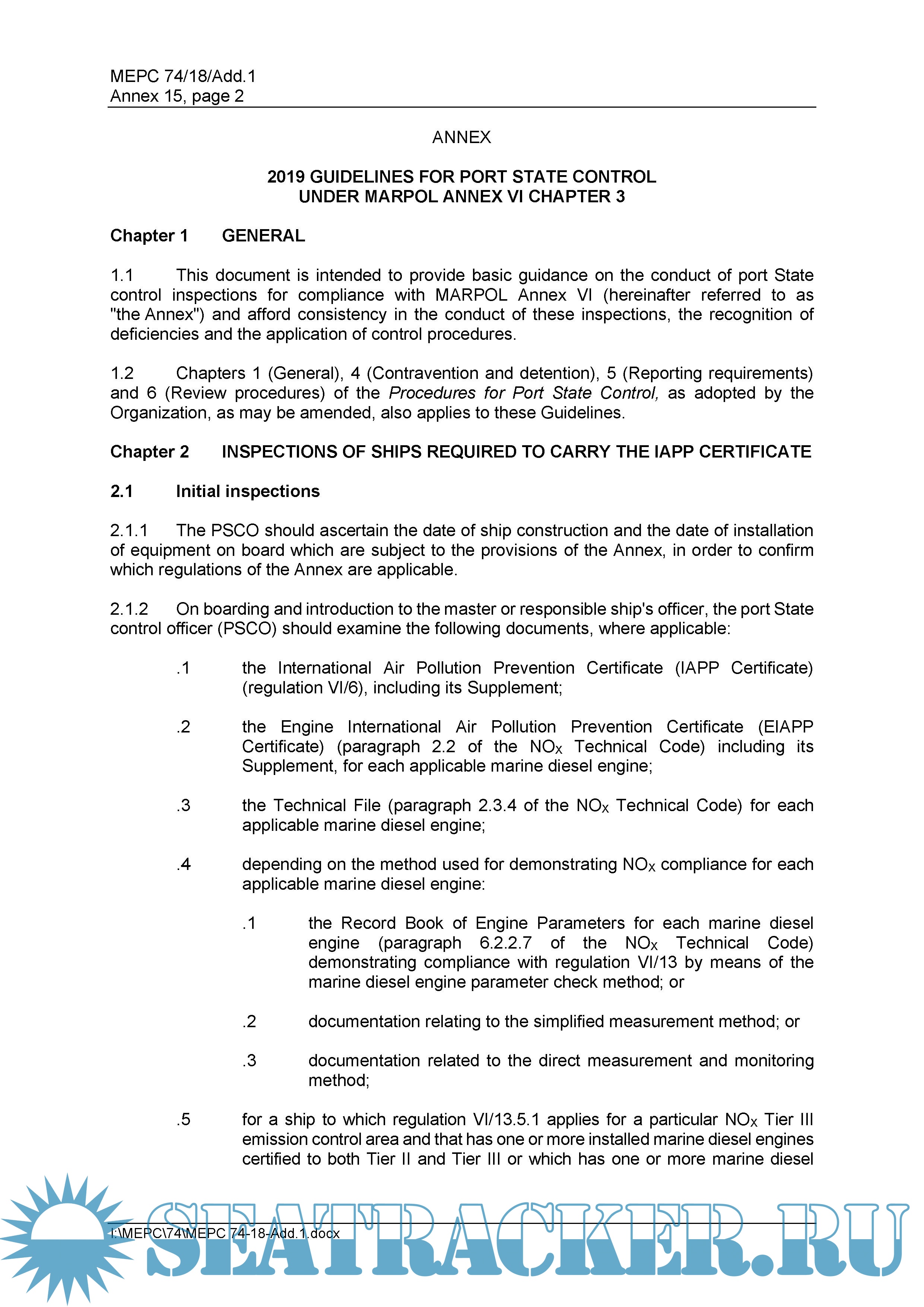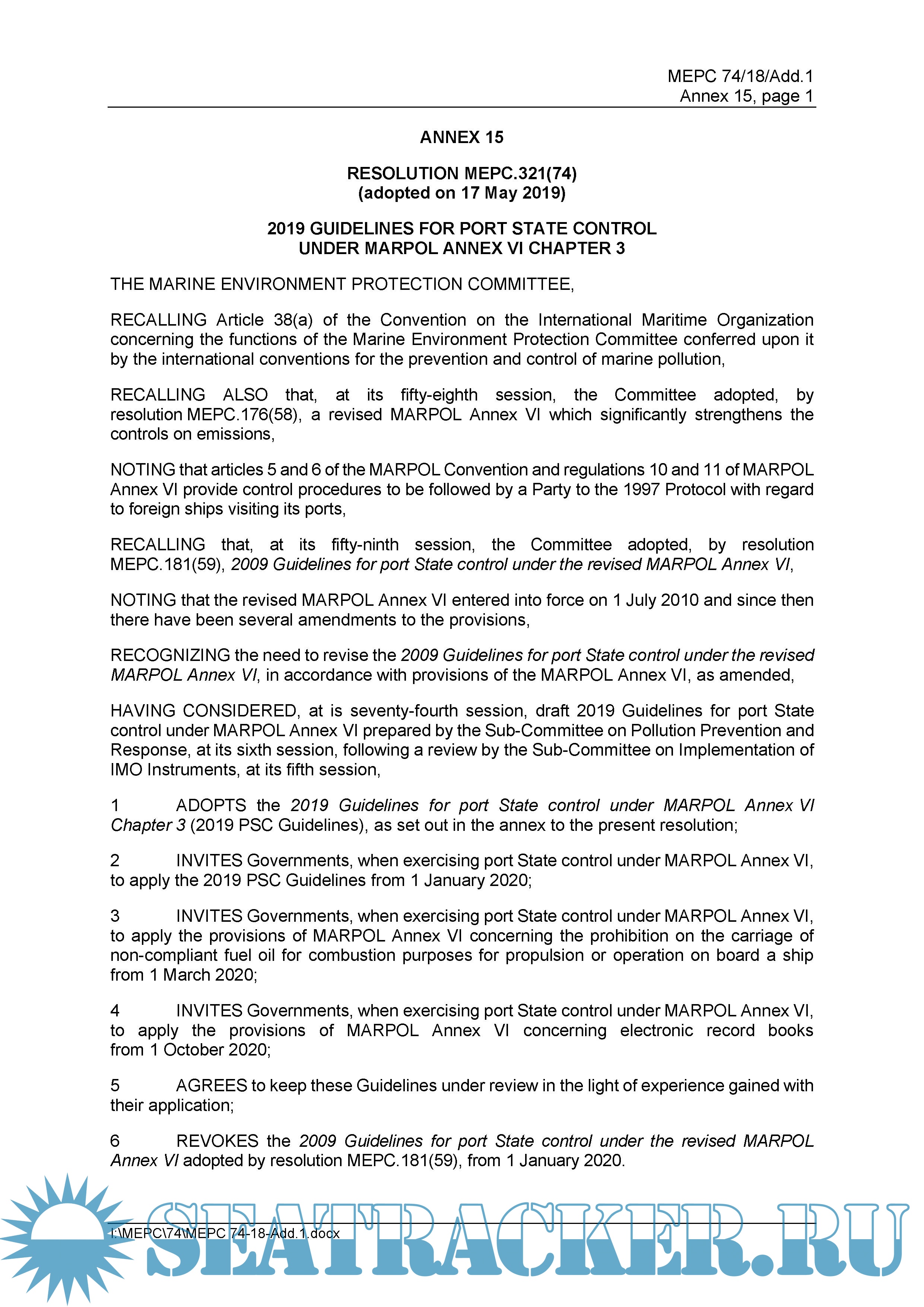Year: 2019 Language: english Author: IMO MEPC Genre: Guide Publisher: International Maritime Organization Format: PDF Quality: Unknown Pages count: 13 Description: 2019 Guidelines for Port State Control under MARPOL Annex VI Chapter 3 (Resolution MEPC.321 (74)) RESOLUTION MEPC.321 (74) (adopted on 17 May 2019) 2019 GUIDELINES FOR PORT STATE CONTROL UNDER MARPOL ANNEX VI CHAPTER 3 THE MARINE ENVIRONMENT PROTECTION COMMITTEE, RECALLING Article 38(a) of the Convention on the International Maritime Organization concerning the functions of the Marine Environment Protection Committee conferred upon it by the international conventions for the prevention and control of marine pollution, RECALLING ALSO that, at its fifty-eighth session, the Committee adopted, by resolution MEPC.176(58), a revised MARPOL Annex VI which significantly strengthens the controls on emissions, NOTING that articles 5 and 6 of the MARPOL Convention and regulations 10 and 11 of MARPOL Annex VI provide control procedures to be followed by a Party to the 1997 Protocol with regard to foreign ships visiting its ports, RECALLING that, at its fifty-ninth session, the Committee adopted, by resolution MEPC.181(59), 2009 Guidelines for port State control under the revised MARPOL Annex VI, NOTING that the revised MARPOL Annex VI entered into force on 1 July 2010 and since then there have been several amendments to the provisions, RECOGNIZING the need to revise the 2009 Guidelines for port State control under the revised MARPOL Annex VI, in accordance with provisions of the MARPOL Annex VI, as amended, HAVING CONSIDERED, at is seventy-fourth session, draft 2019 Guidelines for port State control under MARPOL Annex VI prepared by the Sub-Committee on Pollution Prevention and Response, at its sixth session, following a review by the Sub-Committee on Implementation of IMO Instruments, at its fifth session, 1 ADOPTS the 2019 Guidelines for port State control under MARPOL Annex VI Chapter 3 (2019 PSC Guidelines), as set out in the annex to the present resolution; 2 INVITES Governments, when exercising port State control under MARPOL Annex VI, to apply the 2019 PSC Guidelines from 1 January 2020; 3 INVITES Governments, when exercising port State control under MARPOL Annex VI, to apply the provisions of MARPOL Annex VI concerning the prohibition on the carriage of non-compliant fuel oil for combustion purposes for propulsion or operation on board a ship from 1 March 2020; 4 INVITES Governments, when exercising port State control under MARPOL Annex VI, to apply the provisions of MARPOL Annex VI concerning electronic record books from 1 October 2020; 5 AGREES to keep these Guidelines under review in the light of experience gained with their application; 6 !!! REVOKES !!!the 2009 Guidelines for port State control under the revised MARPOL Annex VI adopted by resolution MEPC.181(59) (see https://seatracker.info/viewtopic.php?t=1181), from 1 January 2020 Additional info: MEPC 74/18/Add.1/Corr.1 (11 September 2019) REPORT OF THE MARINE ENVIRONMENT PROTECTION COMMITTEE ON ITS SEVENTY-FOURTH SESSION Corrigendums for Resolution MEPC.321 (74): Paragraph 2.6.4 of the annex is replaced by the following: "2.6.4 The PSCO should pay attention to the record required in regulation VI/14.6 in order to identify the sulphur content of fuel oil used by the ship depending on the area of trade, or that other equivalent approved means have been applied as required, the fuel oil consumed in and outside ECA, and that there is enough fuel in compliance with regulation VI/14 to reach the next port destination." Paragraph 2.7.2.8 of the annex is replaced by the following: ".8 the master or crew are not familiar with essential procedures regarding the operation of air pollution prevention equipment as defined in paragraph 2.6.12 above."