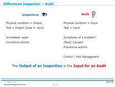 Description: Effective implementation and verification of a (safety) management system require periodical internal audits. The approach to and scope of an audit differs widely from an inspection.