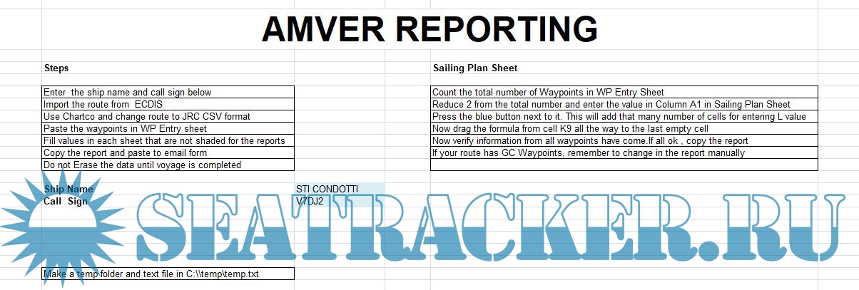Description: This is a program I made to make AMVER reporting easier. Just export the route from ECDIS into csv fromat , paste it in excel , add a few necessary details and press the button. Thats all you have to do. I made it because I have seen second mates spending a lot of time for making AMVER report.