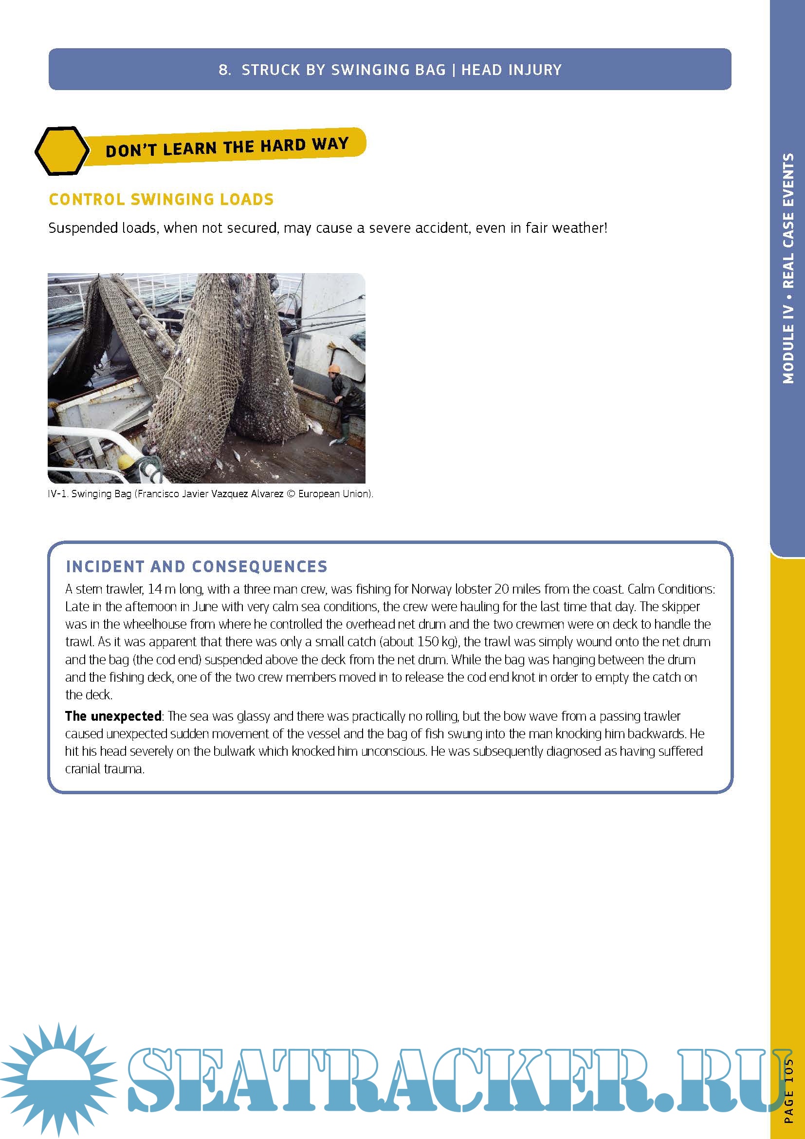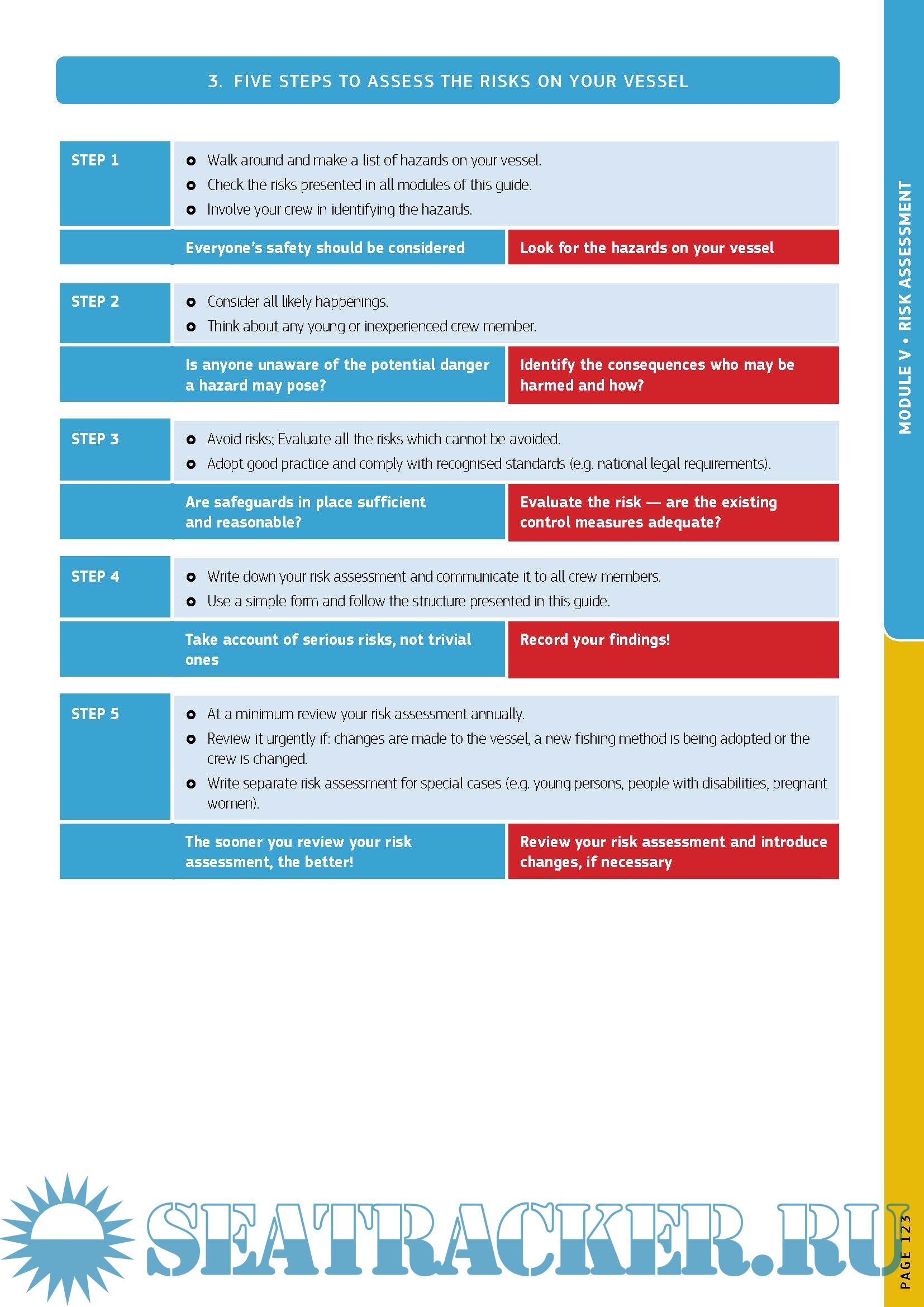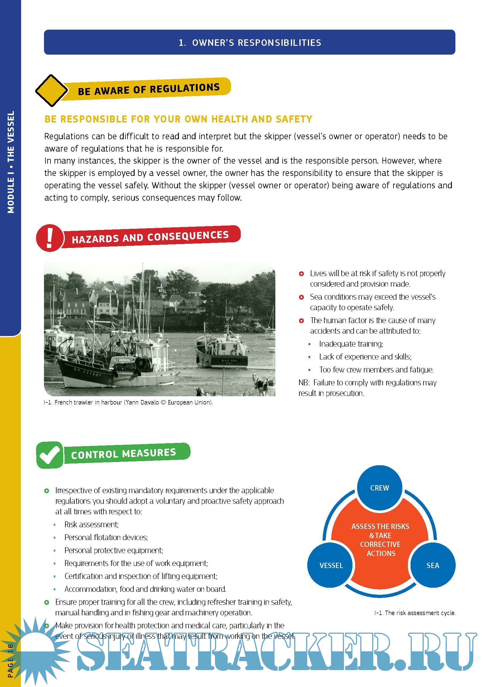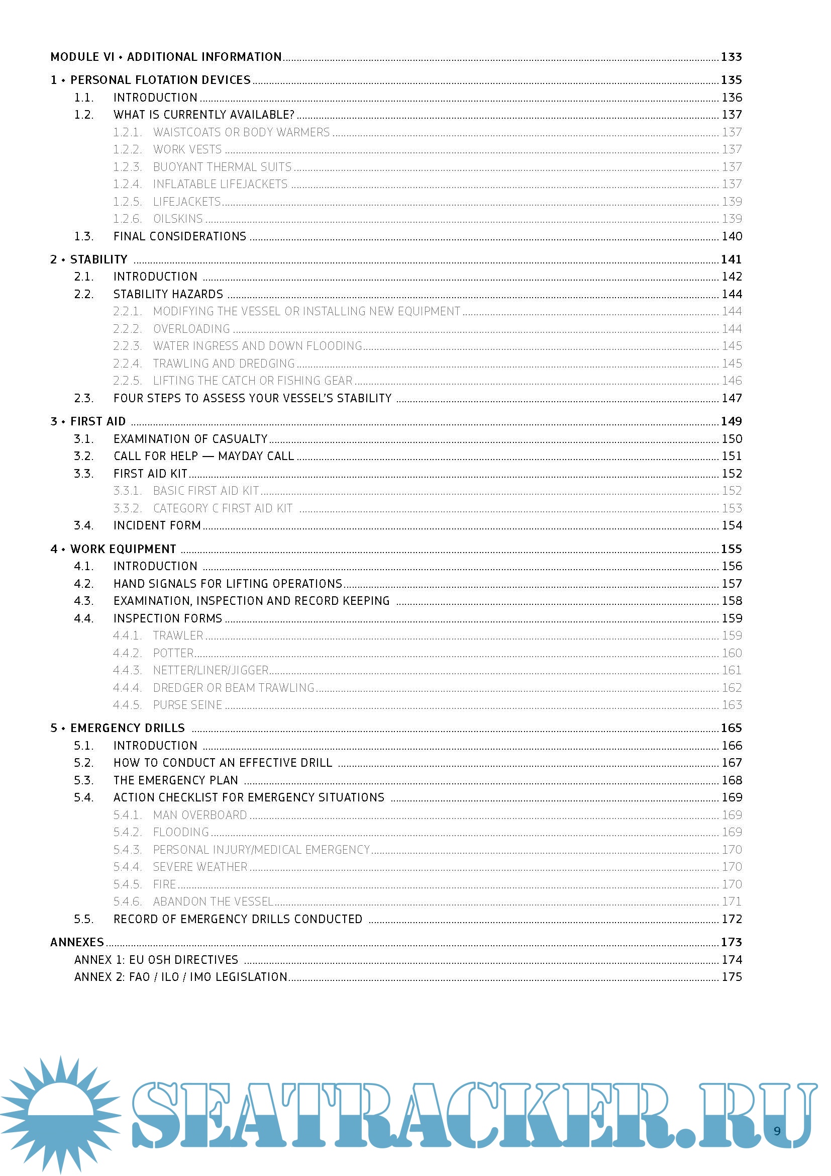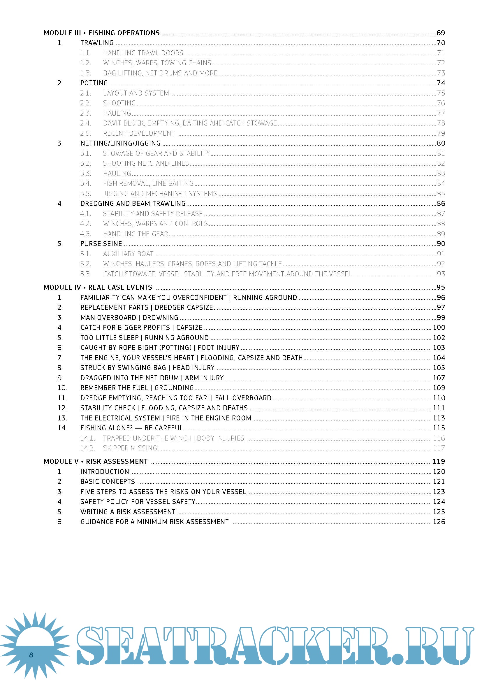 The different modules in the guide focus on key areas, notably the vessel, the crew, fishing operations, real case events, risk assessment and additional information such as on flotation devices, boat stability, first aid, work equipment and emergency drills. A glossary along with illustrations, photos and charts serve to highlight the important points in the guide, making it an extremely user-friendly reference.