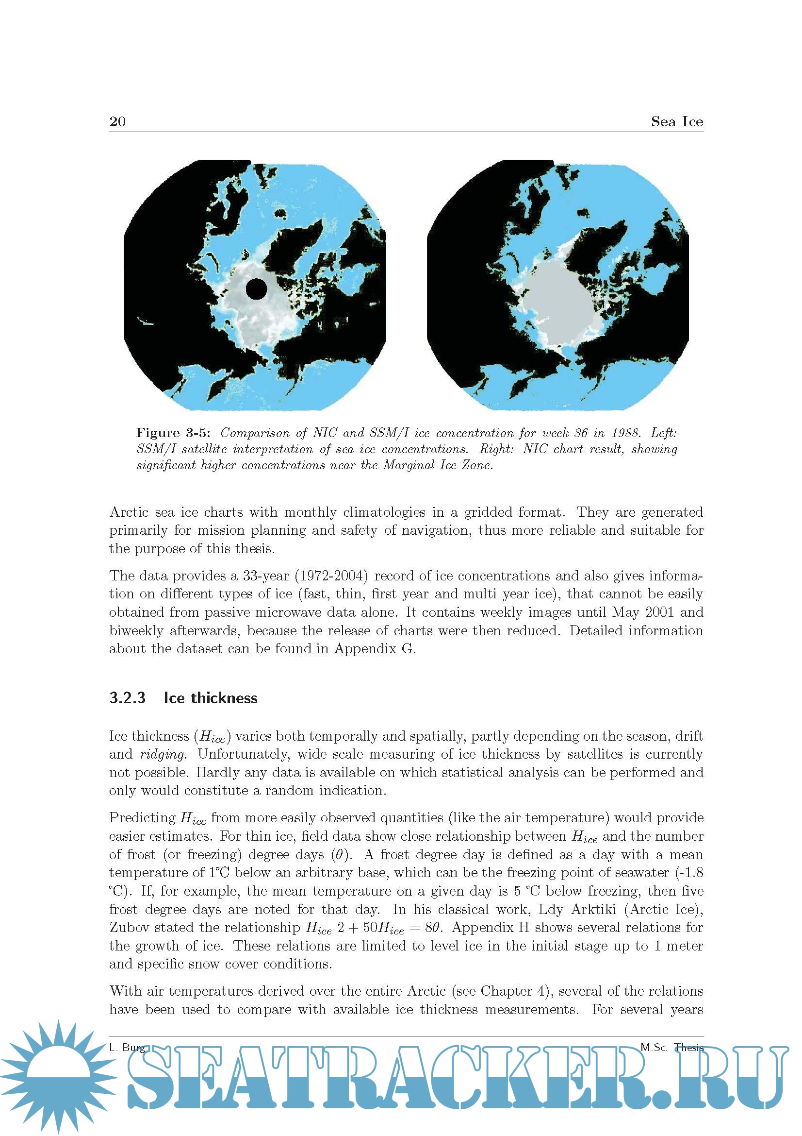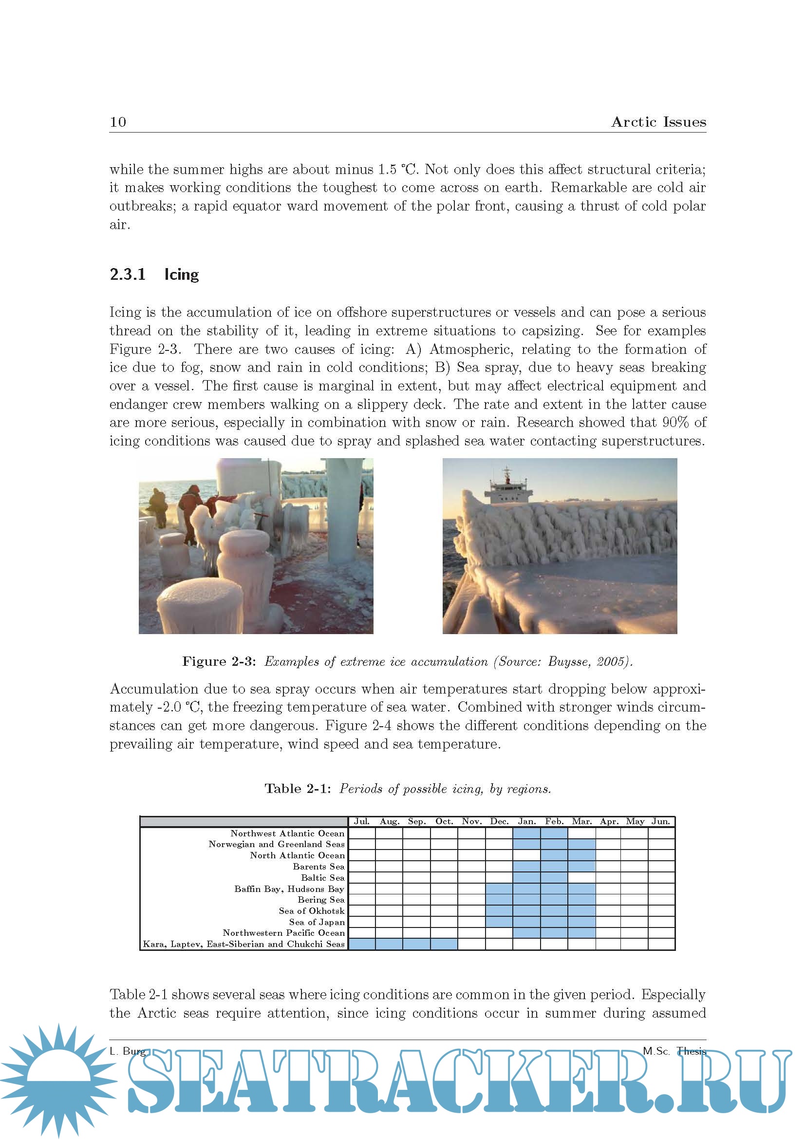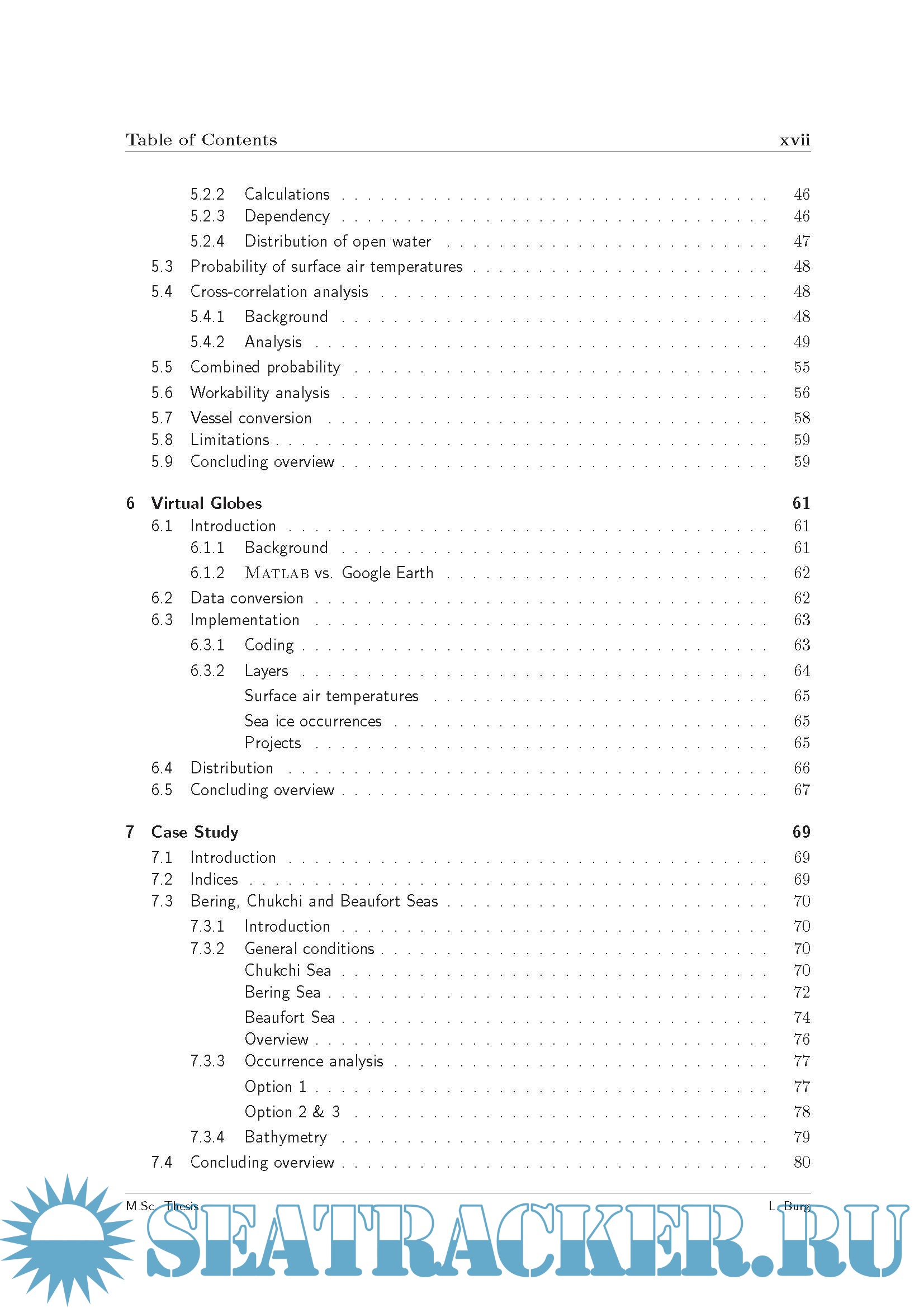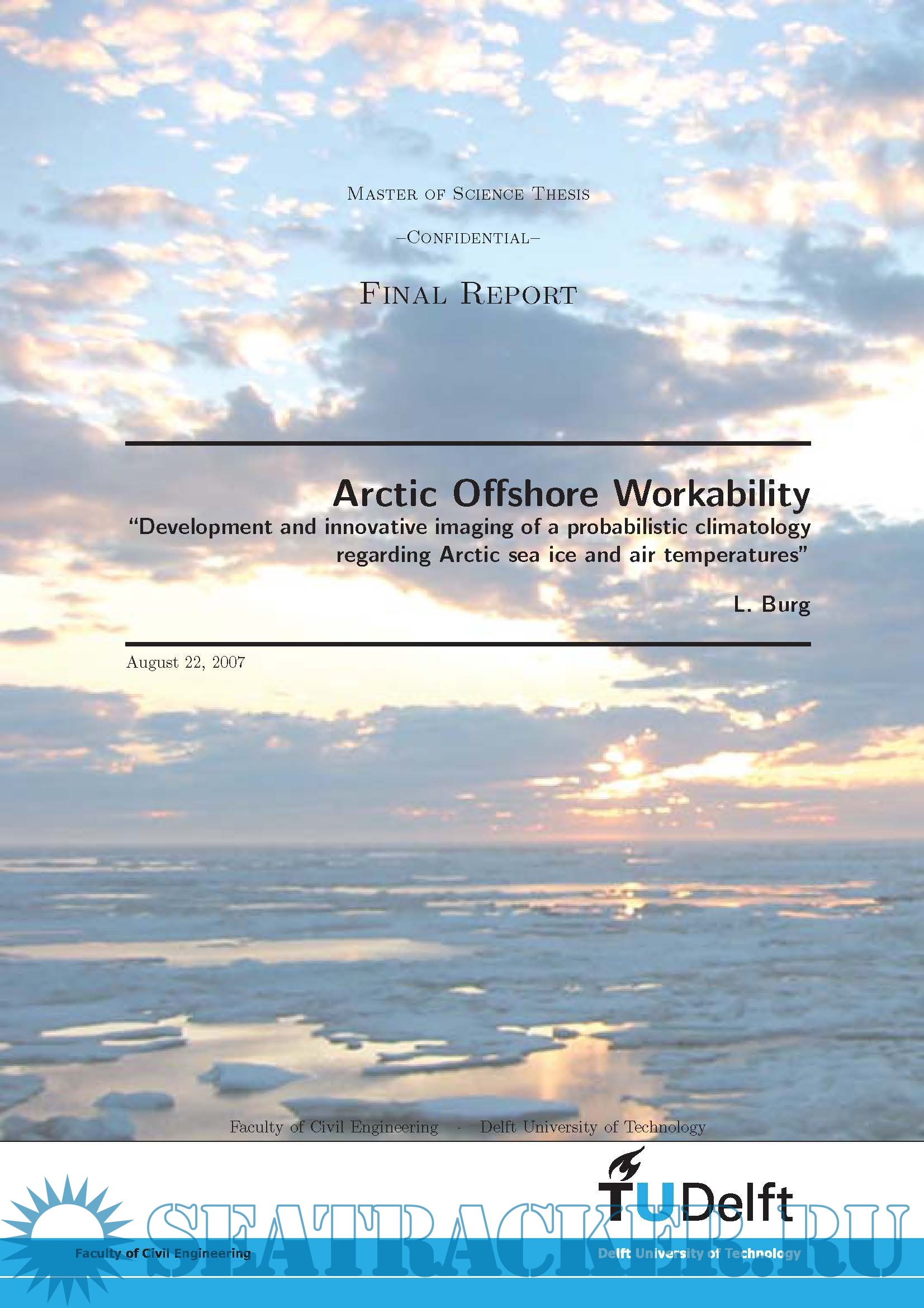 Description: Studies underscore the significant reserve potential of the Arctic region: an estimated 25 percent of potential oil and gas reserves, onshore and offshore, is believed to be located in the Northern Hemispheres Arctic region. Although these areas already have been under consideration for over 30 years, technical difficulties have put a threshold on these developments. Natural conditions like low visibility, extreme colds and ice make it nearly impossible to navigate and therefore restrict workability immensely. The thesis focuses on the occurrences of certain concentrations of sea ice, air temperatures and their combined events. Based on these findings a probabilistic approach allows the definition of risk features over defined spatial and temporal domains. Such results will allow a-priori project management for safe Arctic navigation and pipelay operations regarding the conditions under consideration. The probabilities of occurrence for sea ice concentrations above 0% and 30% have been determined by calculating the relative frequency over 33 years. To analyze the effect of air temperatures and ice existence on navigability and operability, occurrences of both surface air temperatures and sea ice have been determined. The combined events include: - Thresholds for surface air temperatures. * -15 Celsius, current structural limit; * -40 Celsius, designated structural limit; * -5 Celsius, where icing may start to form. - Thresholds for ice concentrations. * 0% ice concentration, current structural limit; * 30% ice concentration, assumed allowed conditions with ice classification. Results have been visualized on a virtual globe with Google Earth. Layers, which can be controlled over time, and display occurrences of all analyzed conditions as well as surface air temperatures.