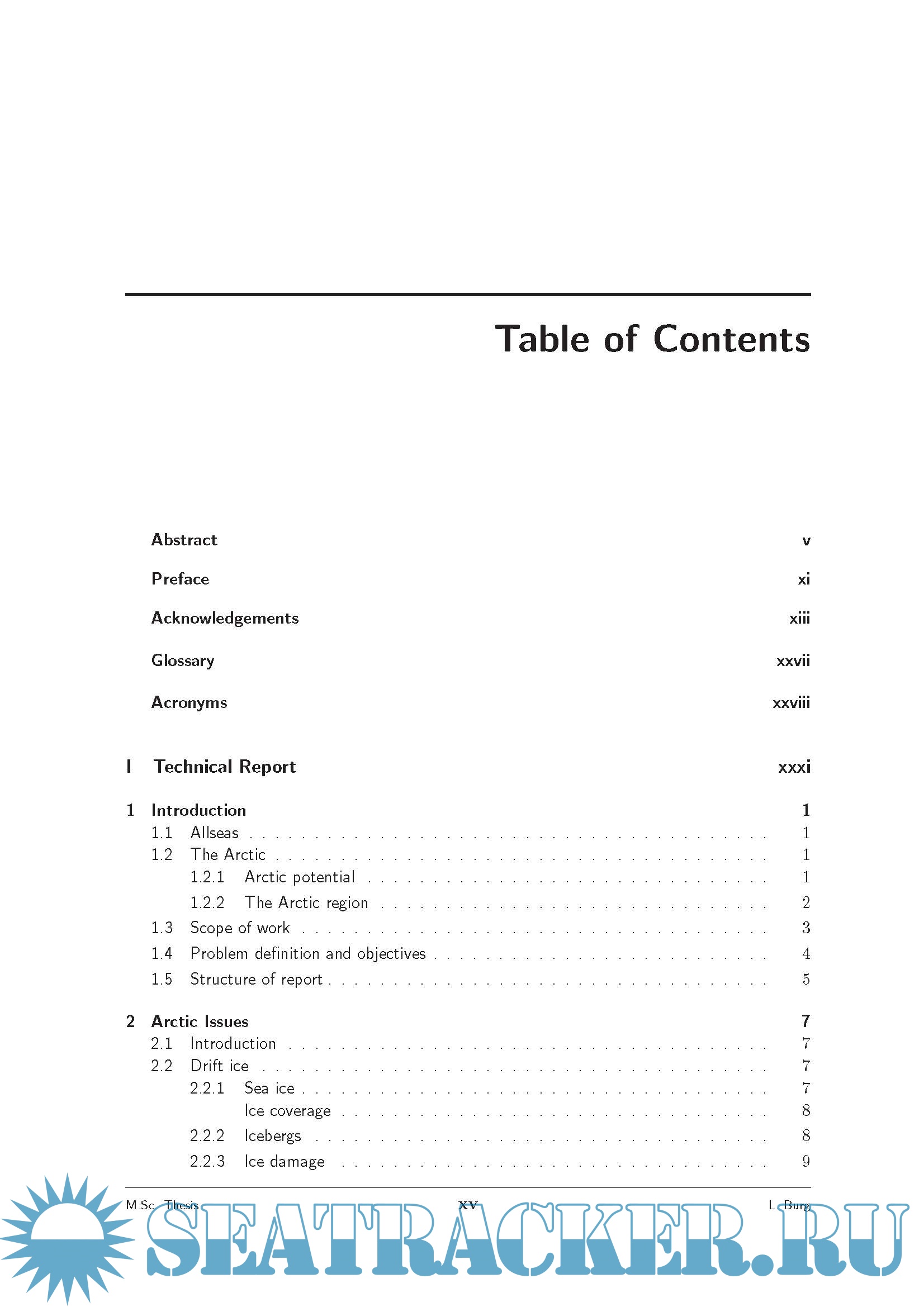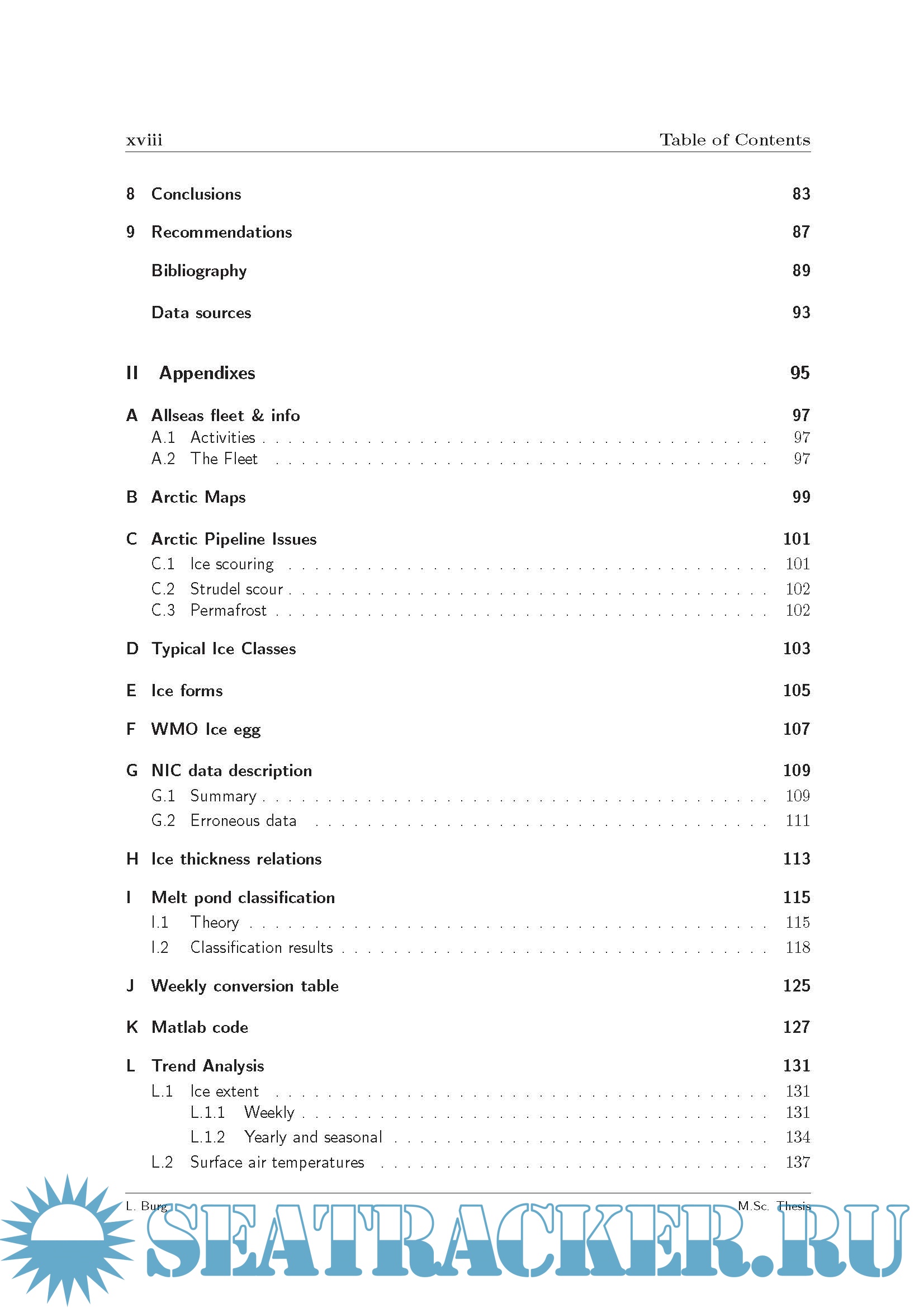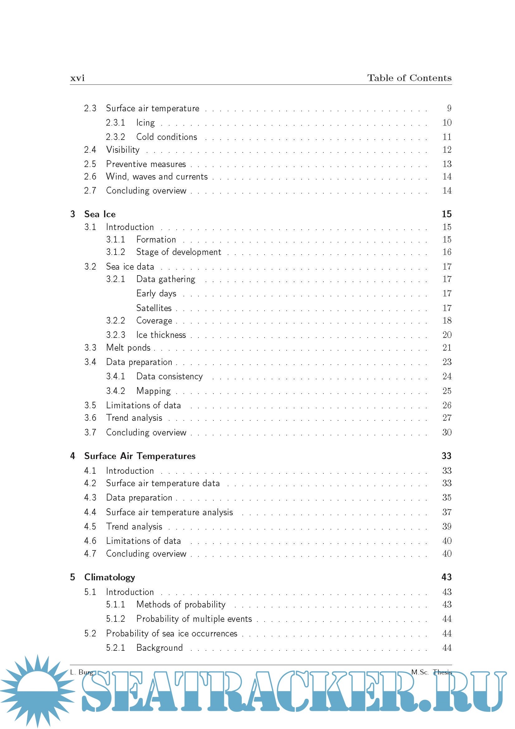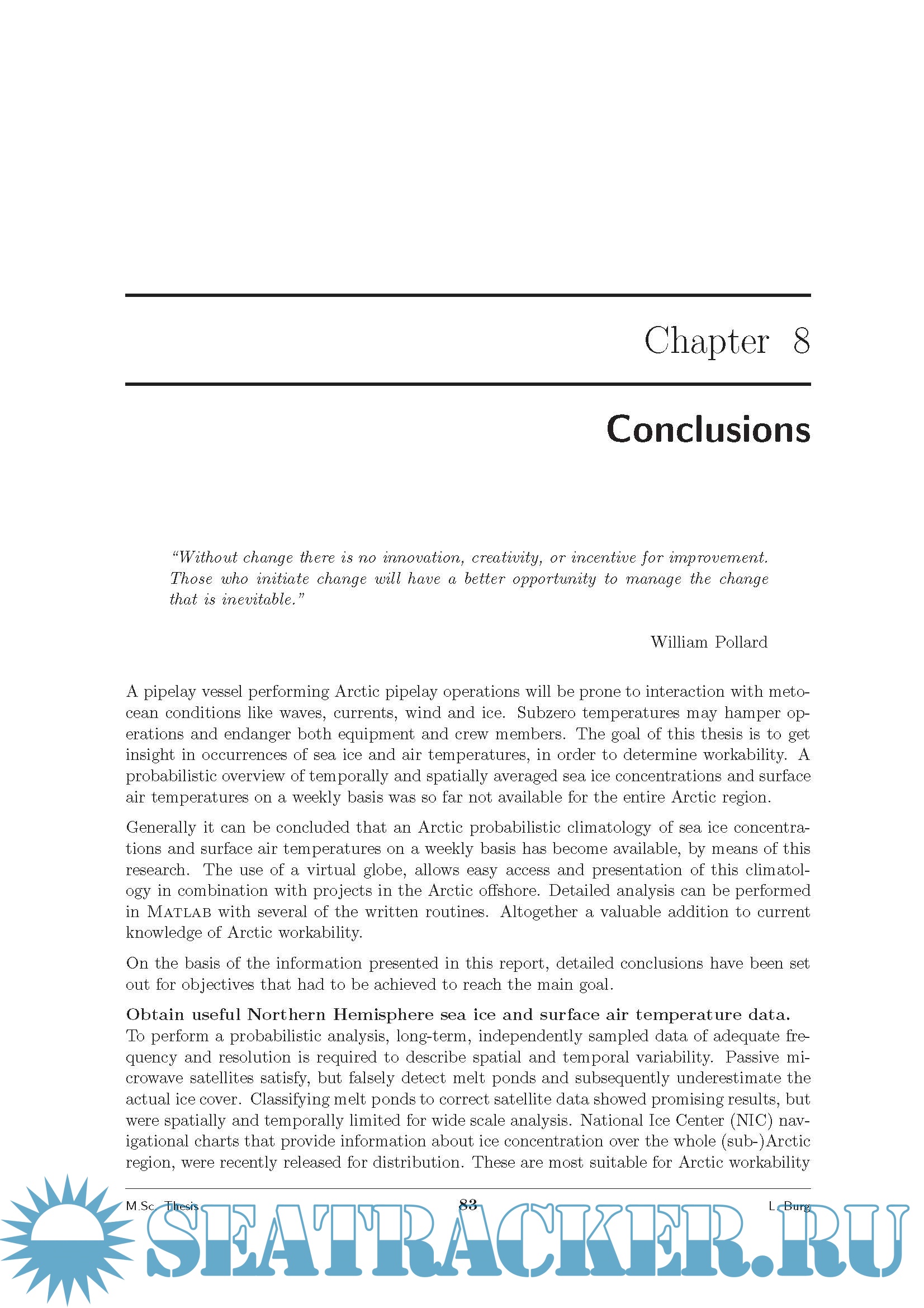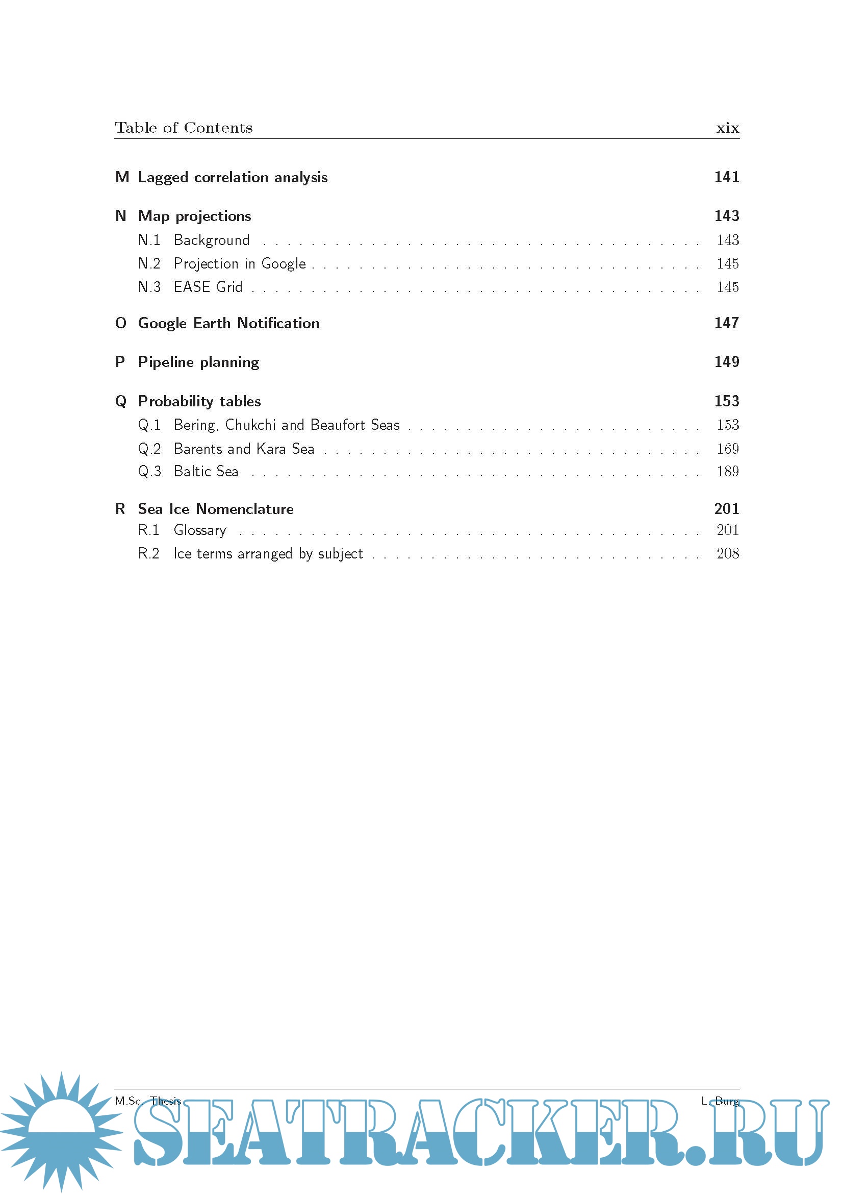 Description: Studies underscore the significant reserve potential of the Arctic region: an estimated 25 percent of potential oil and gas reserves, onshore and offshore, is believed to be located in the Northern Hemispheres Arctic region. Although these areas already have been under consideration for over 30 years, technical difficulties have put a threshold on these developments. Natural conditions like low visibility, extreme colds and ice make it nearly impossible to navigate and therefore restrict workability immensely. The thesis focuses on the occurrences of certain concentrations of sea ice, air temperatures and their combined events. Based on these findings a probabilistic approach allows the definition of risk features over defined spatial and temporal domains. Such results will allow a-priori project management for safe Arctic navigation and pipelay operations regarding the conditions under consideration. The probabilities of occurrence for sea ice concentrations above 0% and 30% have been determined by calculating the relative frequency over 33 years. To analyze the effect of air temperatures and ice existence on navigability and operability, occurrences of both surface air temperatures and sea ice have been determined. The combined events include: - Thresholds for surface air temperatures. * -15 Celsius, current structural limit; * -40 Celsius, designated structural limit; * -5 Celsius, where icing may start to form. - Thresholds for ice concentrations. * 0% ice concentration, current structural limit; * 30% ice concentration, assumed allowed conditions with ice classification. Results have been visualized on a virtual globe with Google Earth. Layers, which can be controlled over time, and display occurrences of all analyzed conditions as well as surface air temperatures.