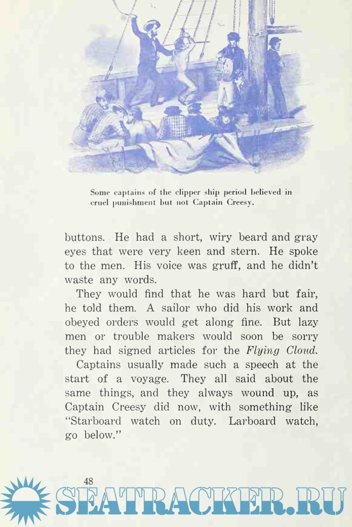 The clipper ship era comes vividly to life in this documentary account, richly illustrated with lovely old prints and paintings. Readers will travel with the captain and crew of the famous Flying Cloud on its around-the-world trip from New York to San Francisco and then back to New York via China. The author tells how these sleek, beautiful ships were built, and how the crews worked to keep the ships in tiptop condition. How the men struggled to keep the ships under control in storms and squalls, and how they worked to repair the broken masts and ripped sails which raging winds and waves destroyed, are all described in colorful detail. Readers also watch husky men load and unload cargo in bustling harbor cities, hear the sailors singing chanteys as they work, and mourn with the shipbuilder of the Great Republic when the magnificent vessel catches fire in New York Harbor.