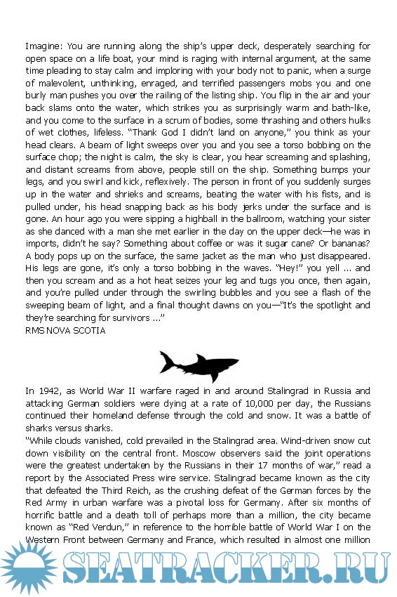 In the water, human intelligence is no match for a shark’s brutal, destructive instincts. Sharks are born to kill and eat: They detect distress, smell blood—and attack. Marine disasters such as those above result in humans becoming prey, floating in inner space as shadowy sharks swim below, ready to attack. Helpless to save yourself—floating and waiting, watching the malevolent creatures circle, knowing what will happen . . . a sudden swirl of water, a cloud of blood, the searing pain . . . until there is no more. This is unspeakable horror