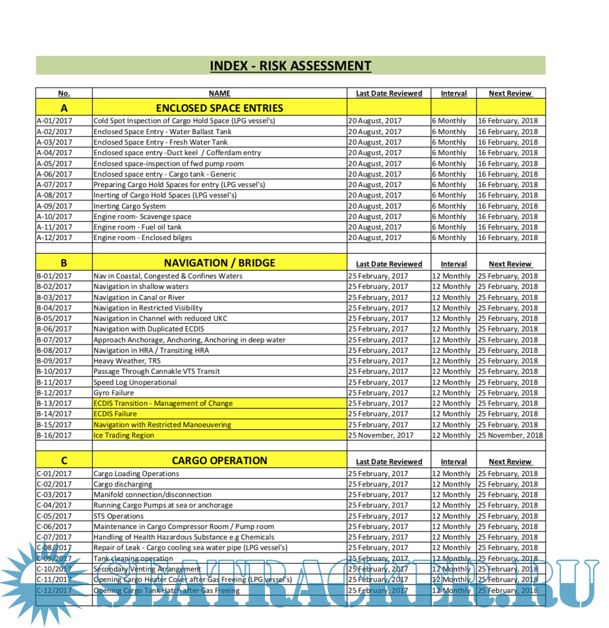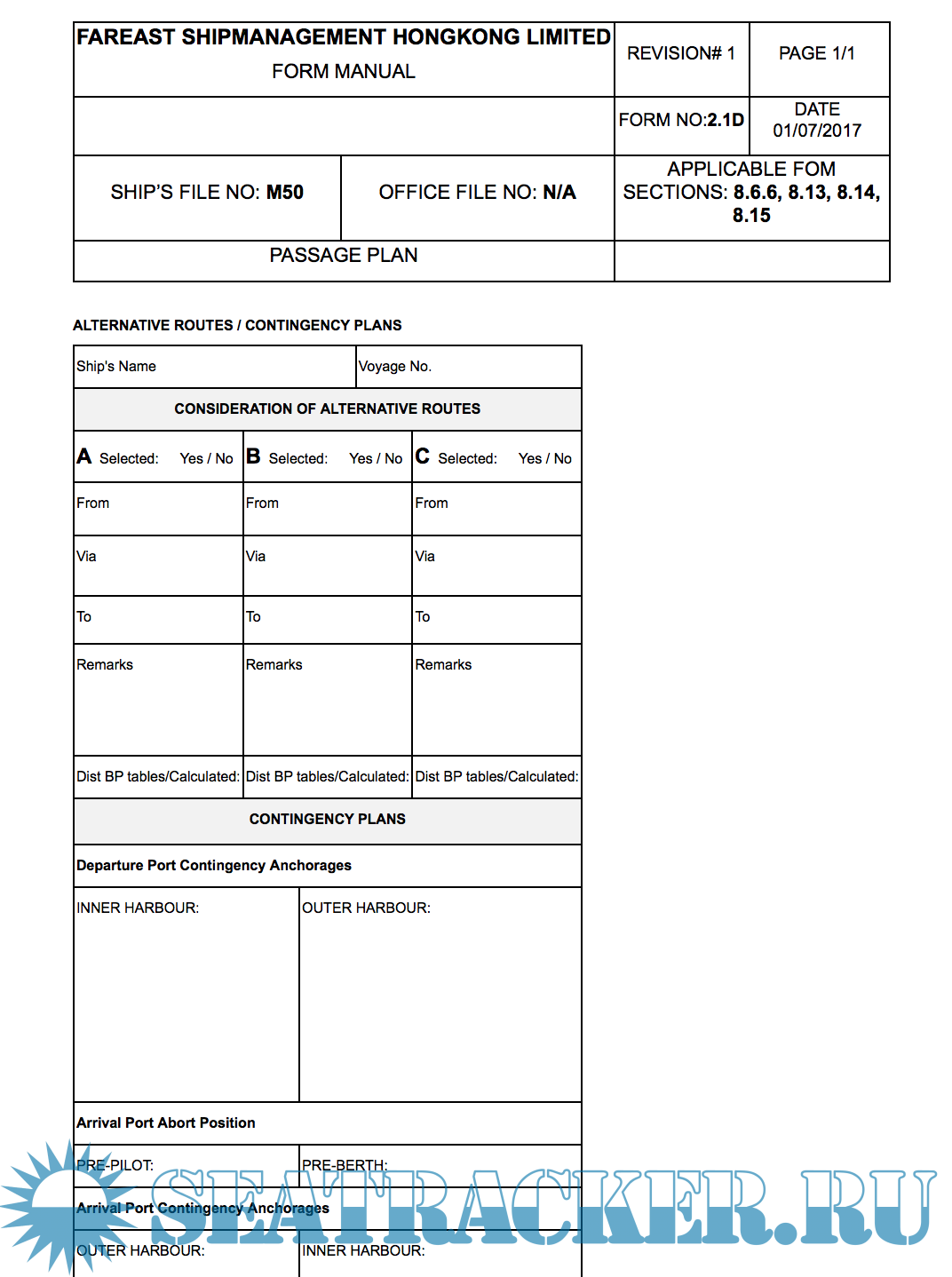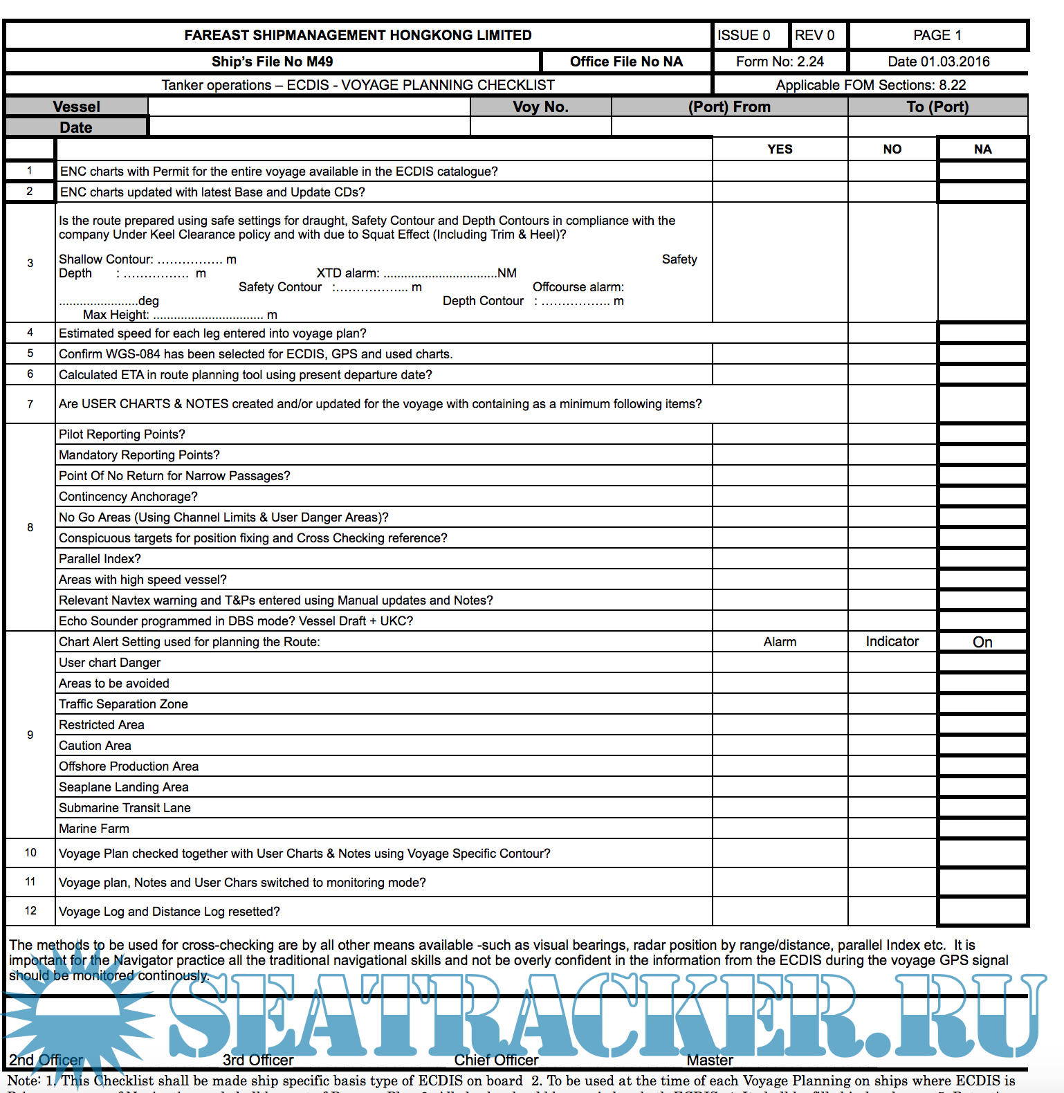 Year: 2017 Language: english Author: Fareast Genre: Methodological guide Publisher: Fareast Edition: 1 ISBN: n/a Format: Other Quality: eBook Pages count: 2017 Description: SEC 8 of SAFETY AND QUALITY MANAGEMENT SYSTEM of Fareast Shipmanagement Hongkong limited. Included risk assesments and check list of all procediments. 8.1GENERAL An efficient bridge organization requires competent and vigilant bridge watch keeping officers and a strong and efficient team, which shall follow specified procedures and is fully familiar with the navigation equipment and its competent use. Analysis of casualties indicates that weakness in the organization coupled with failure of the individuals to carry out their duties" the right way the first time and every time" have contributed to a number of accidents. Navigating activities rarely allow time for taking corrective action at the last moment. All actions therefore need to be pre planned taking into account the relevant passage, associated nautical publications, weather, currents and the manoeuvring ability of the ship. The procedures specified herein are a required minimum by the company. Additional info: PDF, doc and xls