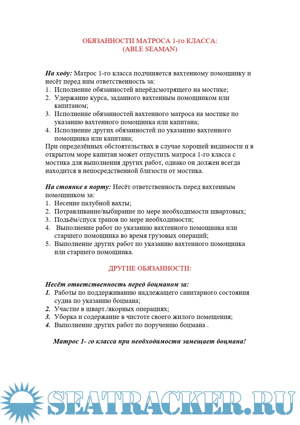 Обязанности матроса 1 класса