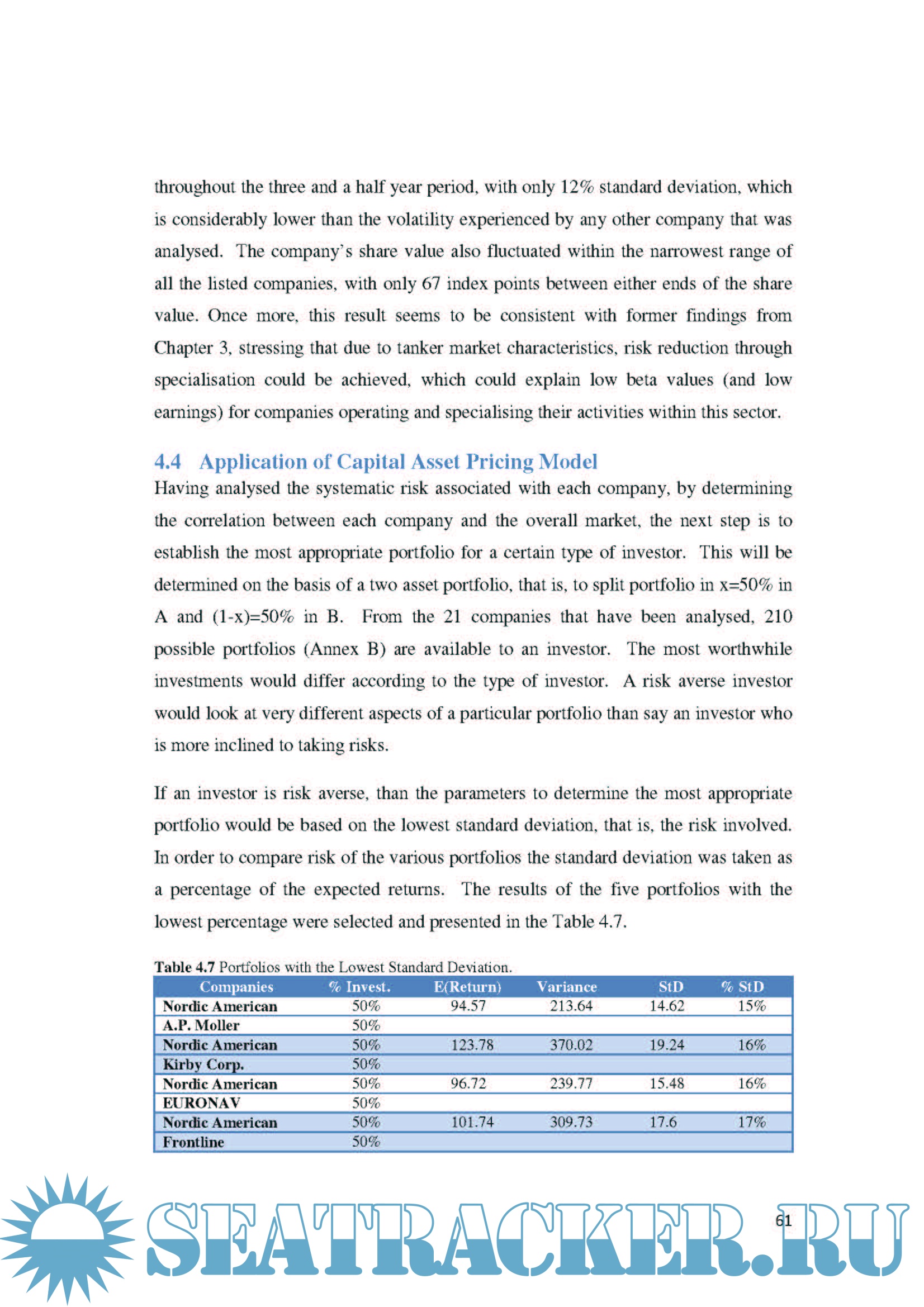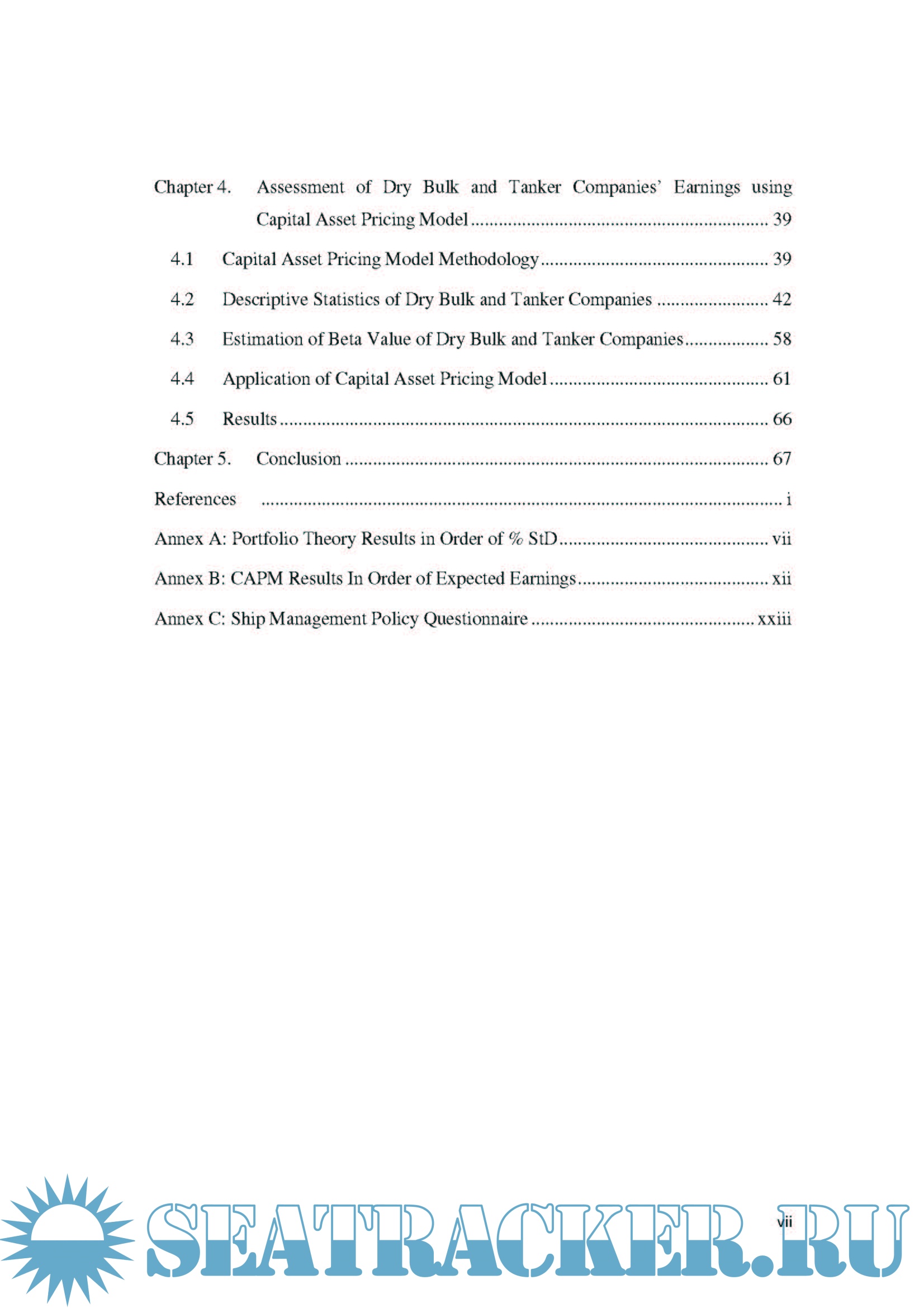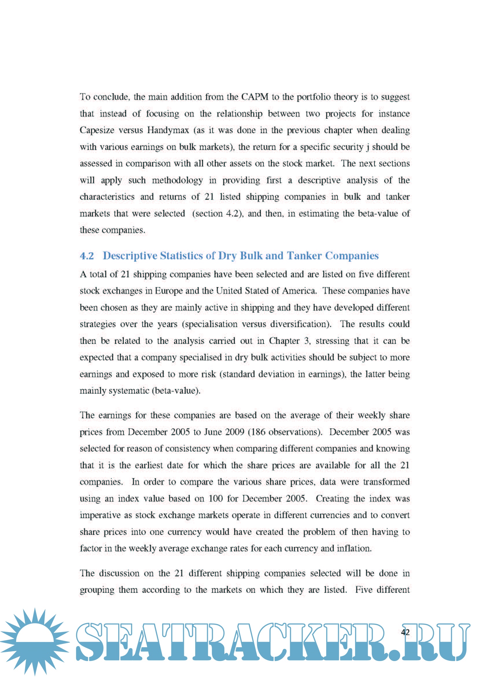Additionally, another in depth analysis is carried out of companies involved in maritime transportation which are listed on five different stock exchanges in Europe and the United States of America. By analysing each company’s share value and volatility between 2005 and 2009, the Capital Asset Pricing Model can then be applied to determine how the company performed. A comparison of each company’s performance with market freight rates allows for a conclusion to be drawn on the impact each strategy had on a company’s share price and beta value.