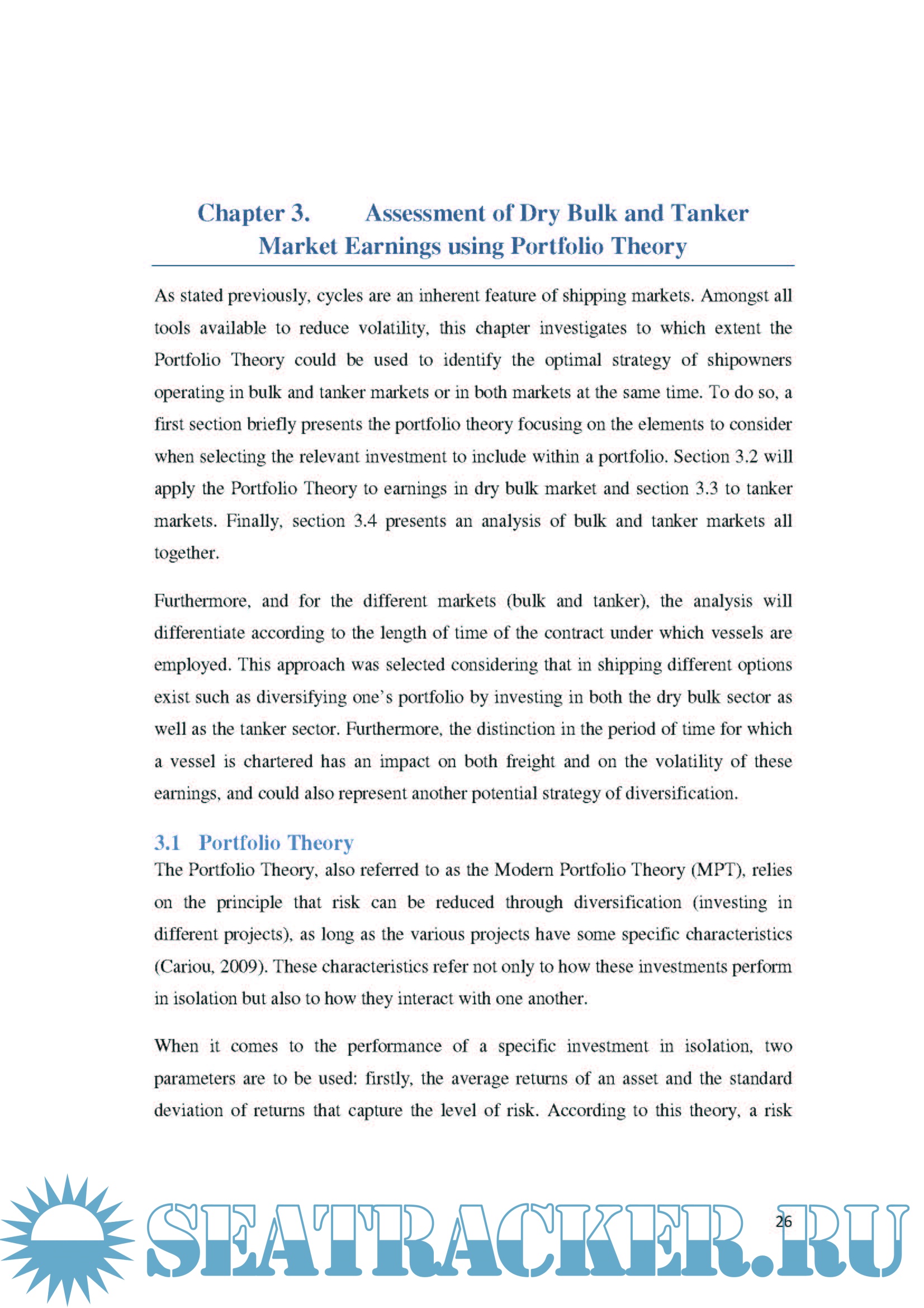 A detailed analysis is carried out of the earnings between 1991 and 2009 in four dry bulk sectors and four tanker sectors employed on the spot market, on 1-year time charters and 3-year time charters. Armed with this data, the correlation between all the market sectors, mean earnings and volatility can be calculated in order to apply the Portfolio Theory, thereby determining which combination of assets is most suitable for an investor.