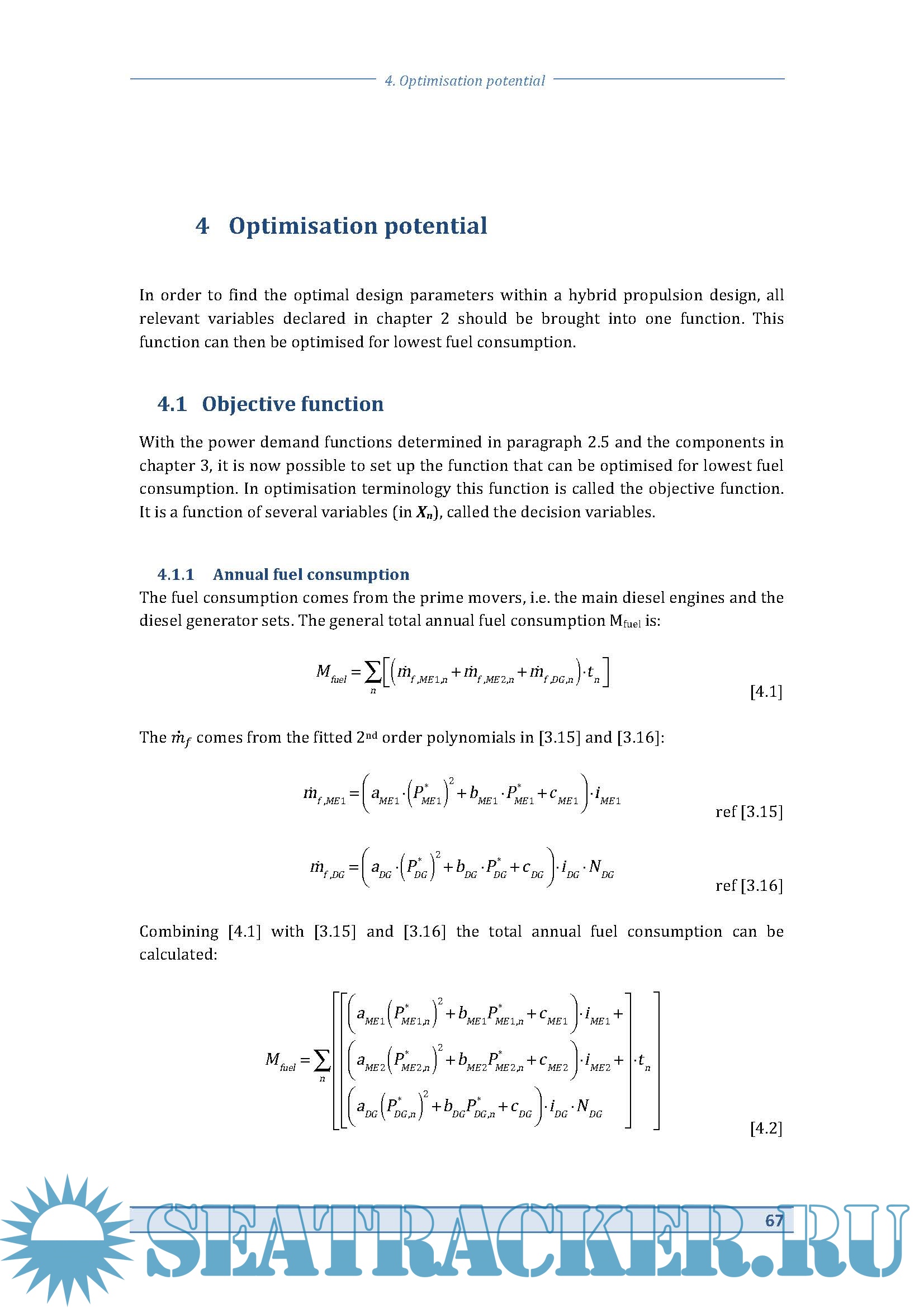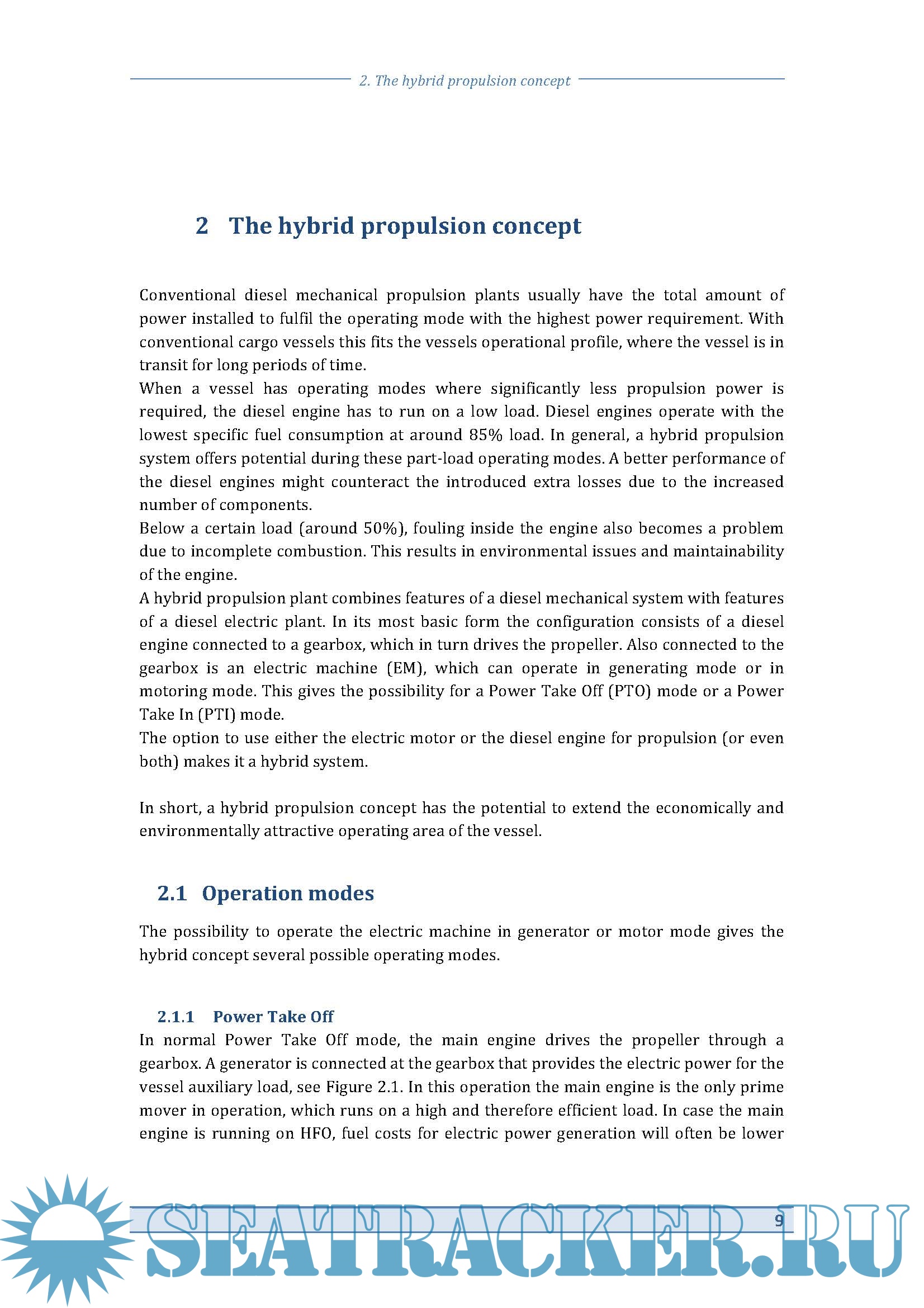 Description: A hybrid propulsion system features both a diesel engine and an electric motor for propulsion. The degrees of freedom with power generation raise the question how this division between power can be optimised in such a way that the engines are running with their optimal fuel efficiency. A generalised method to determine the power generation for all operating modes for a vessel, with a focus on the lowest fuel consumption of the diesel engines is developed.
