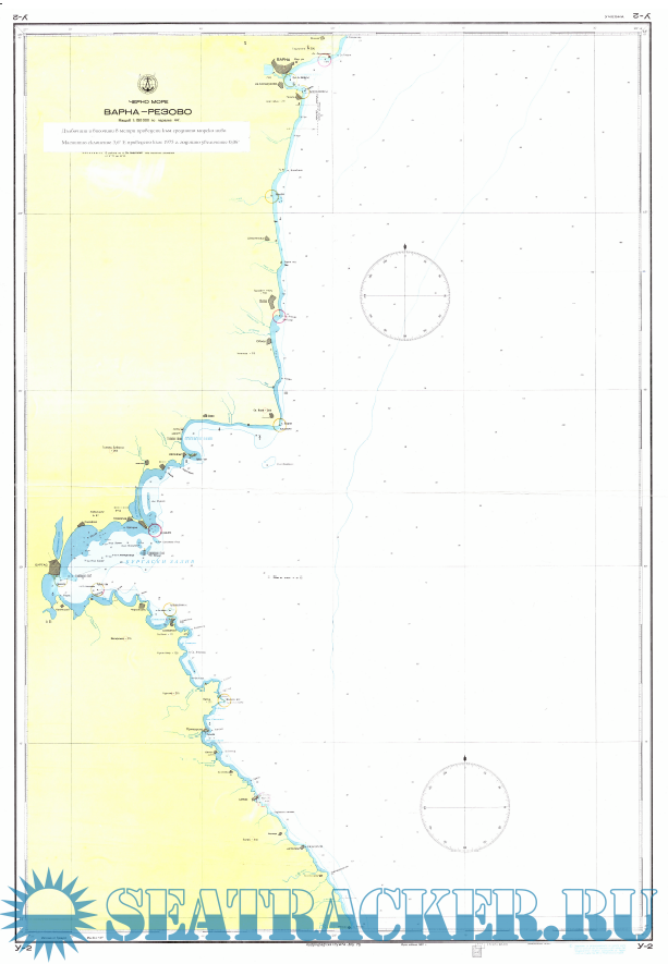 3. The title of the chart(in bulgarian) - Varna - Rezovo. The scale at parallel 44°, the magnetic declination for year 1975 with the increasement per year.
