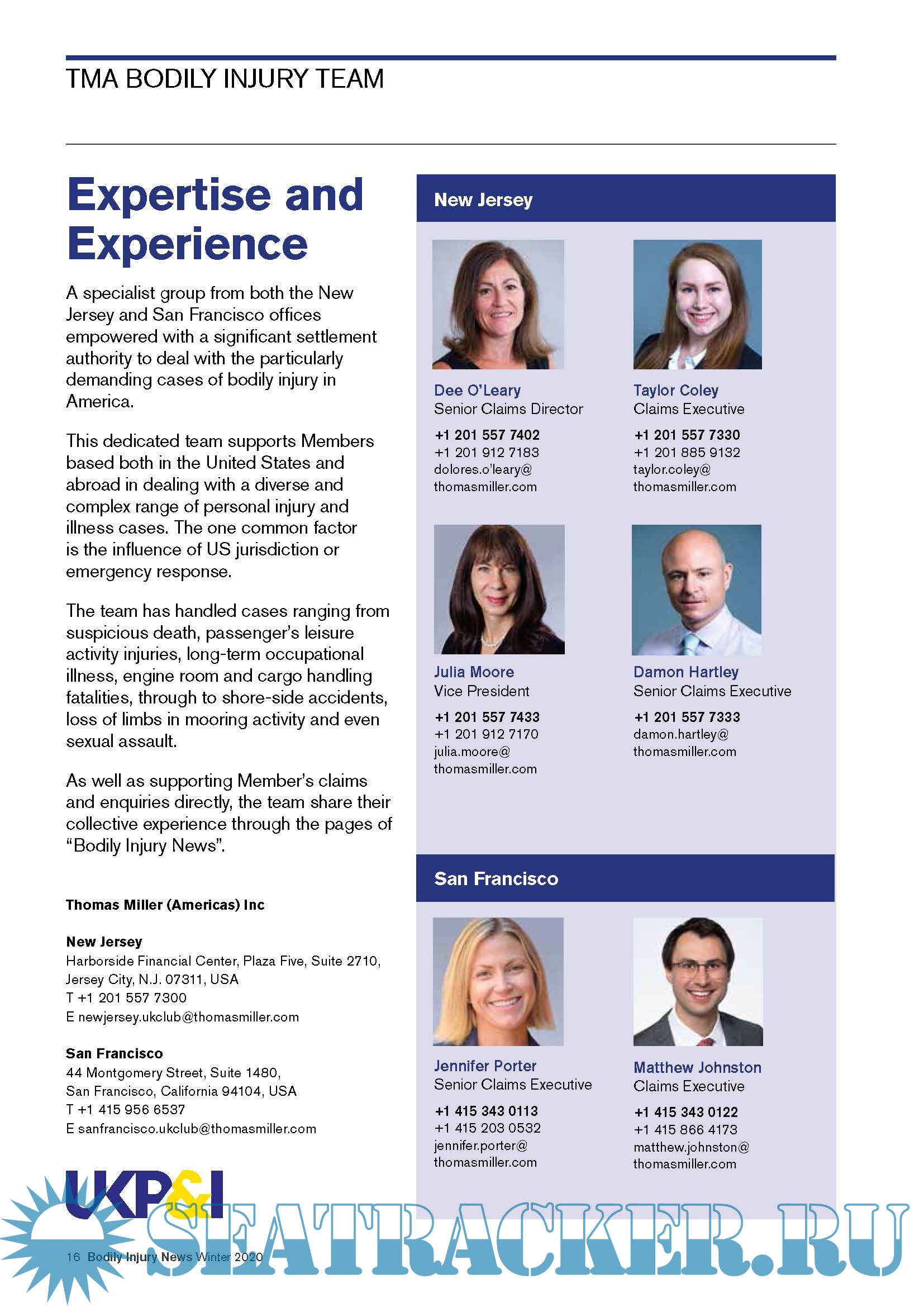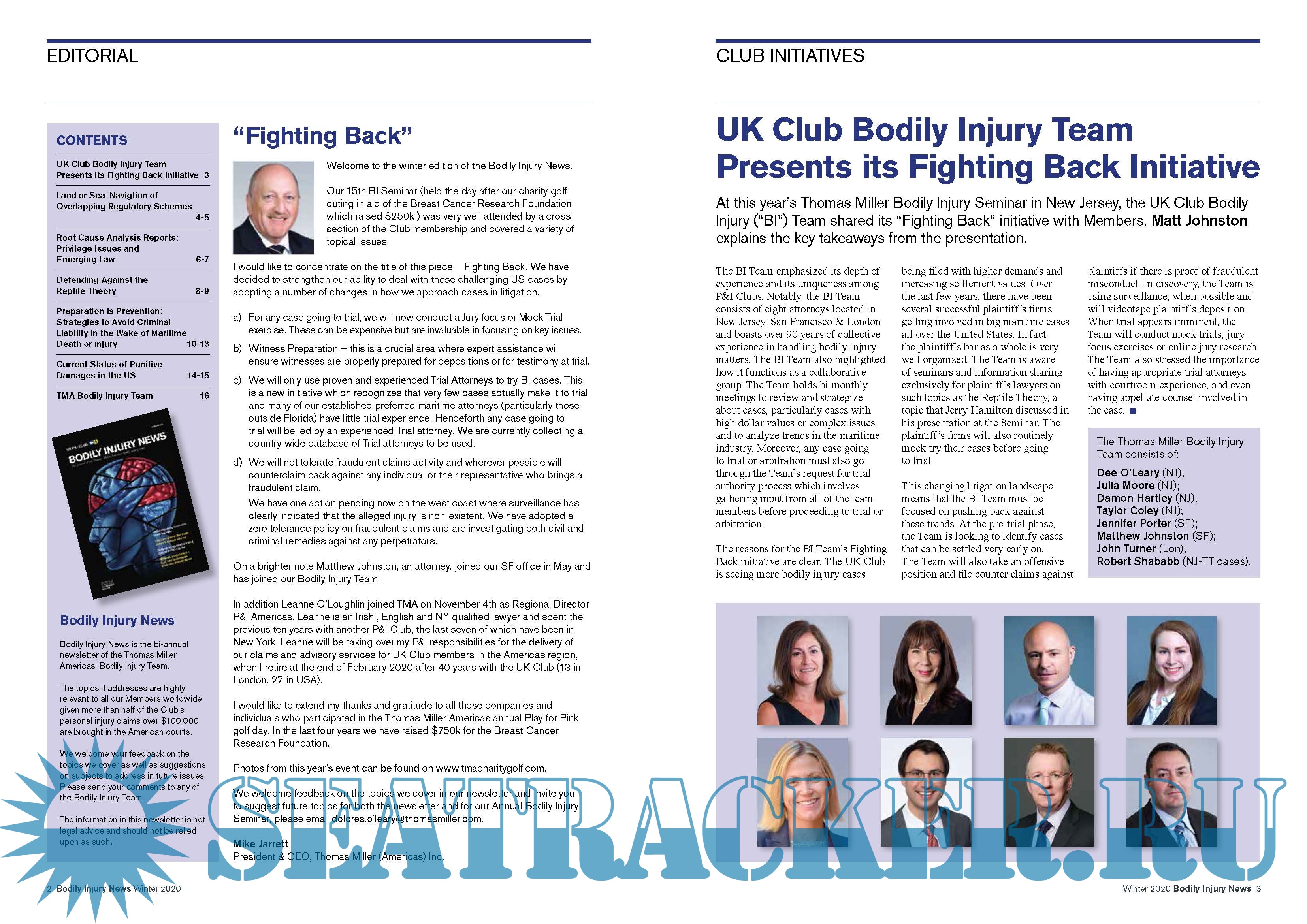 Description: Bodily Injury News Bodily Injury News is the bi-annual newsletter of the Thomas Miller Americas’ Bodily Injury Team. The topics it addresses are highly relevant to all our Members worldwide given more than half of the Club’s personal injury claims over $100,000 are brought in the American courts. We welcome your feedback on the topics we cover as well as suggestions on subjects to address in future issues. Please send your comments to any of the Bodily Injury Team. The information in this newsletter is not legal advice and should not be relied upon as such.