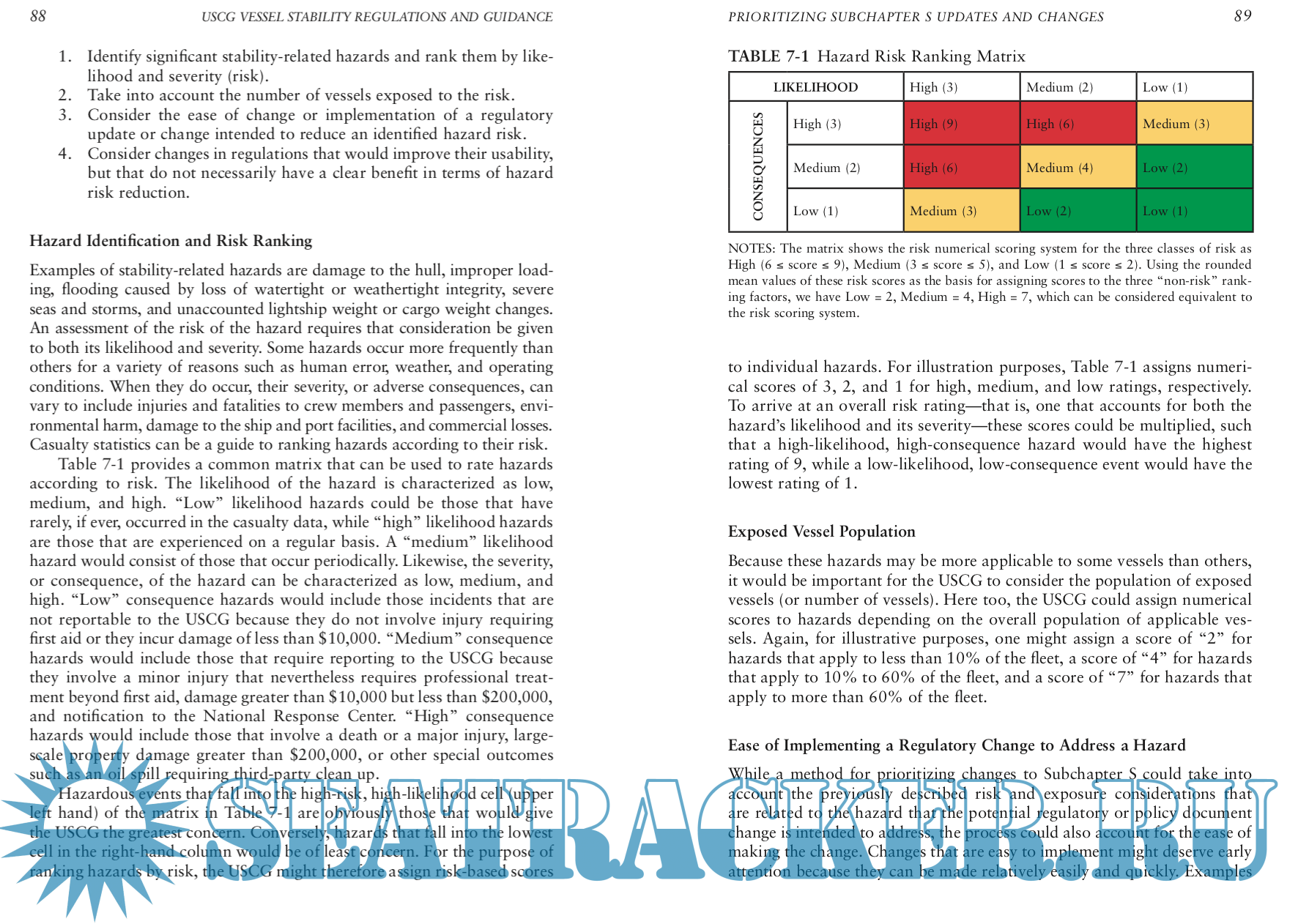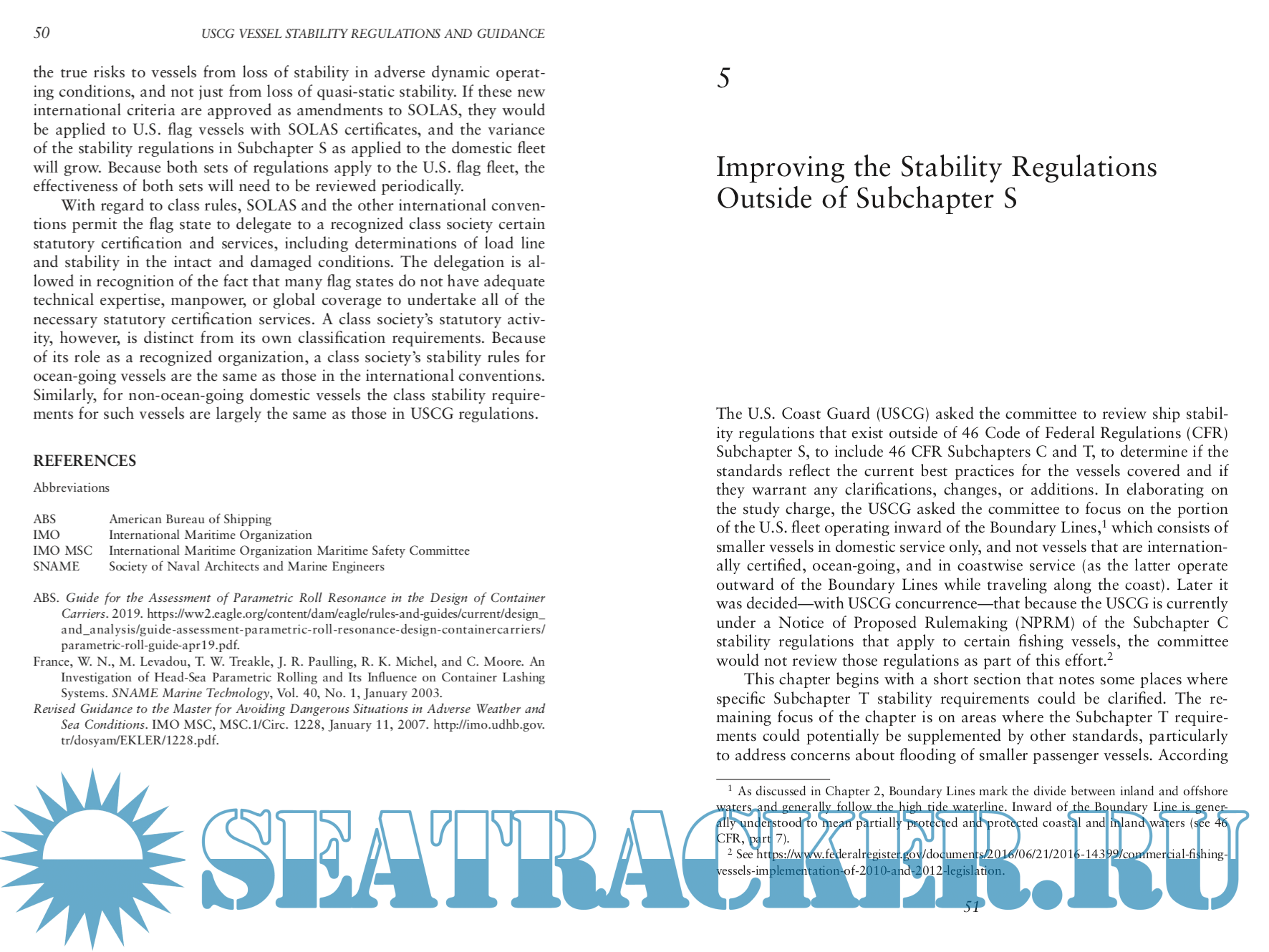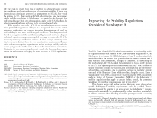 Description: In September 2017, the U.S. Coast Guard (USCG) Office of Design and Engineering Standards asked the National Academies of Sciences, Engineer- ing, and Medicine (the National Academies), through the Transportation Research Board’s (TRB’s) Marine Board, to review USCG regulations and policy documents that establish stability requirements for U.S. flag vessels. The USCG has the authority to inspect commercial vessels to ensure their safety under 46 U.S. Code Chapter 33. The associated regulations in 46 Code of Federal Regulations Chapter I contain requirements for vessel stability that apply to certain vessels used in commercial passenger and cargo service. Subchapter S is generally applicable to all vessels; Subchapter T applies to certain small, inspected passenger vessels; and Subchapter C applies to certain uninspected vessels (primarily commercial fishing industry vessels).