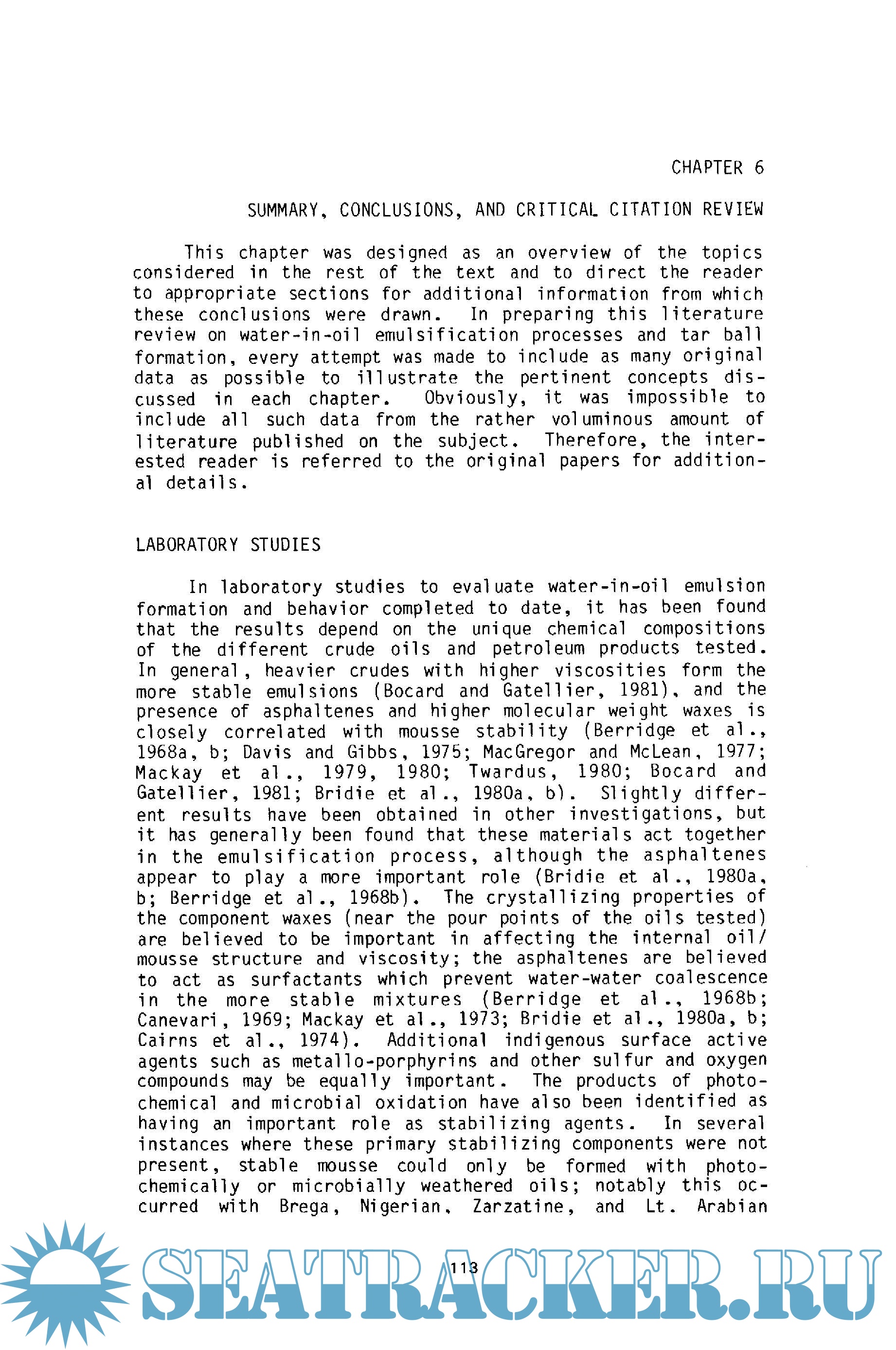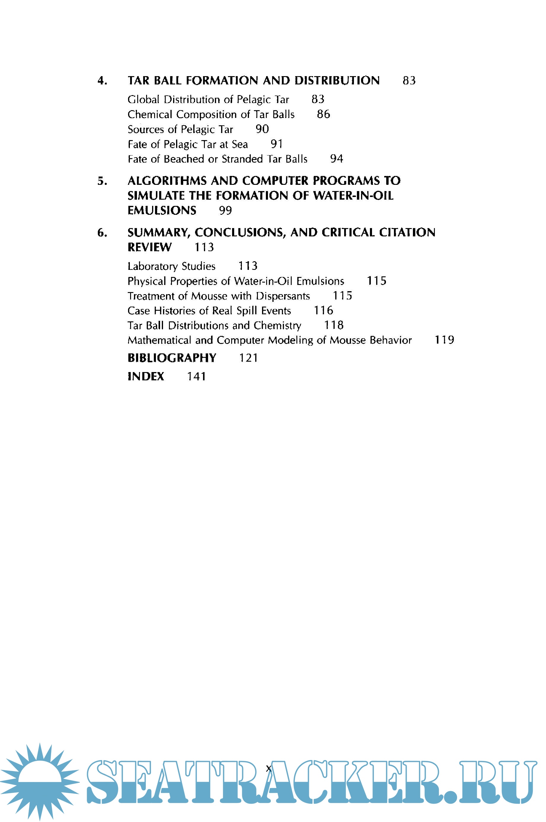 Description: This book covers research completed between 1981 and May 1985 and includes: reviews of recent studies, sittings and investigations at spills-of-opportunity as well as results of recent arctic and sub-Arctic oil weathering experiments and observations on the behaviour of crude oil in the presence of ice. Topics covered include the following: laboratory studies of formation and stability of water-in-oil emulsions; selected case histories of the more detailed chemistry studies of mousse behaviour and long term fate in near-coastal and open ocean oil spills/blowouts; tar ball formation and distribution; and algorithms and computer programs to simulate the formation of water-in-oil emulsion.