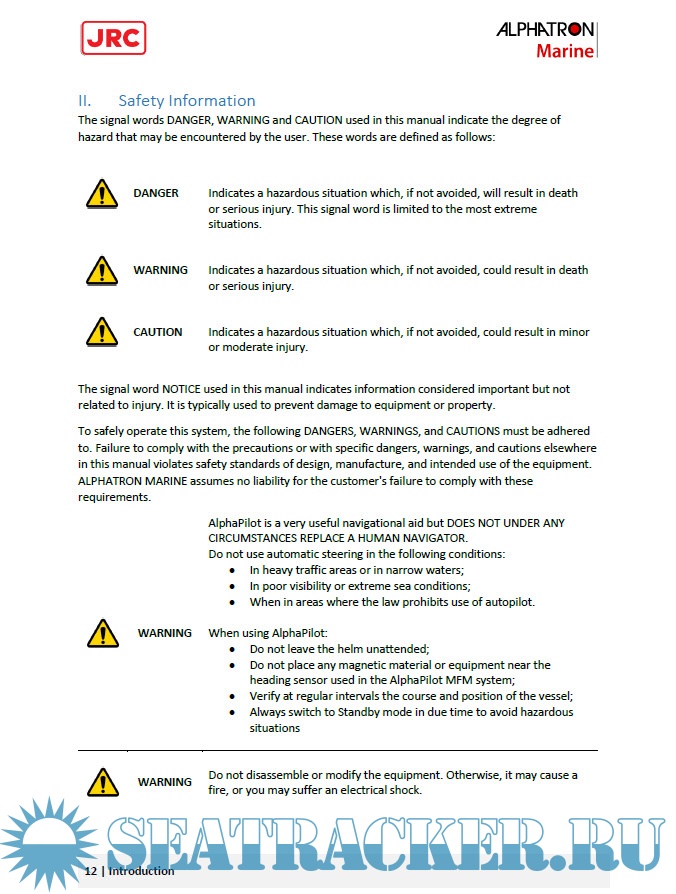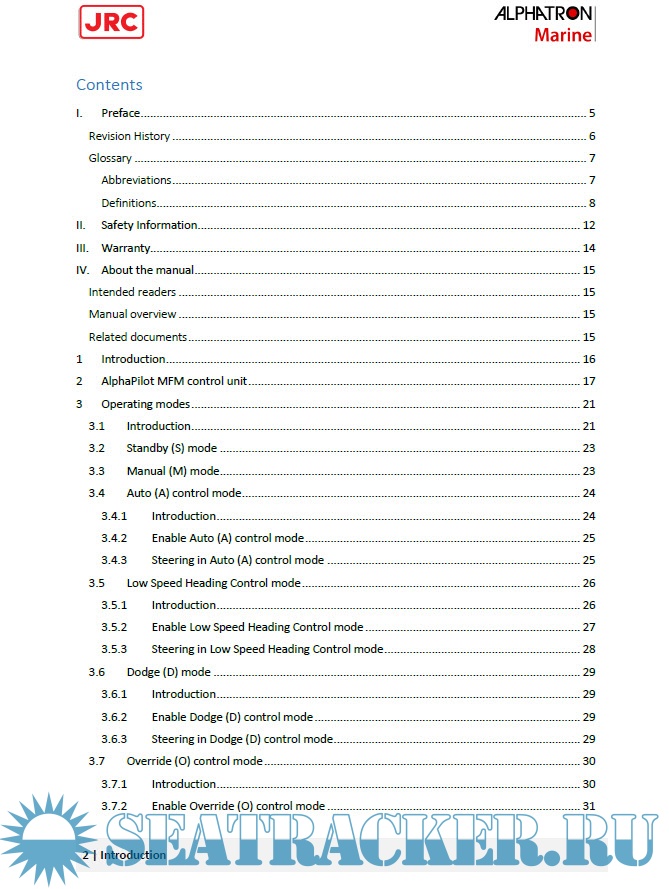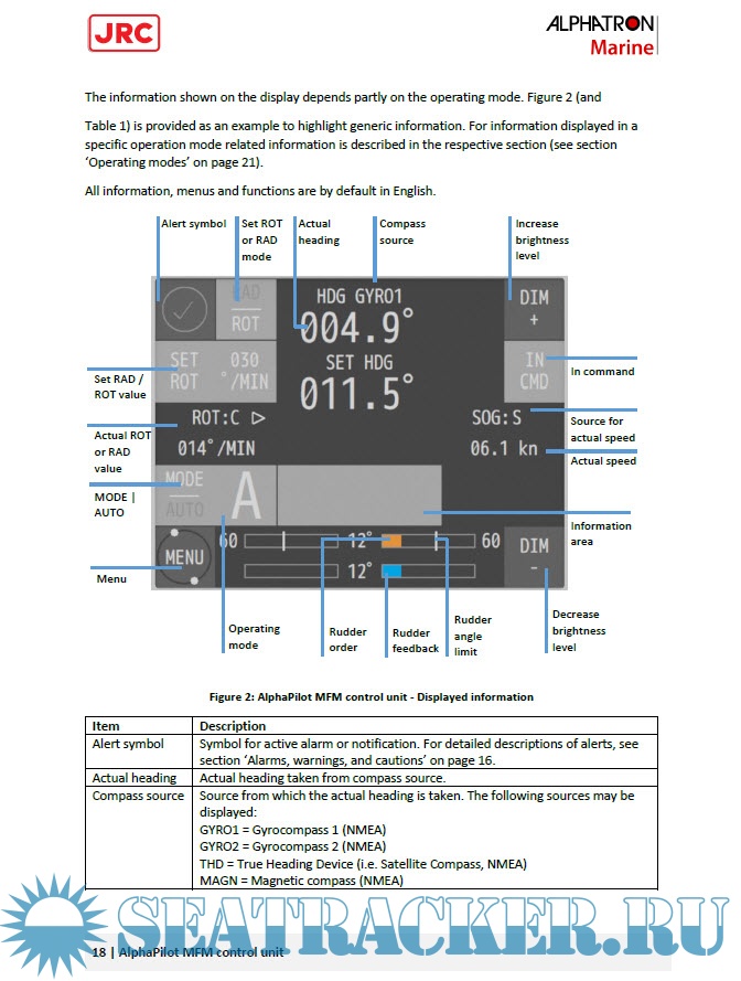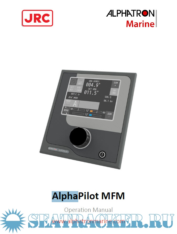 The AlphaPilot MFM control unit is the main control module of the AlphaPilot MFM system. It is used for control and monitoring of autopilot operation, setting vessel heading or rudder angle, selection of autopilot operating modes. Read this operation manual before operating the equipment.