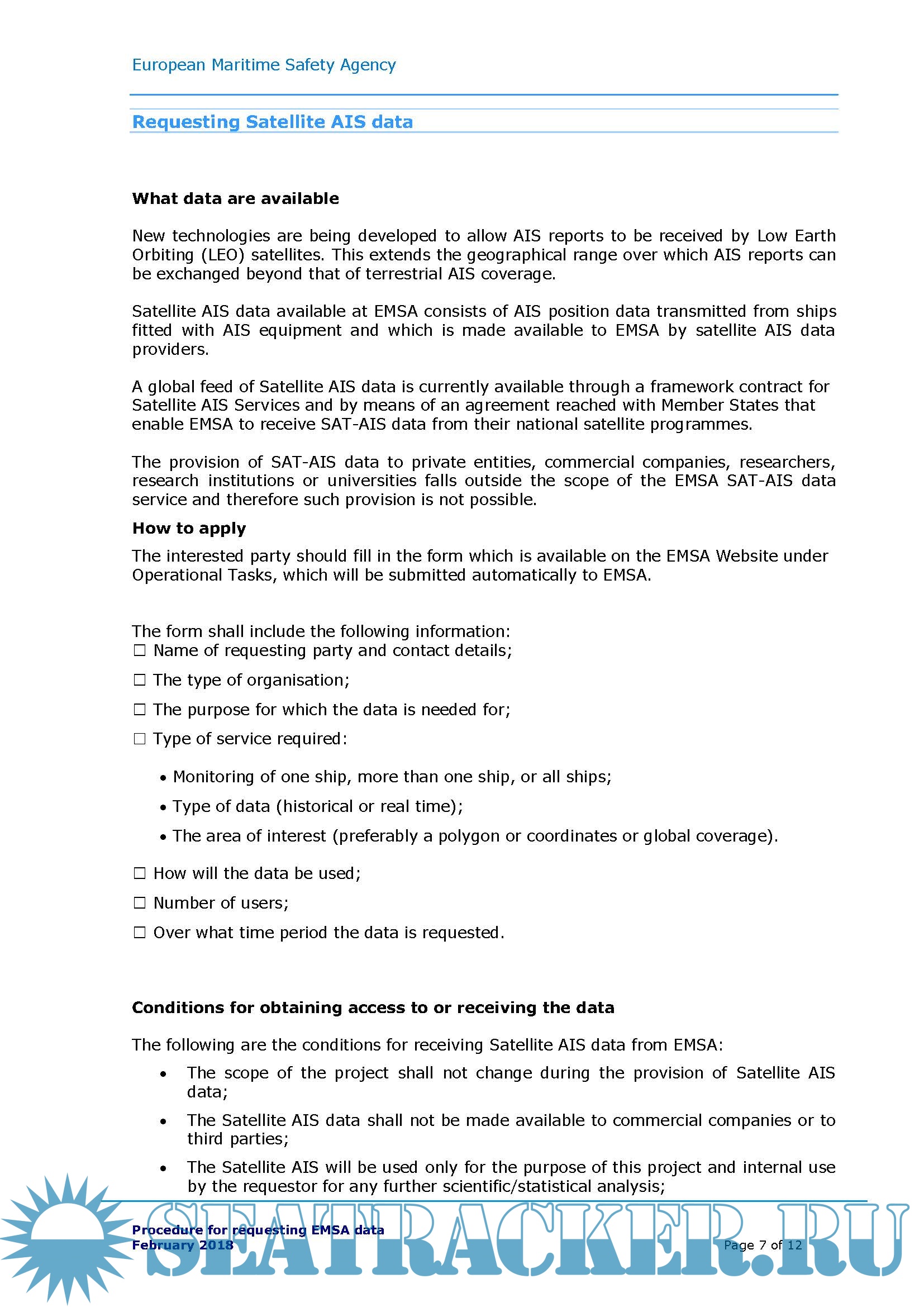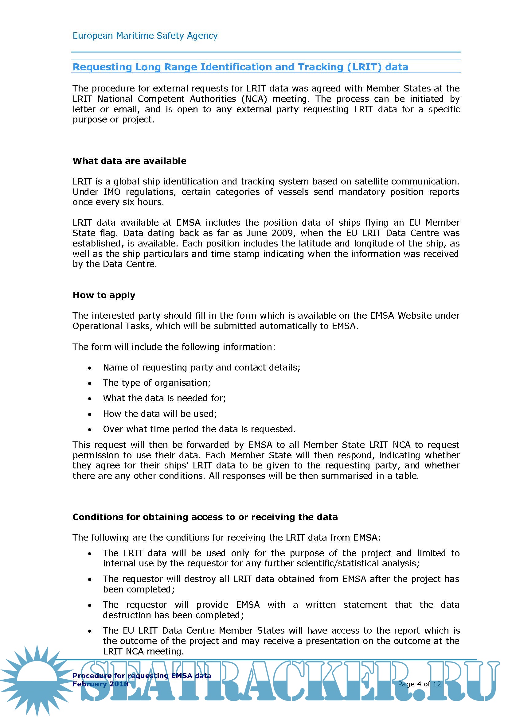 Year: 2018 Language: english Author: EMSA Genre: Guide Format: PDF Quality: eBook Pages count: 12 Description: The purpose of this document is to indicate the different procedures which have been established by the European Maritime Safety Agency (EMSA) to manage external requests for data from the EMSA applications (including Long Range Identification and Tracking [LRIT], SafeSeaNet, CleanSeaNet and Satellite AIS data). These requests are made by European Union (EU) Member State national government authorities and EU institutions and bodies, and by projects or programmes established by these parties and working on issues of public interest. For each specific data type, a different procedure is applied. The applicable procedures are described in this document, which provides the following information: What data are available; How to apply; Conditions for obtaining access to or receiving the data; What happens once a request has been approved.