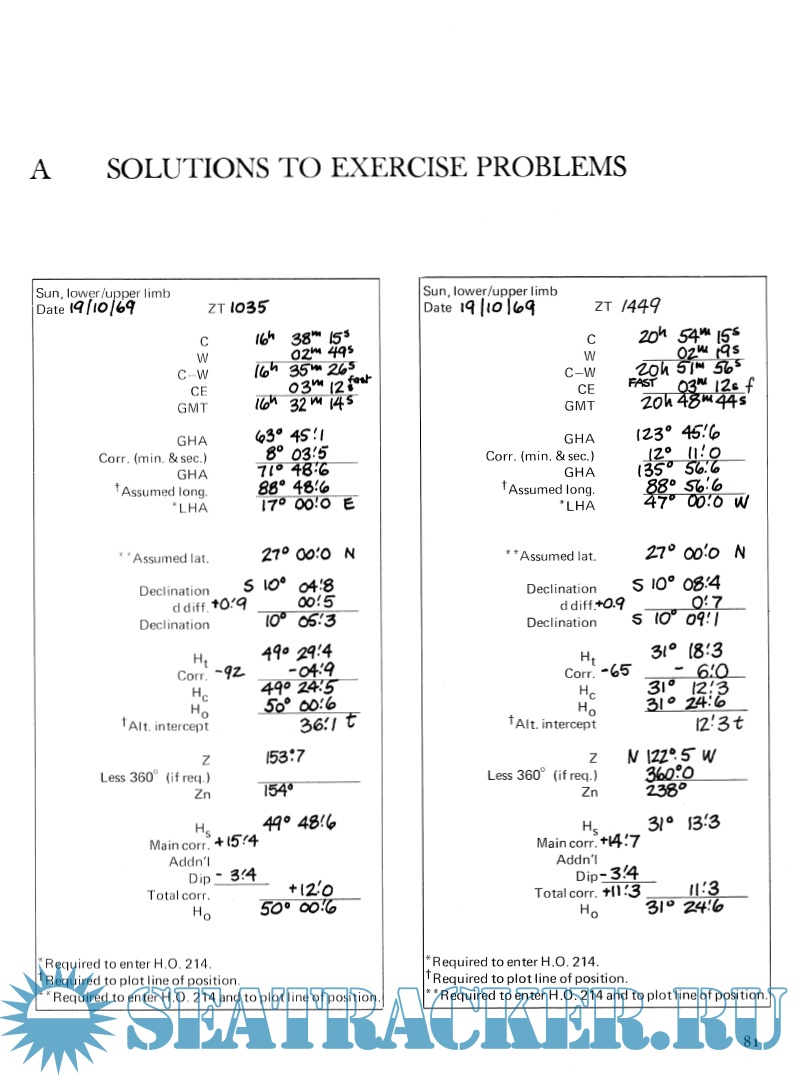 The first five chapters explain the meaning of the terms used in navigation, and explain the concepts behind the practical side of modern marine navigation. Chapters 6 through 16 are "how to" lessons. The student should study these chapters with contious reference to the appendix and the excerpts from the sight reduction tables and almanacs printed there. Each step can be repeated until he feels he has mastered the chapter. In each chapter, the steps are outlined with a detailed narrative explanation of what is involved. The same problem or a similar problem is worked again using the format that would be used in actual practice. Exercise problems are then provided.