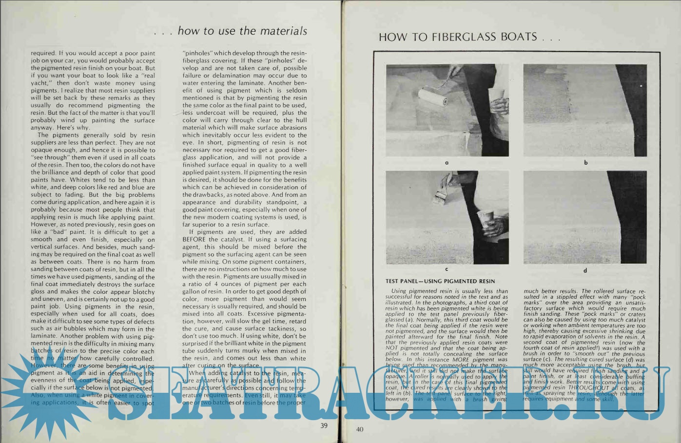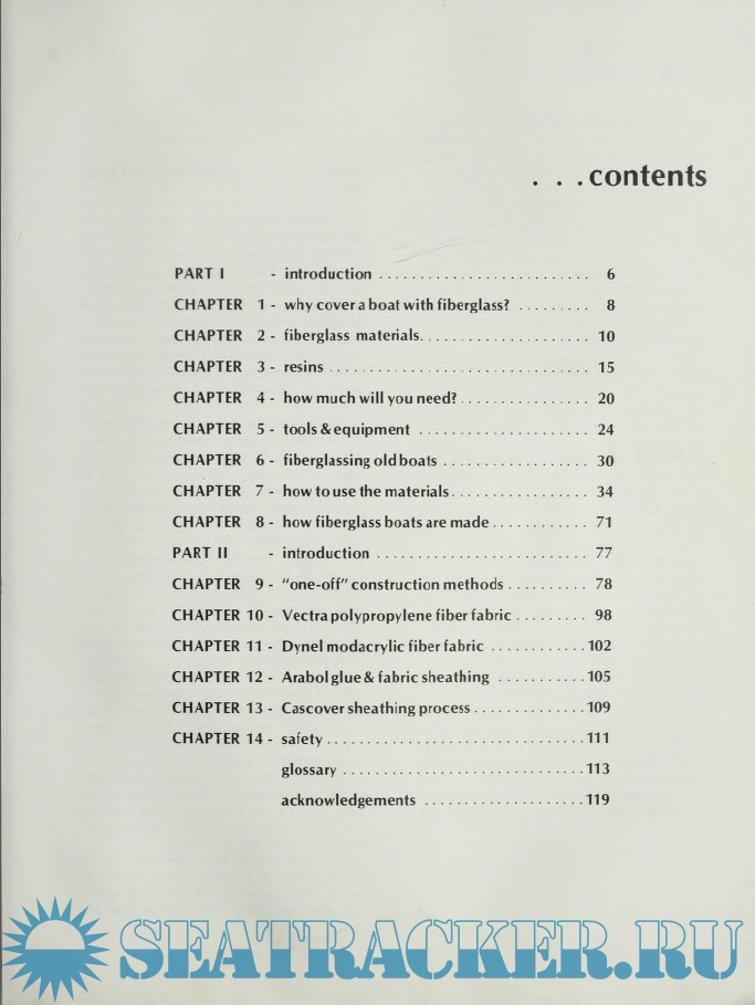 Year: 1974 Language: english Author: Ken Hankinson Genre: Guide Publisher: GLEN-L, Bellflower Edition: First ISBN: 74-27715 Format: PDF Quality: Scanned pages Pages count: 123 Description: A college professor once told me that the purpose of an introduction to a book is "to tell the reader what you're going to tell him!" So what this book is going to tell about is how to cover boats with fiberglass (specifically), plus a lot more about the subject of fiberglass and related materials (in general). This is a practical "how-to" book, however there's some technical information thrown in wherever necessary to explain the topic on hand, but not so much as to boggle the mind. The book is divided into two parts, with the first part being concerned with the basic p/\|\ I I materials, tools, and equipment used in covering boats with fiberglass, and how to apply and work with the materials. This first section is applicable to the covering of boats made from virtually any material. The second part of the book is concerned with other processes and materials using not only fiberglass and resin, but other materials which either complement fiberglass processes or compete directly with them. The final chapter concerns safety in a handy concise reference format which I hope the reader will review PRIOR to beginning his work.