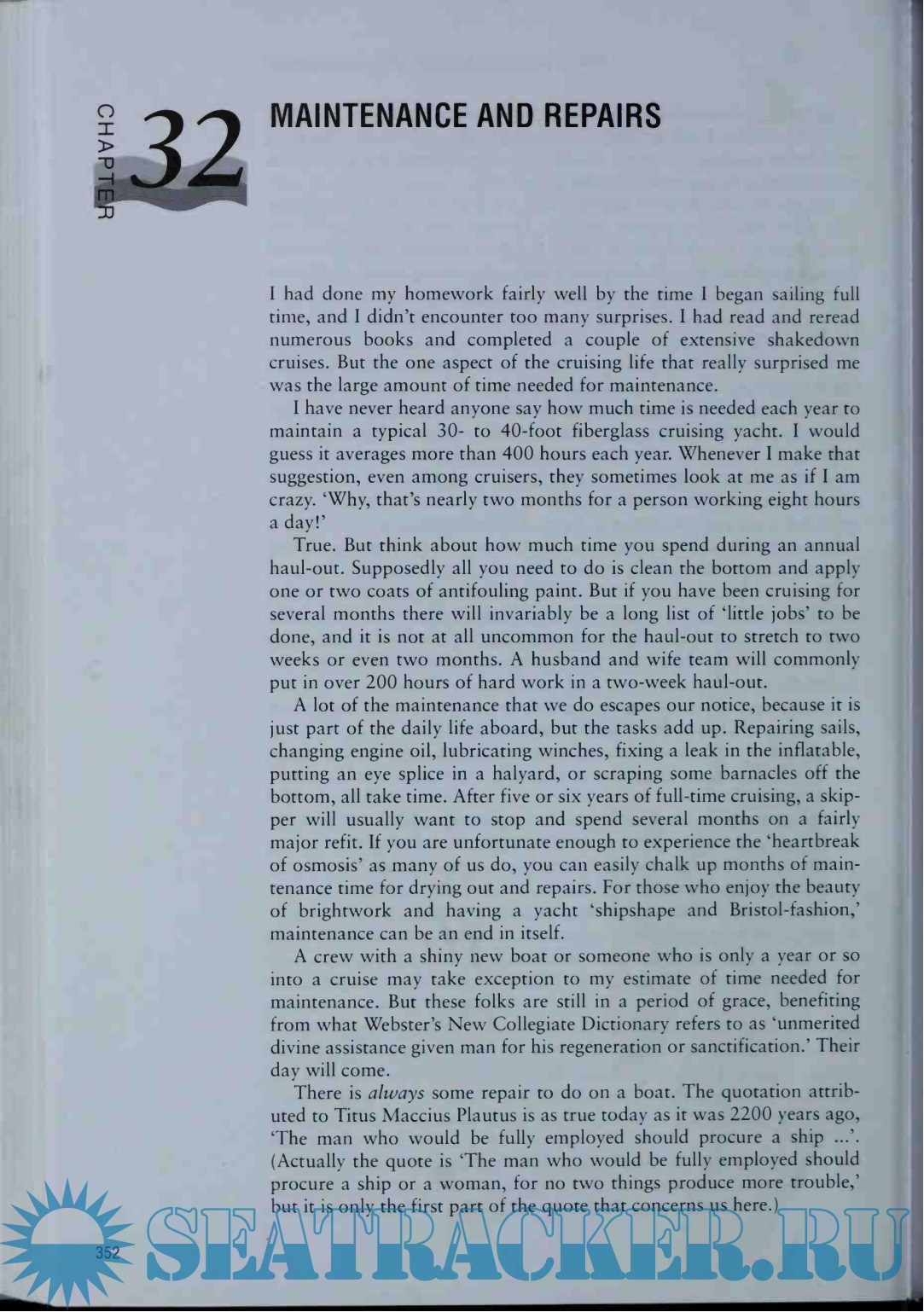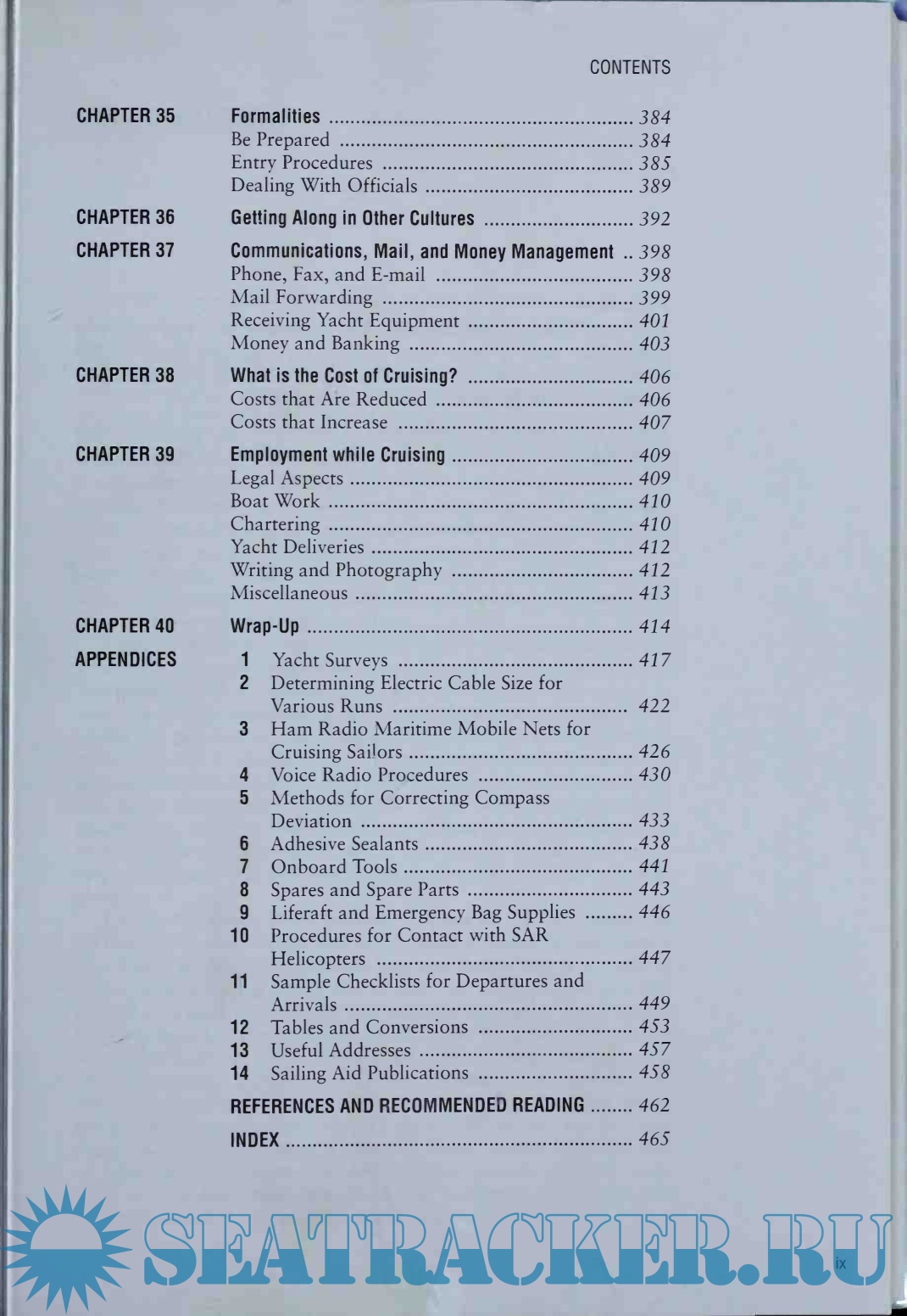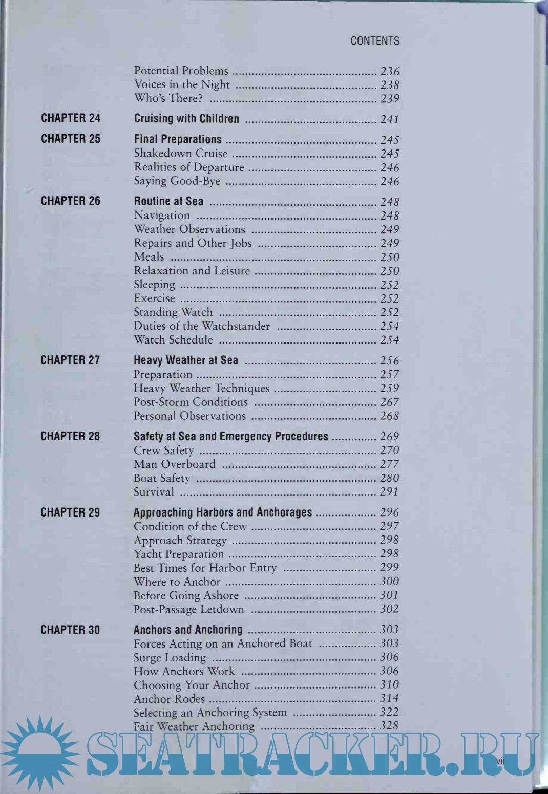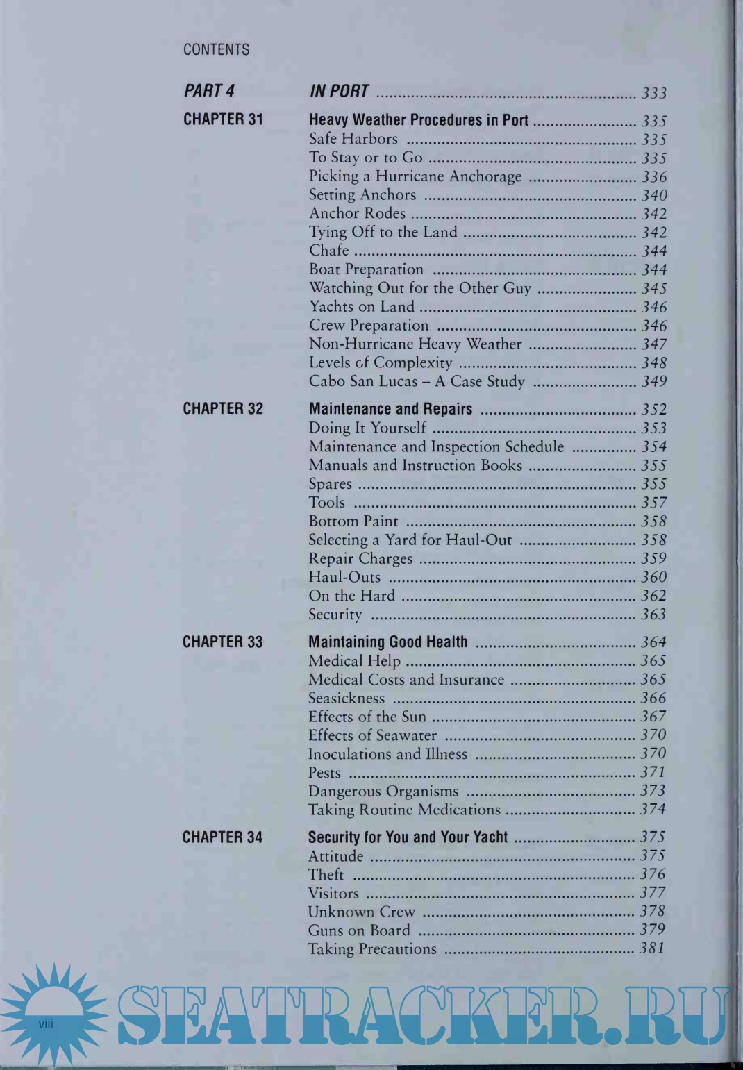 Parts 3 and 4 include everything about the voyage and what to do in port. Heavy weather at sea and in port are also given careful attention. The author has practical advice on trip planning, provisioning, maintenance and repairs; the important topic of anchors and anchoring is given a thorough treatment. The psychological aspects of cruising, the need to maintain good health, the need for security, and how to get along in other cultures are topics also covered.