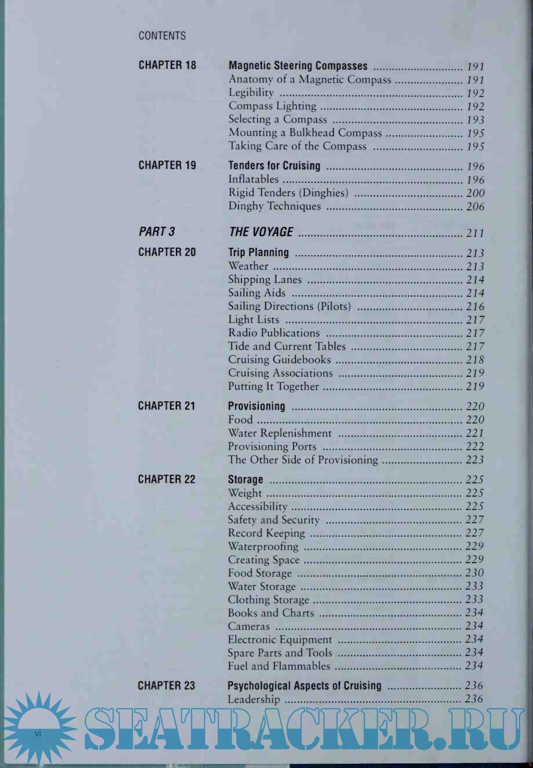 Part 2, Systems and Equipment, covers the engine, electrical systems and the latest electronics, plumbing, self-steering systems as well as cruising sails and magnetic steering compasses.