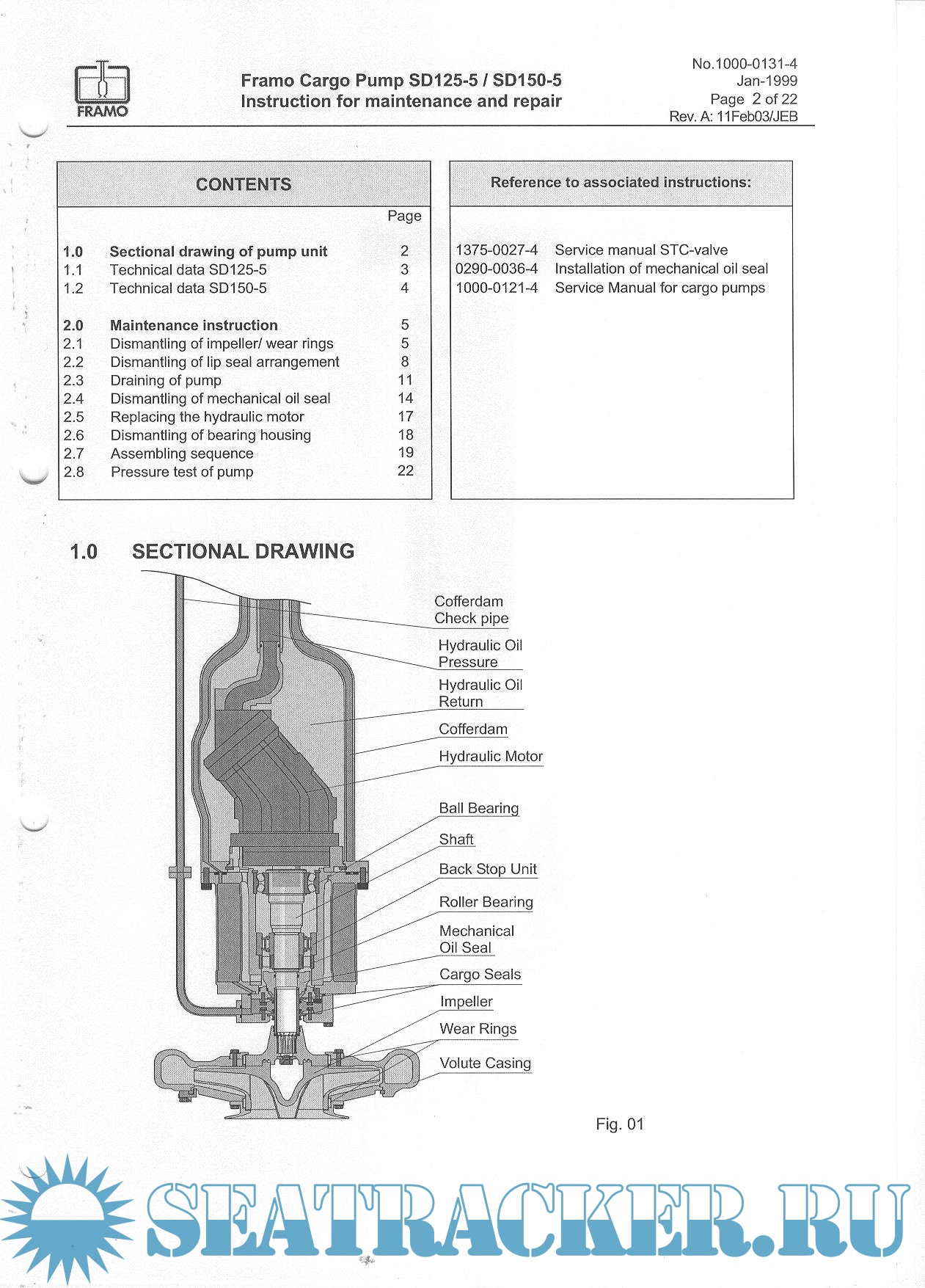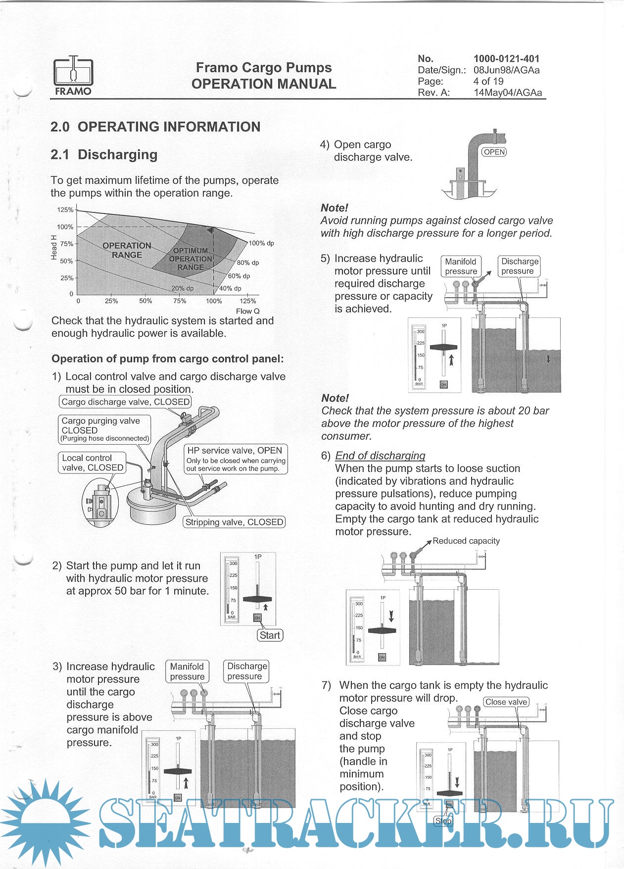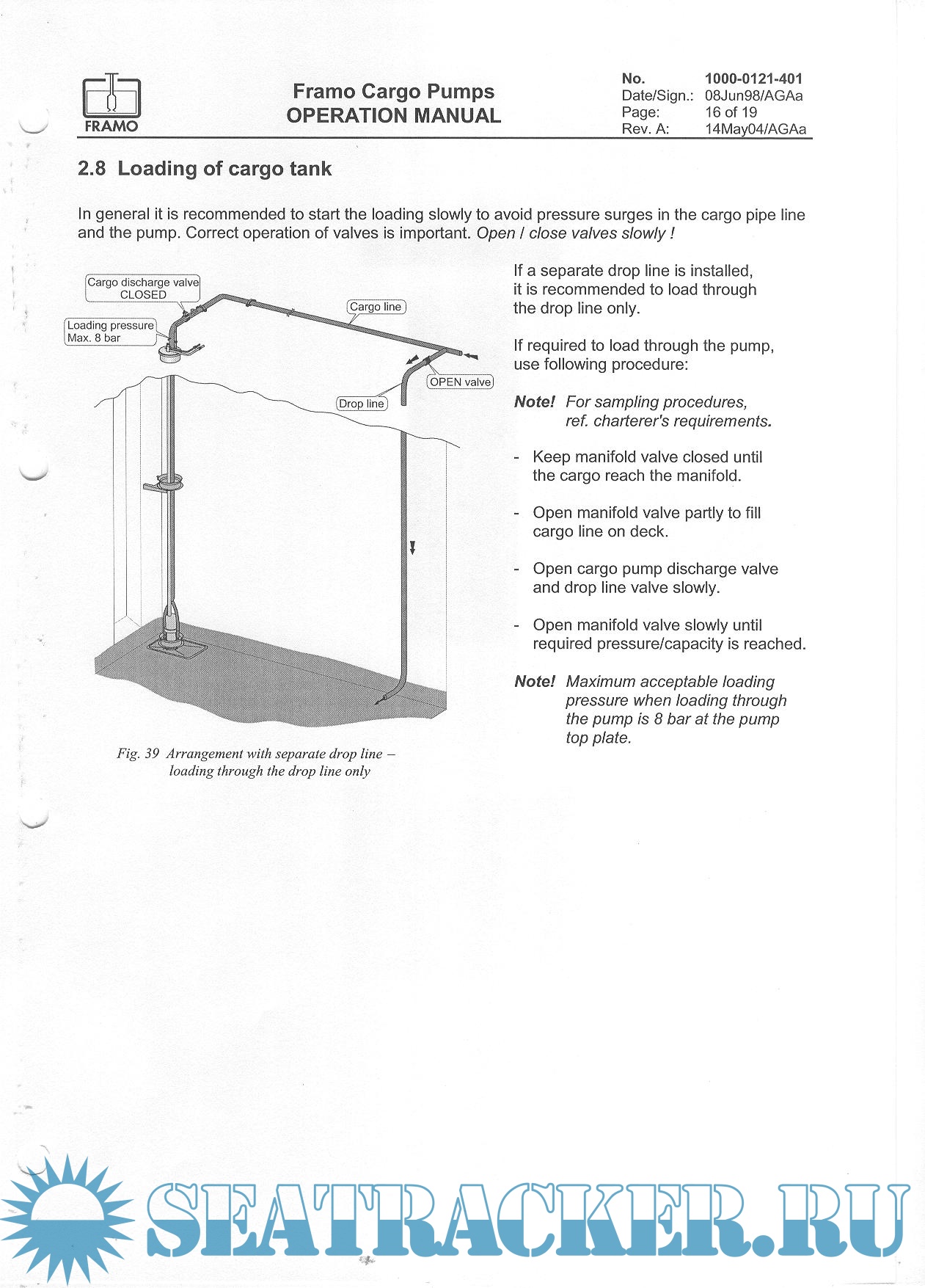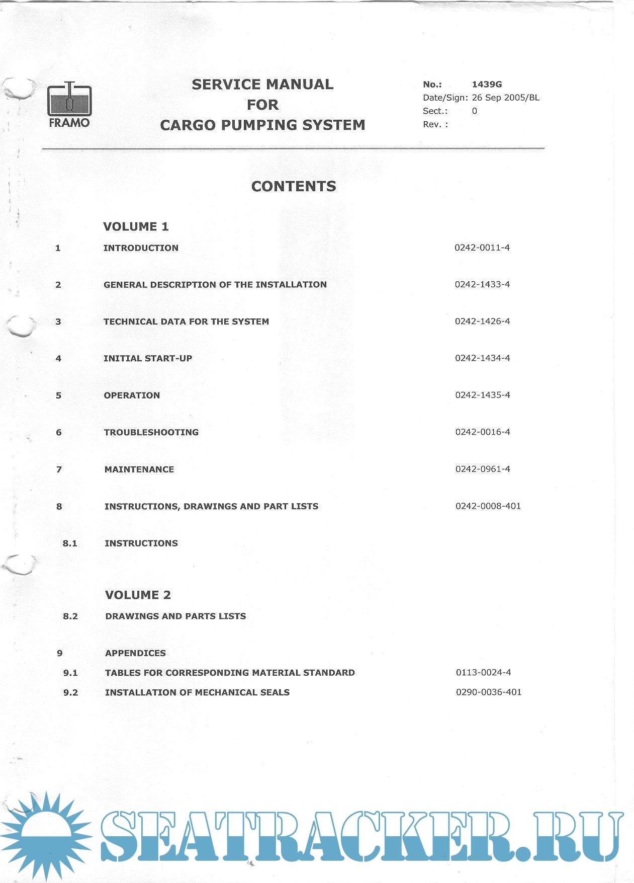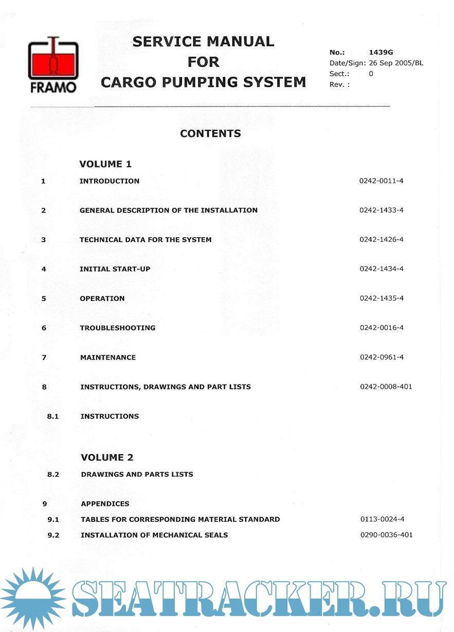 Year: 2005 Language: english Author: Frank Mohn Services AS Genre: Manual Publisher: Frank Mohn Services AS Edition: 2005 ISBN: 0242-011-4 Format: PDF Quality: Scanned pages Pages count: 312 Description: The Framo cargo pumping system is designed for a long life and reliable operation. To obtain this long life it is important that the system is operated according to the intentions. Further, the specified preventive maintenance must be carried out and the cleanliness level in the hydraulic system must be kept within acceptable limit. For maximum efficiency, operate as few power packs as possible, maintaining the required oil flow. Hydraulic system pressure should be kept to a minimum above the requirements to the highest consumer. Operation of the pumps to be within the capacity range. In case of low discharge pressure, observe for abnormal noise and vibration. Reduce the hydraulic pressure until stable condition is obtained. Only qualified personnel should operate the system, thus ensuring a safe and economic operation. Necessary training is owner's responsibility. Framo may offer several alternatives for technical training. System adjustments and service work should only be performed by a Framo service engineer, or by qualified members of ship’s crew. Overspeed (tripping) of the Framo cargo pumps cannot occur due to the speed control valve - STC (Speed Torque Controller). This valve is limiting the hydraulic oil flow to the pump's motor and consequently the maximum speed. The maximum oil flow is adjusted by Framo, and the adjustment screw is sealed. Overspeed is impossible as long as this seal is unbroken. If the seal is broken, warranty claims will be refused. Dry running situations may occur during stripping and tank cleaning operations. The bearings in the Framo cargo pump is lubricated and cooled by the hydraulic return oil, which means that the pump can run dry without any damage to the pump. However, unnecessary dry running should be avoided. The hydraulic return oil temperature is also a bearing monitoring system. An alarm will be activated if the hydraulic oil temperature exceeds 60°C. The Framo pumps can be run against closed cargo valve without any risk of eventual overheating as the wear ring loss is lead directly back to the tank. Additional info: I truly appreciate any "Thank U" given to me, if this release helps you.