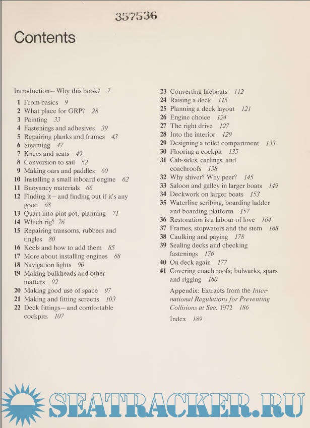 All the most common small- to medium-sized wooden boats and their respective problems are included — from rowboats and sailing dinghies to yachts, motor cruisers, and ex¬ ship’s lifeboats. Each chapter features a specific part of a boat’s construction and carefully explains how to perform the necessary work. There are chapters on installing inboard and outboard engines, adding keels, converting a dinghy for sail, designing and constructing the saloon and galley, fitting showers and toilets, caulking, and fitting cab sides, carlings, and coach roofs. A complete chapter gives advice on working with Glass Reinforced Plastic.