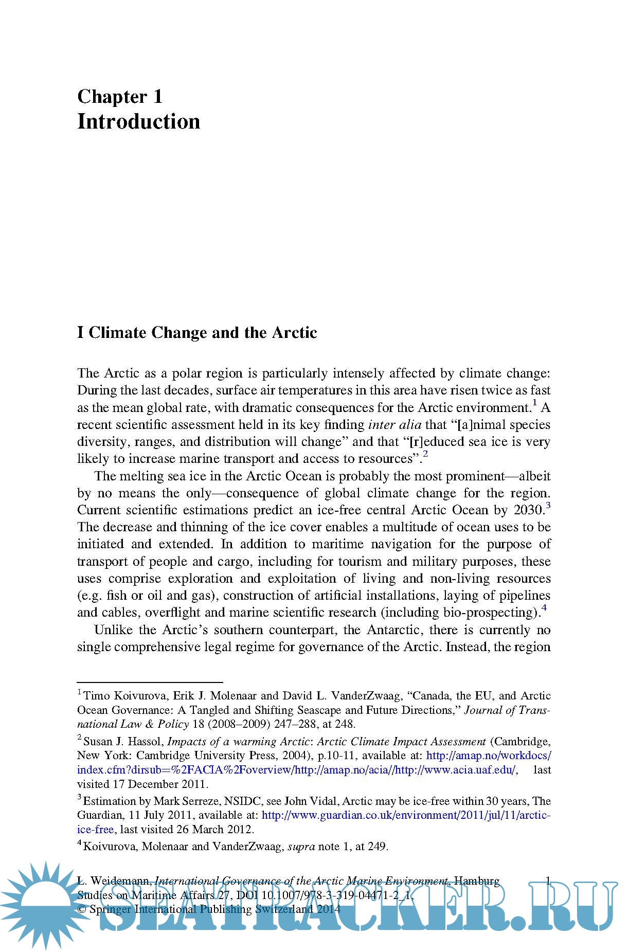 Description: The Arctic is particularly affected by climate change; over the past few decades, temperatures in this area have risen twice as fast as the mean global rate. The most prominent effect of global climate change in the region is the melting sea ice in the Arctic Ocean, which enables a multitude of ocean uses to be initiated and extended, such as shipping, fishing and oil and gas extraction. Unlike in the Antarctic, there is currently no single comprehensive legal regime for governance of the Arctic. Instead, the region is regulated by a patchwork of international treaties, above all the United Nations Convention on the Law of the Sea (UNCLOS), various regional and sub-regional agreements, national laws and soft-law agreements. This treatise provides an evaluation of the governance regime that regulates the use of the Arctic marine environment and its readiness to protect these fragile ecosystems in light of the consequences of climate change.