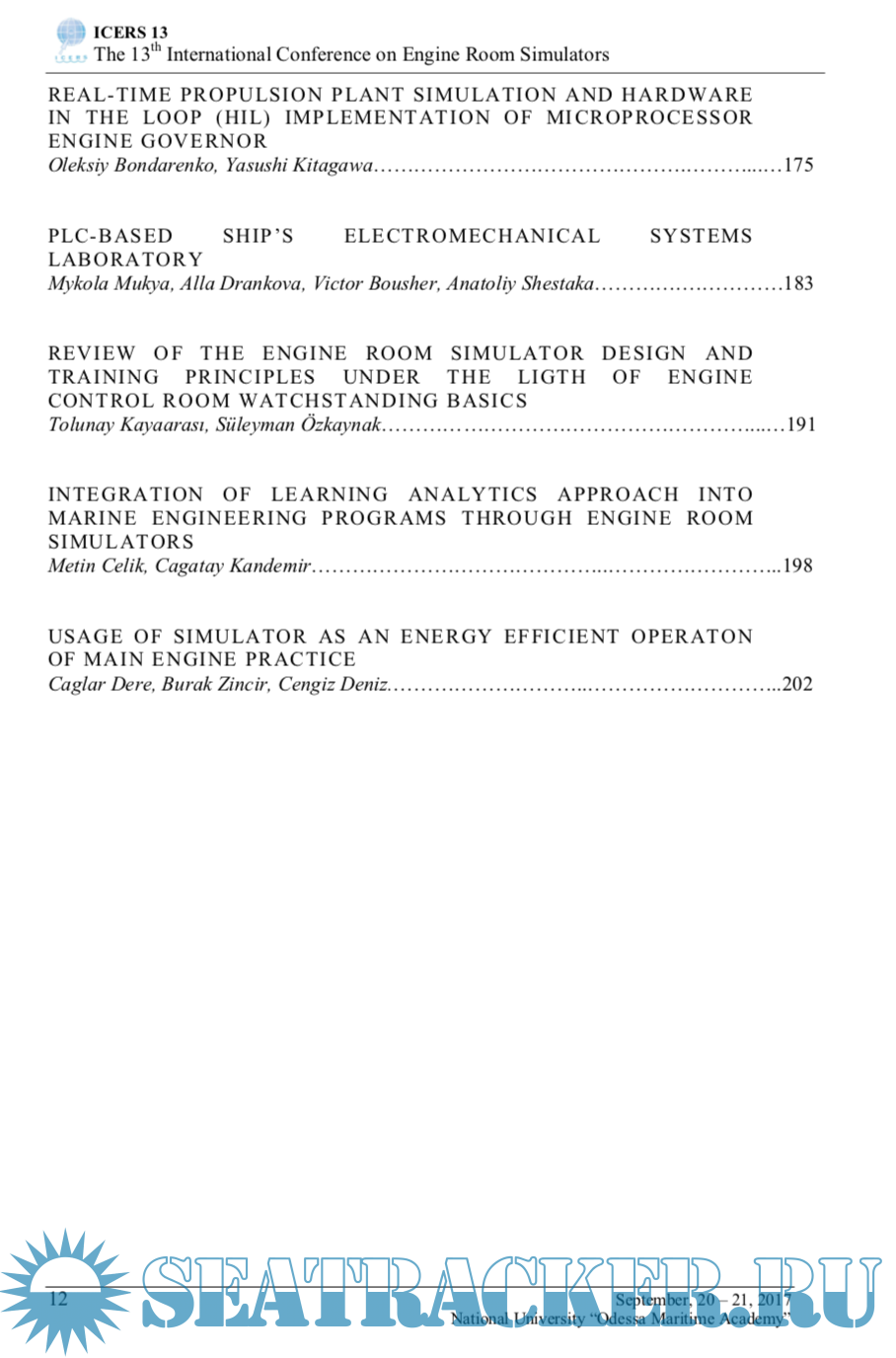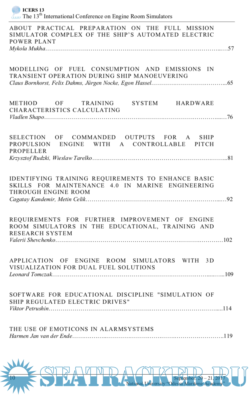 Description: Holding of ICERS13 provides a unique opportunity to exchange experience among professionals involved in production and operation of marine engines, mechanisms and systems, creation and use of engine room simulators in marine engineers training.