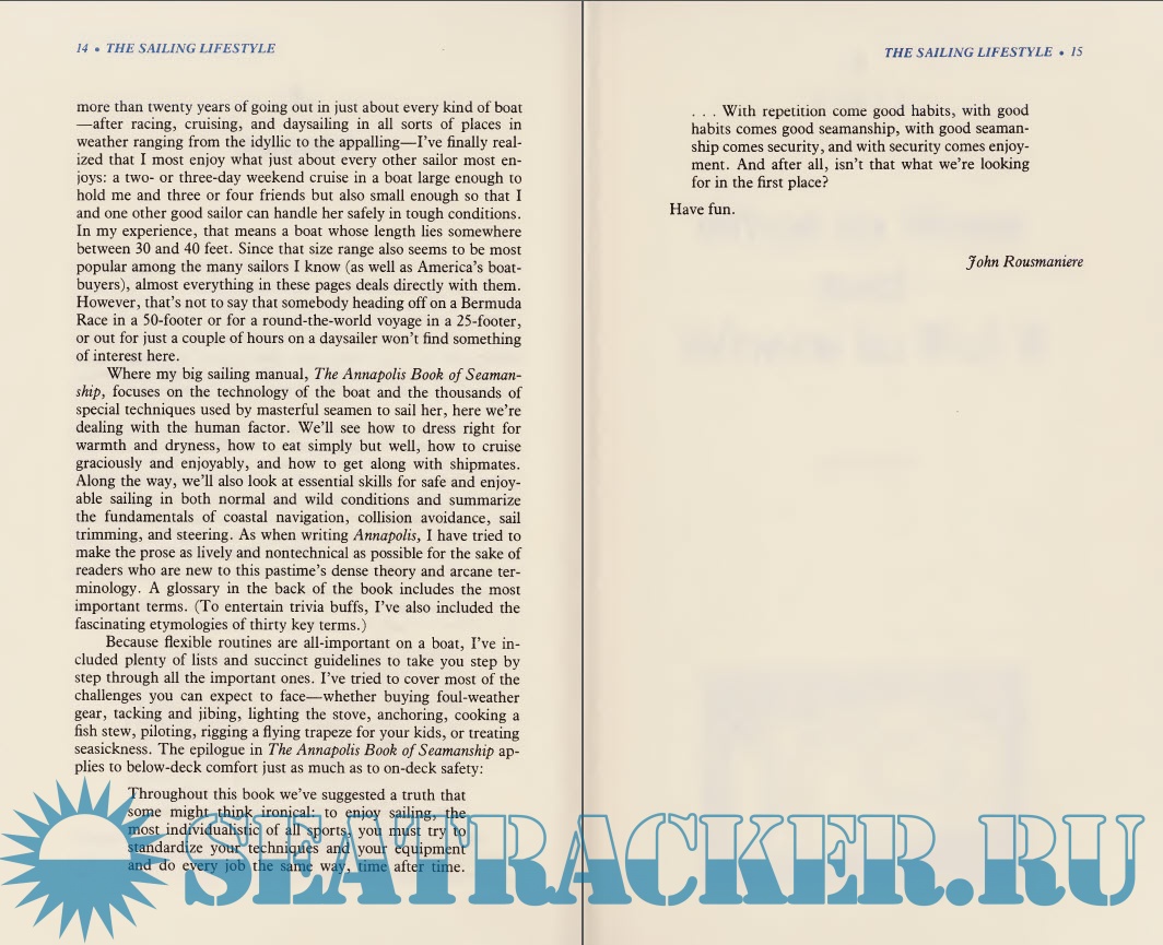 Year: 1985 Language: english Author: John Rousmaniere Genre: Handbook Publisher: Simon & Schuster Edition: First ISBN: 978-0671508876 Format: PDF Quality: Scanned pages Pages count: 326 Description: Surveys the basic sailing equipment, explains how to sail a boat, and offers tips on living comfortably on a sailboat