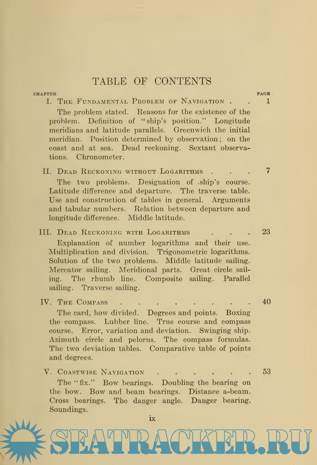Year: 1918 Language: english Author: Harold Jacoby Genre: Handbook Publisher: The McMillan Company Edition: 2nd Format: PDF Quality: Scanned pages Pages count: 376 Description: The present volume was undertaken with certain very definite aims. In the first place, it is intended to be complete in itself, so that it should be possible to navigate a ship in any ocean not very near the north or south pole without other books or tabular works, excepting only the nautical almanac for the year in which the voyage is made. To attain this end without unduly extending the size of the volume, certain essential nautical tables have been abridged ; but all are given in sufficiently extended form to permit of actual navigation with their aid ; and they are especially suitable for beginners, who can here attain the necessary knowledge with less effort than would be necessary with more bulky volumes. In cases where very extended tables are convenient, they are mentioned in the text. In the second place, the author has not assumed that the reader possesses formal mathematical and astronomical knowledge, or desires to possess such knowledge. Whenever methods of navigation require for their demonstration an understanding of spherical trigonometry, or some other branch of formal mathematical science, such demonstrations have been replaced with incomplete or ''outline " demonstrations designed for the non-mathematical reader. Practical methods are fully explained ; and an attempt has always been made so to word the explanations that the reader, even the beginner, will understand his problem, and will know what he is doing, and why he does it.