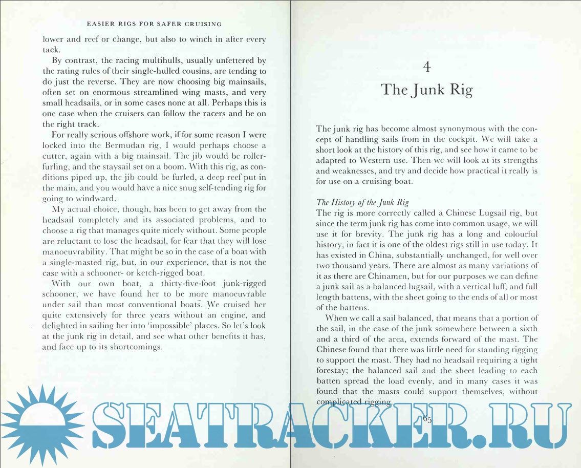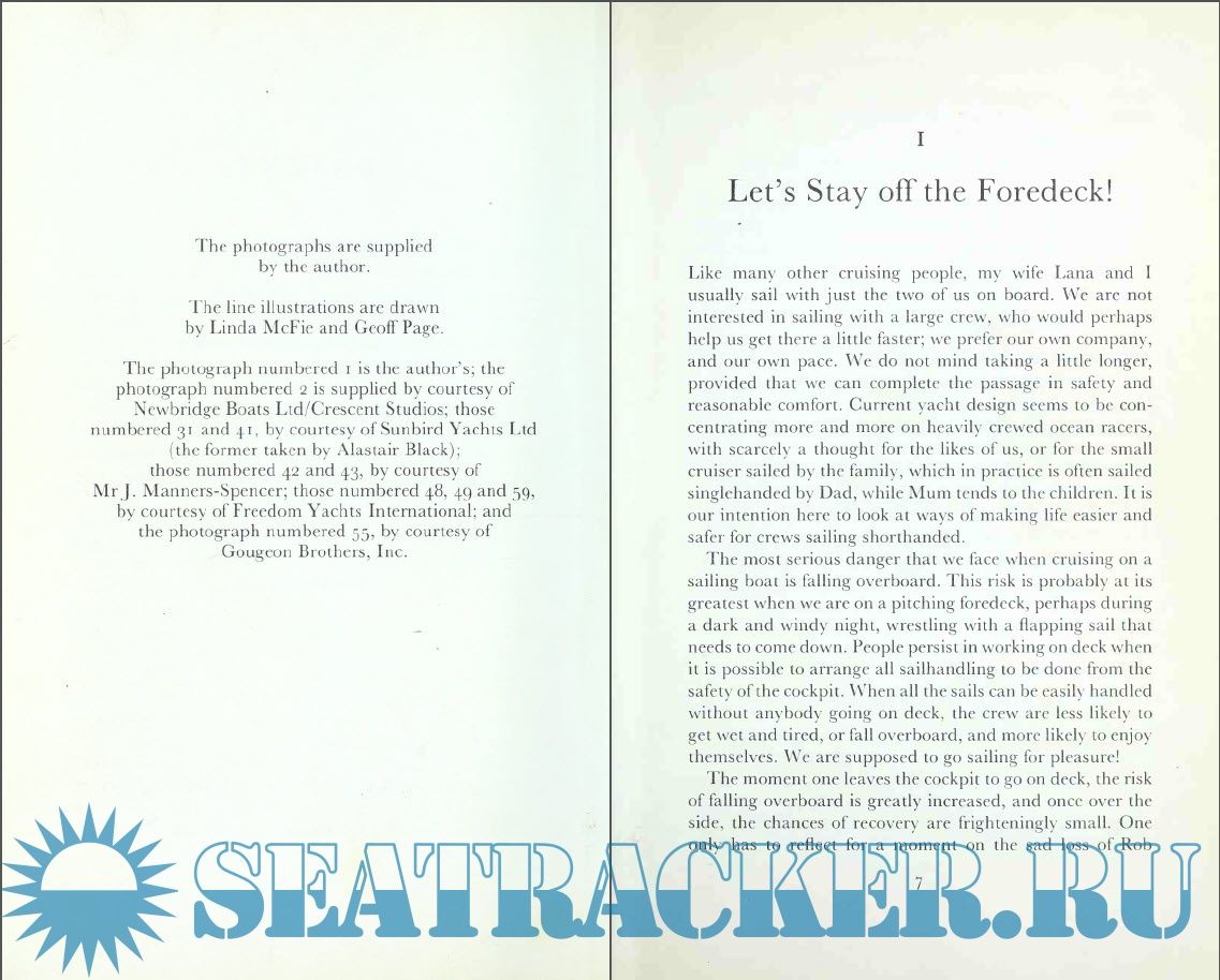 Year: 1986 Language: english Author: John Campbell Genre: Handbook Publisher: MOLLIS & CARTER Edition: First ISBN: 0-370-30698-8 Format: PDF Quality: Scanned pages Pages count: 161 Description: The most serious danger that we face when cruising on a sailing boat is falling overboard. This risk is probably at its greatest when we are on a pitching foredeck, perhaps during a dark and windy night, wrestling with a flapping sail that needs to come down. People persist in working on deck when it is possible to arrange all sailhandling to be done from the safety of the cockpit. When all the sails can be easily handled without anybody going on deck, the crew are less likely to get wet and tired, or fall overboard, and more likely to enjoy themselves. We are supposed to go sailing for pleasure! The moment one leaves the cockpit to go on deck, the risk of falling overboard is greatly increased, and once over the side, the chances of recovery are frighteningly small. One piece of equipment that might well help in this type of situation would be some form of self steering. This used to be considered as gear required only for transocean passages, yet some form of self steering can make life so much easier aboard any boat, even one undertaking only modest coastal passages.