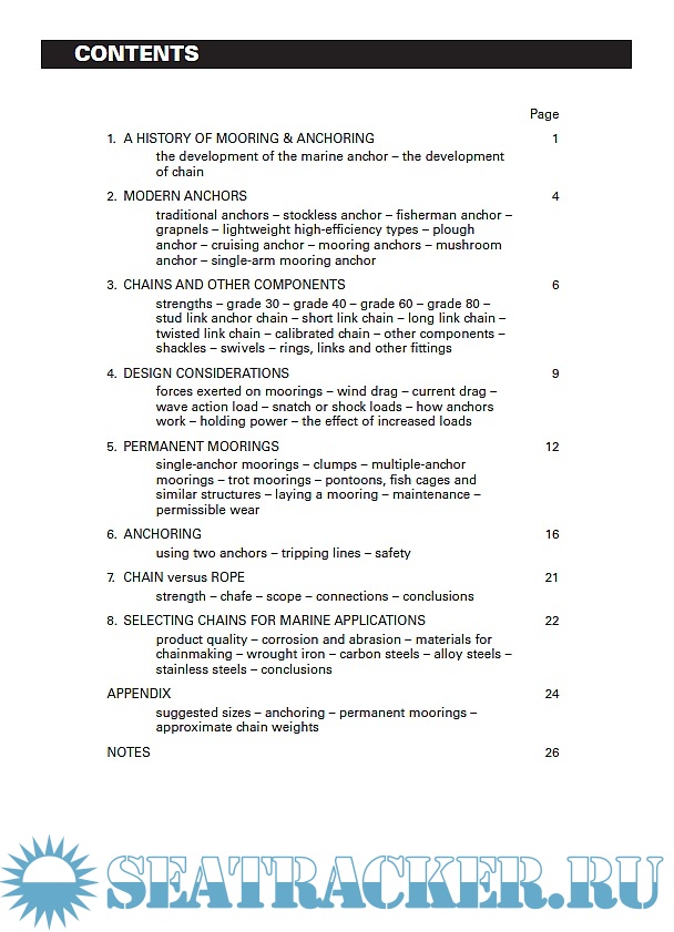 Description: The book explains the basic principles of anchoring and mooring. It has been produced in an attempt to guide the reader through the various stages of design, selection, installation and maintenance. It contains practical information for the owner and contractor alike, as well as drawings and useful guidance tables about type and size of the anchor, chain proof load and weight, and a brief resume on materials for chainmaking.