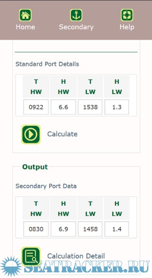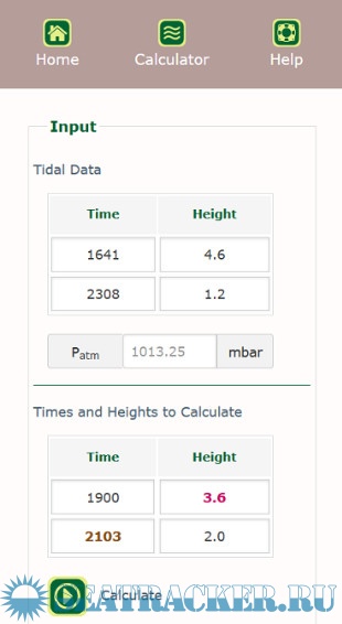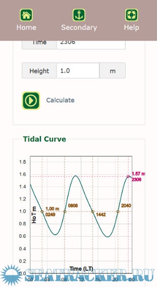 The calculator let's you predict the height of the tide at any given moment or the moment for which the tide reaches a certain level, for standard and secondary ports and for diurnal and semi-diurnal tides. Detailed calculation steps are shown where possible, like rule of twelfth analysis.